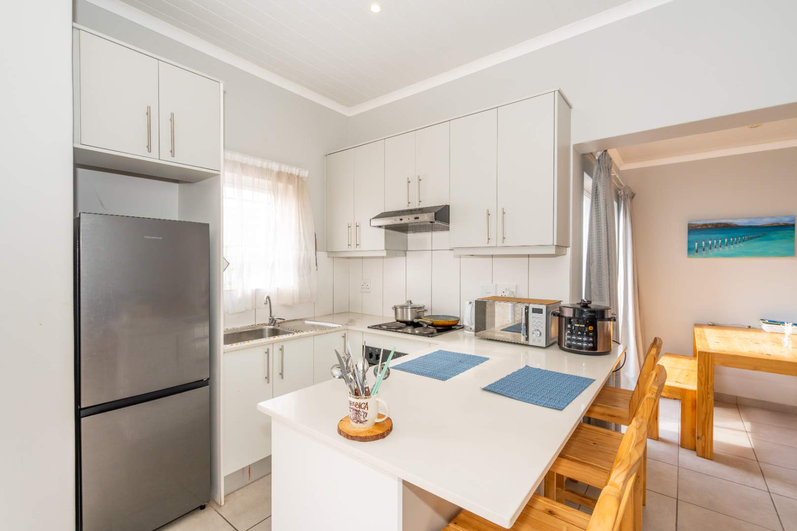 The kitchen is equipped with electric hobs and oven, double sink, ample cupboards, and a breakfast counter.
