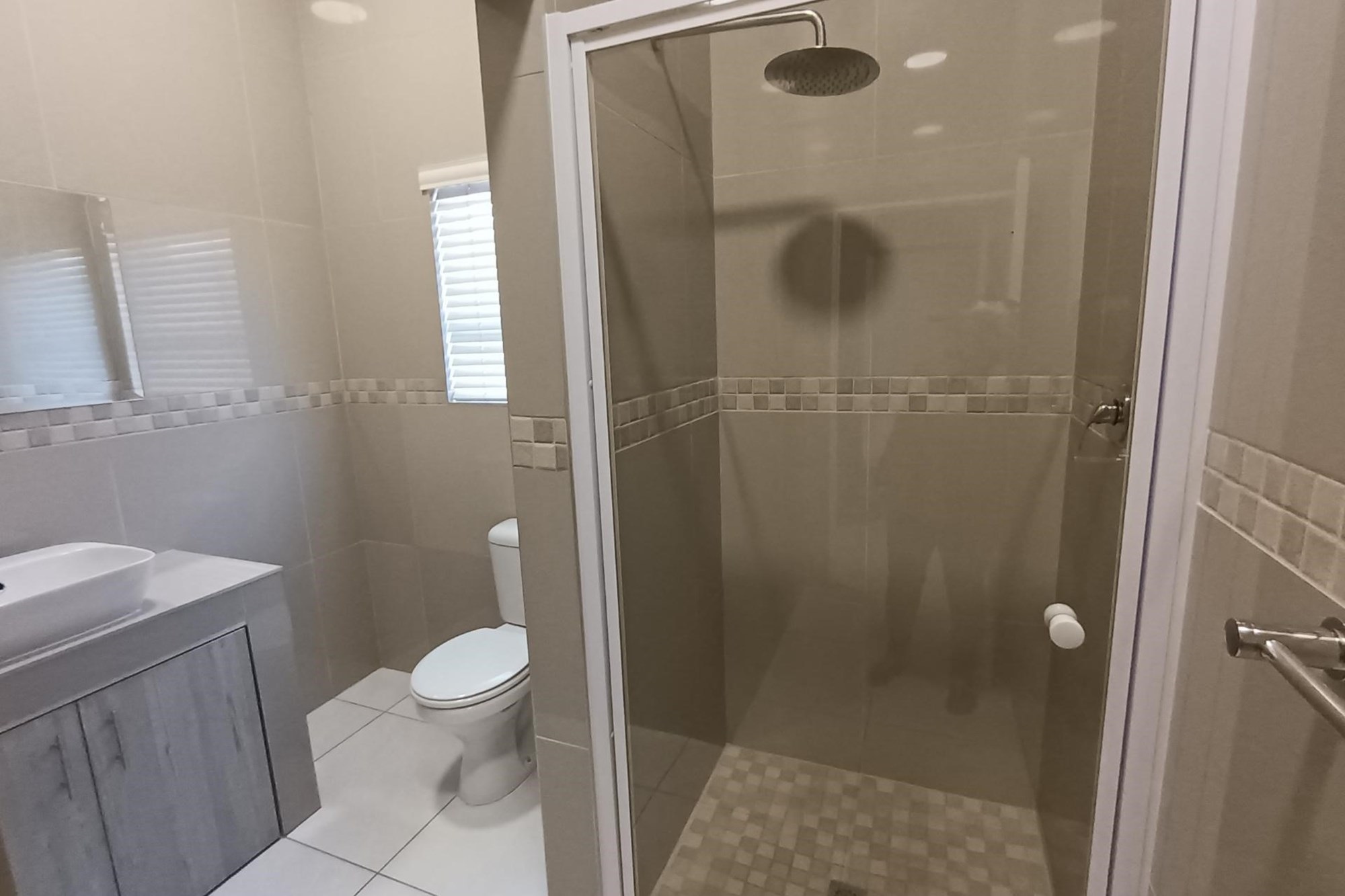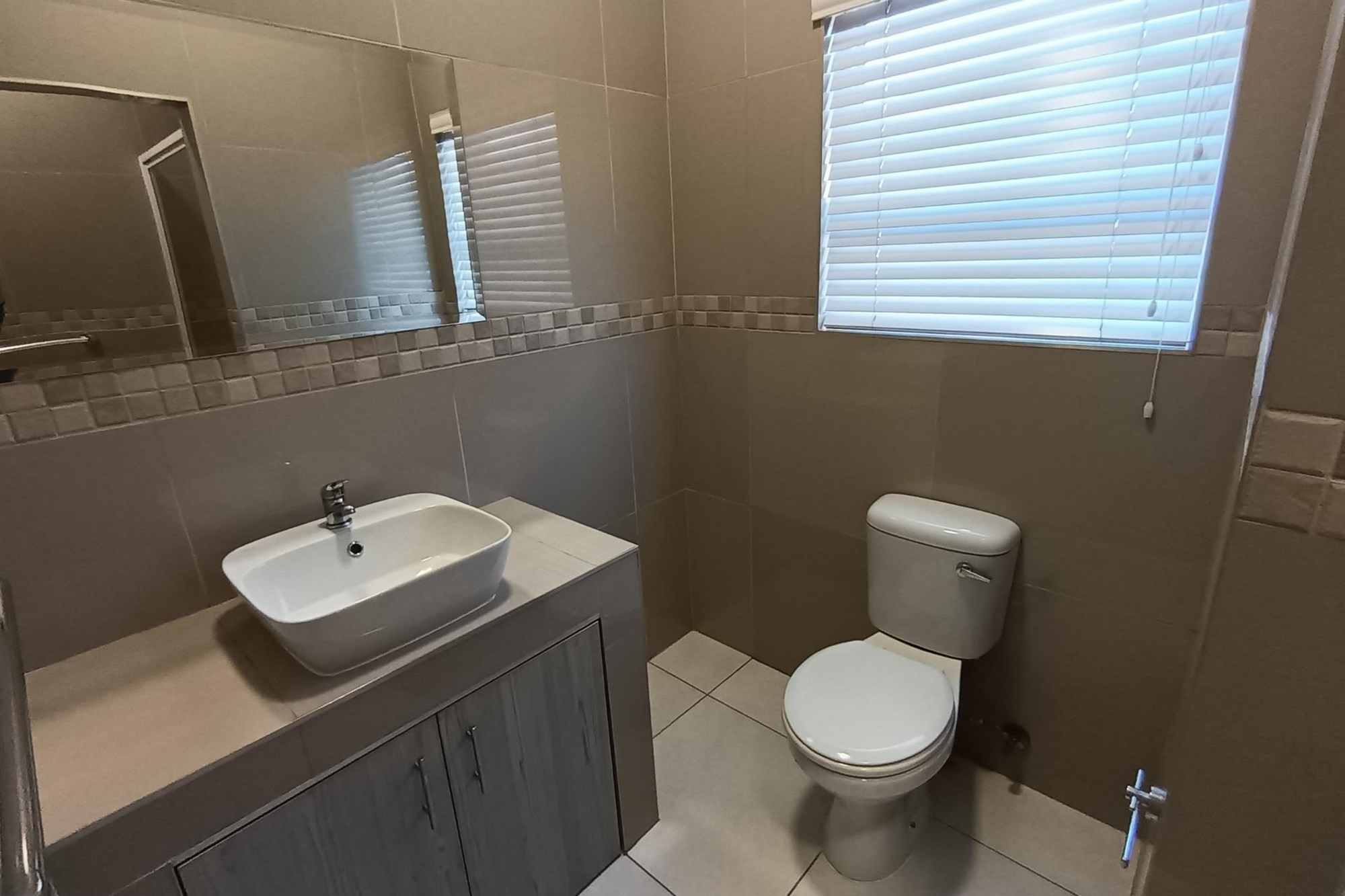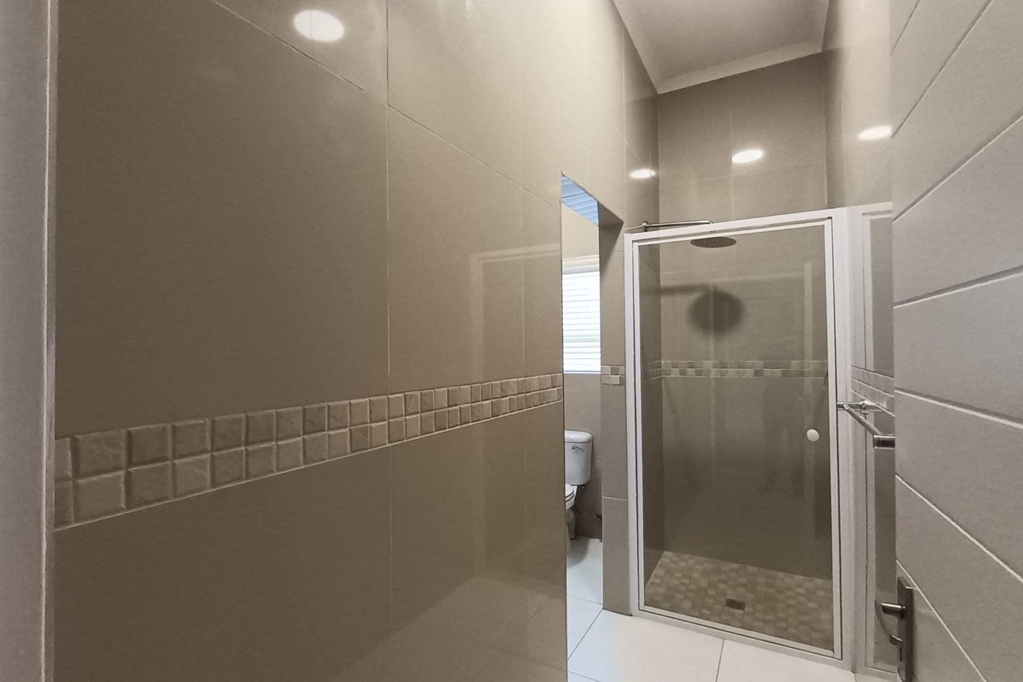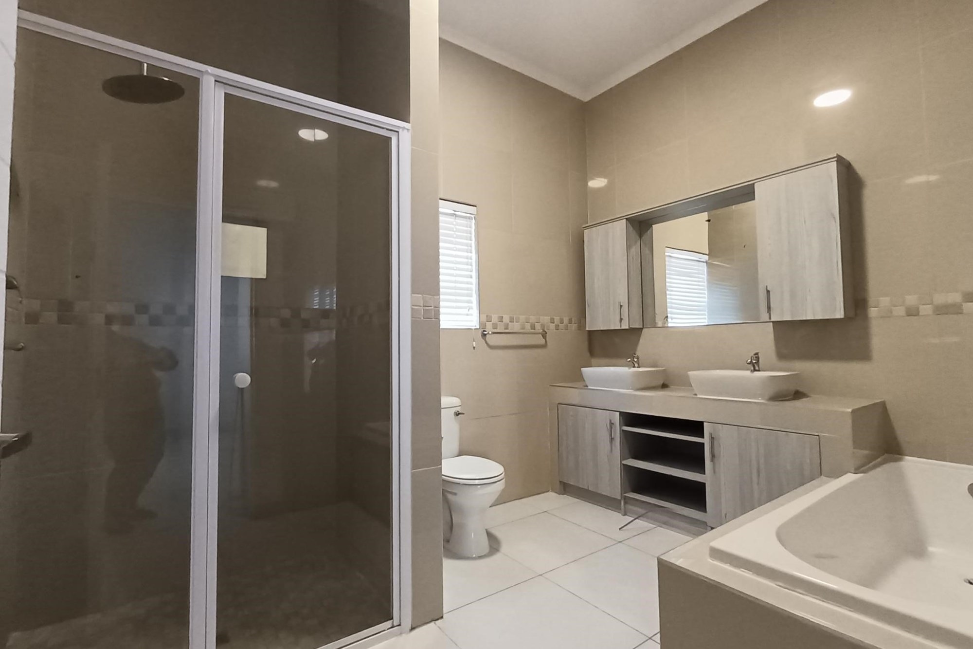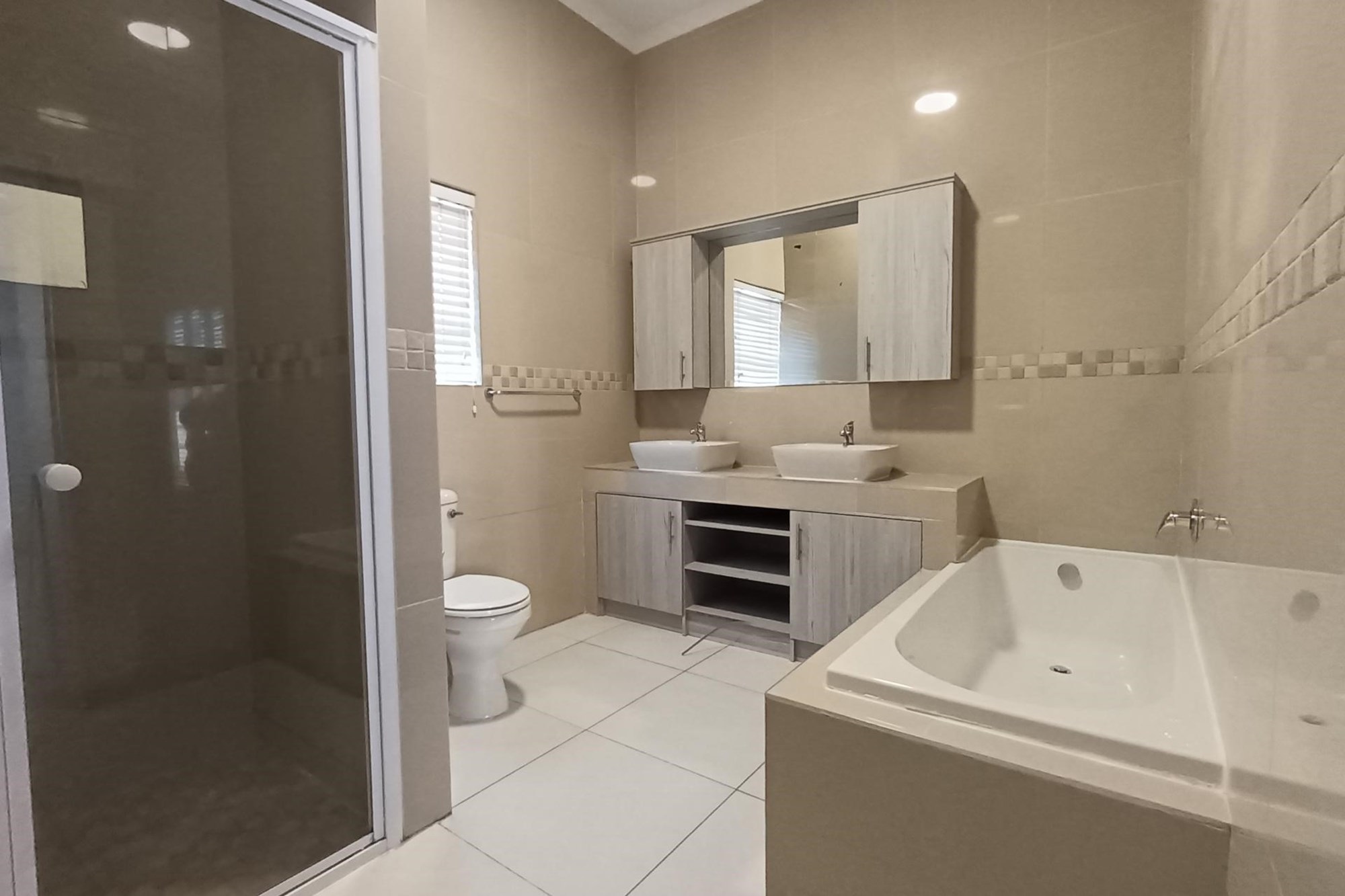 The guest bedrooms are generously sized, each with ample cupboard space, and share a modern, fully equipped bathroom. The spacious main bedroom boasts a luxurious en-suite bathroom, perfect for relaxing in style.
