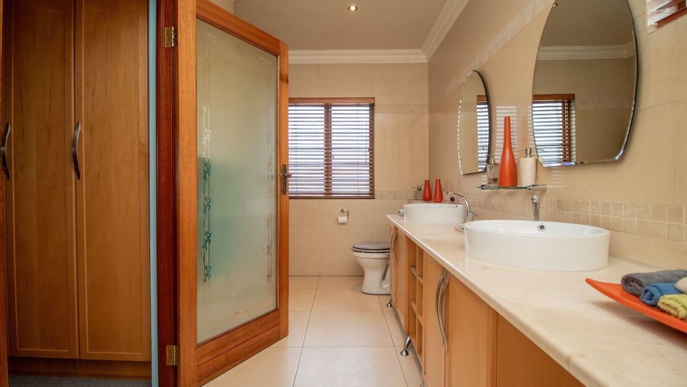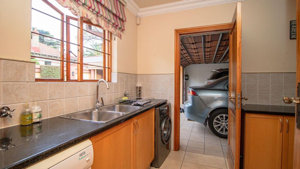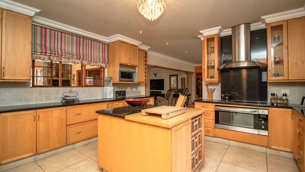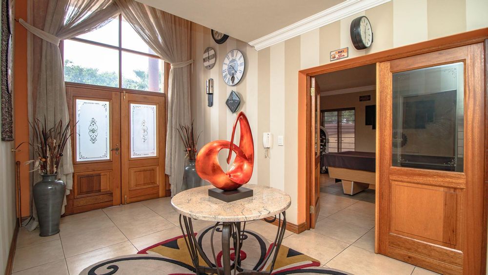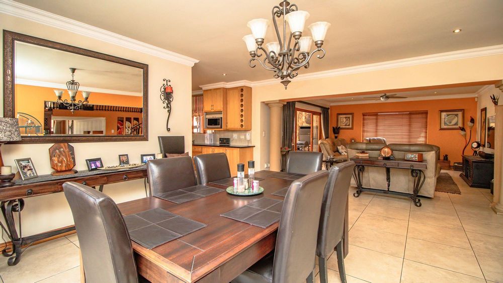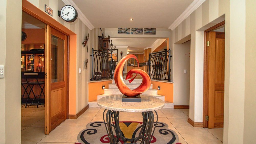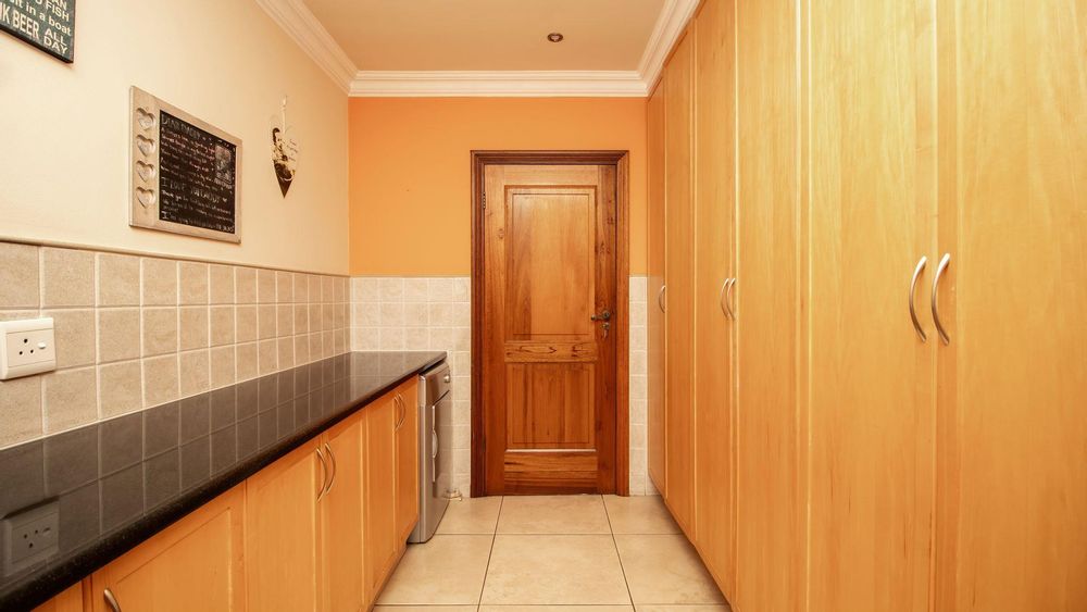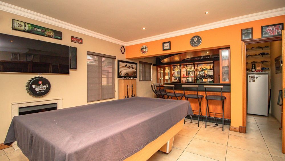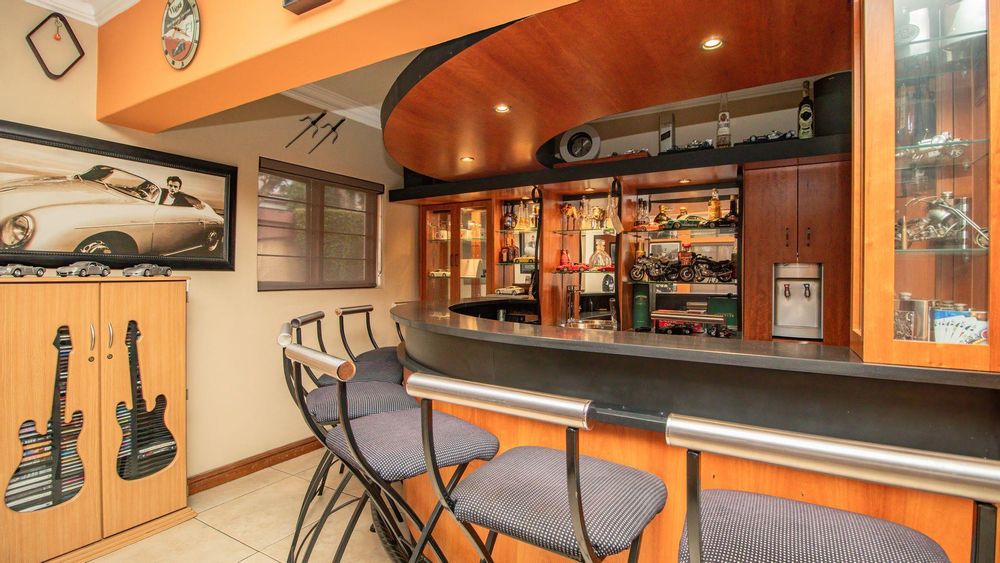 The ground floor offers a seamless blend of entertainment and living spaces. The impressive bar and entertainment room provide the perfect setting for hosting guests, while the open-plan kitchen, complete with a scullery, flows effortlessly into the dining area and lounge. The living spaces are enhanced by sliding doors that open onto a well-appointed patio, featuring a built-in braai, overlooking a sparkling pool and manicured garden—ideal for enjoying the tranquil outdoors.