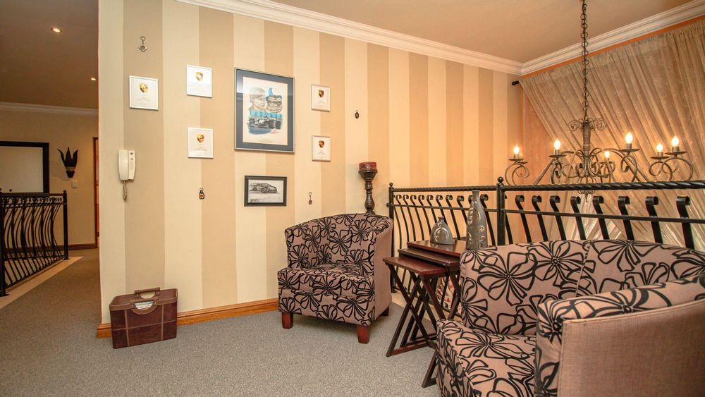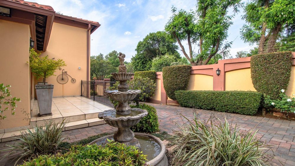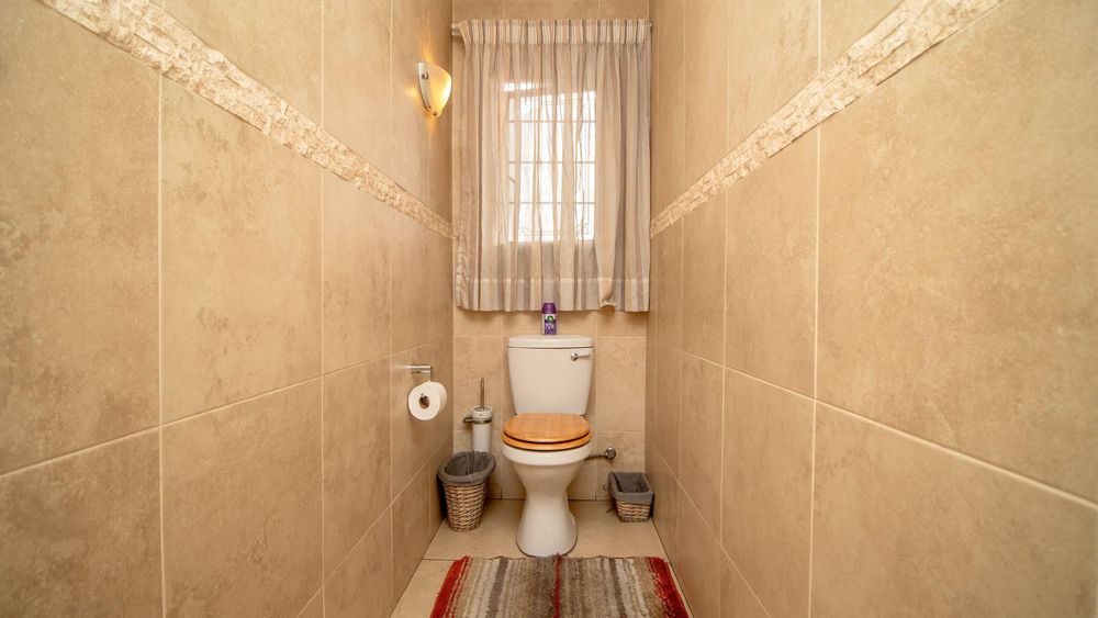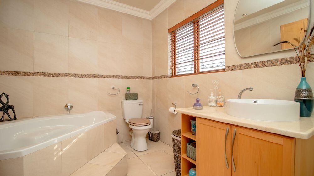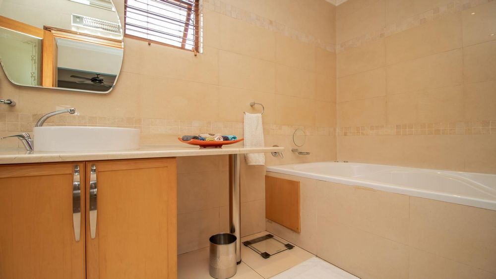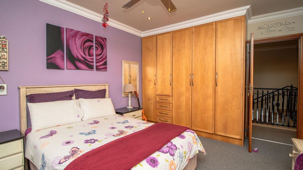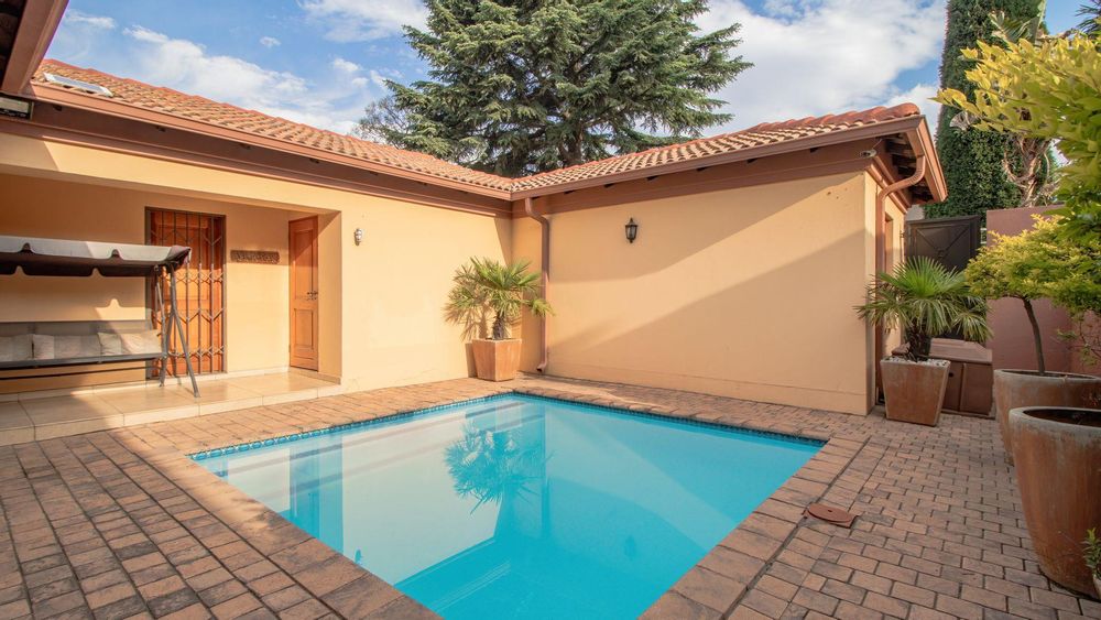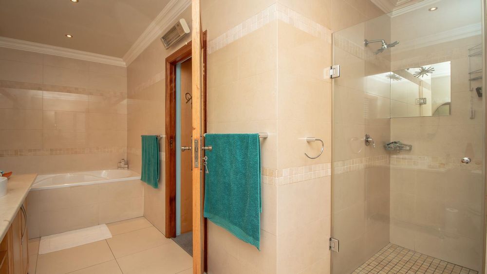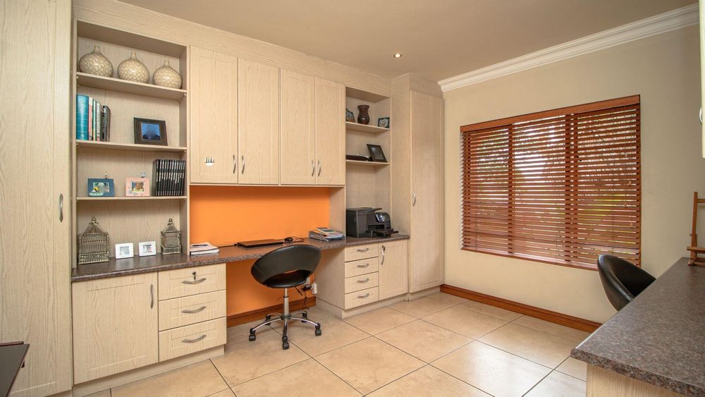 The ground floor offers a seamless blend of entertainment and living spaces. The impressive bar and entertainment room provide the perfect setting for hosting guests, while the open-plan kitchen, complete with a scullery, flows effortlessly into the dining area and lounge. The living spaces are enhanced by sliding doors that open onto a well-appointed patio, featuring a built-in braai, overlooking a sparkling pool and manicured garden—ideal for enjoying the tranquil outdoors.