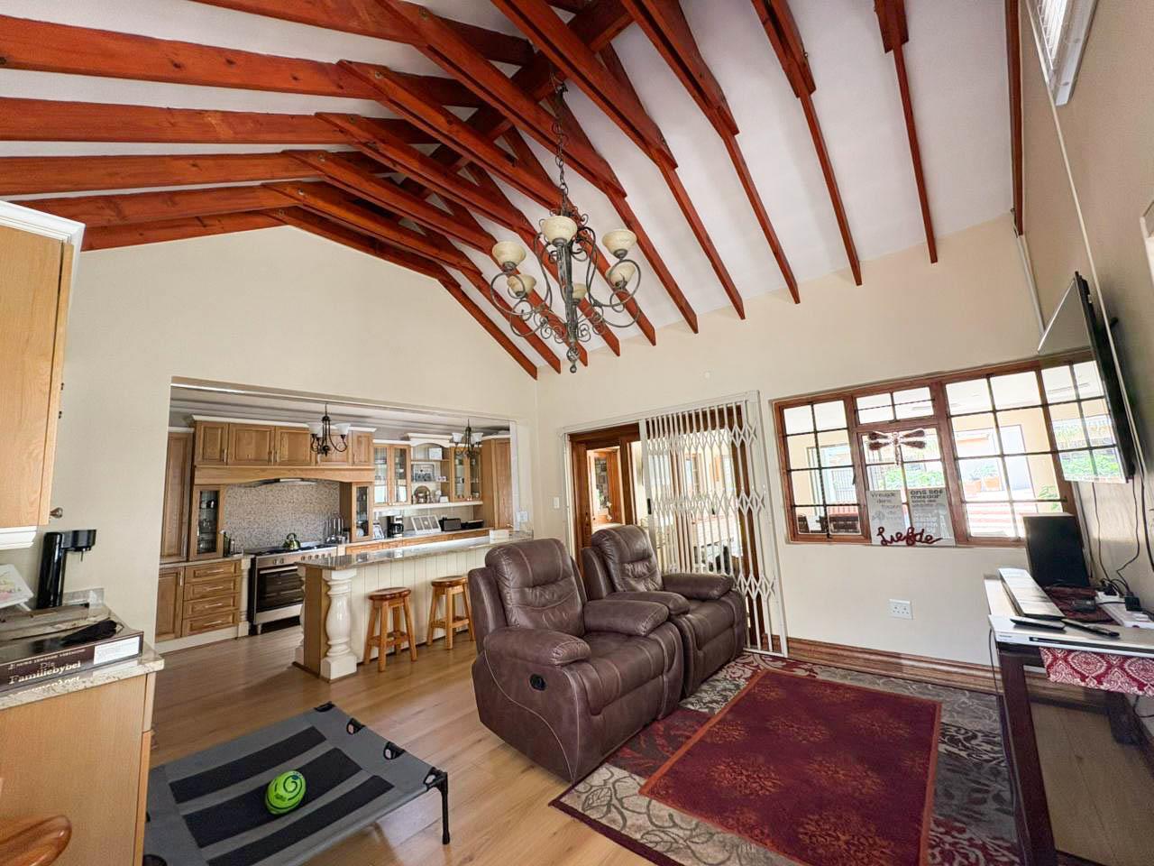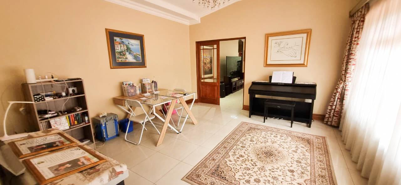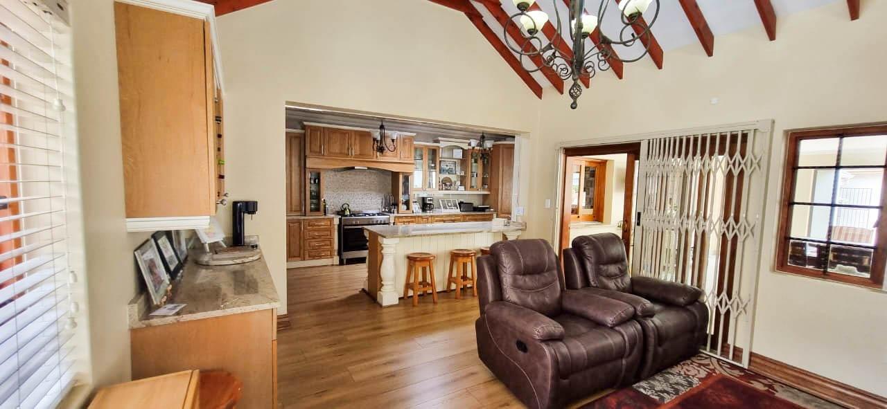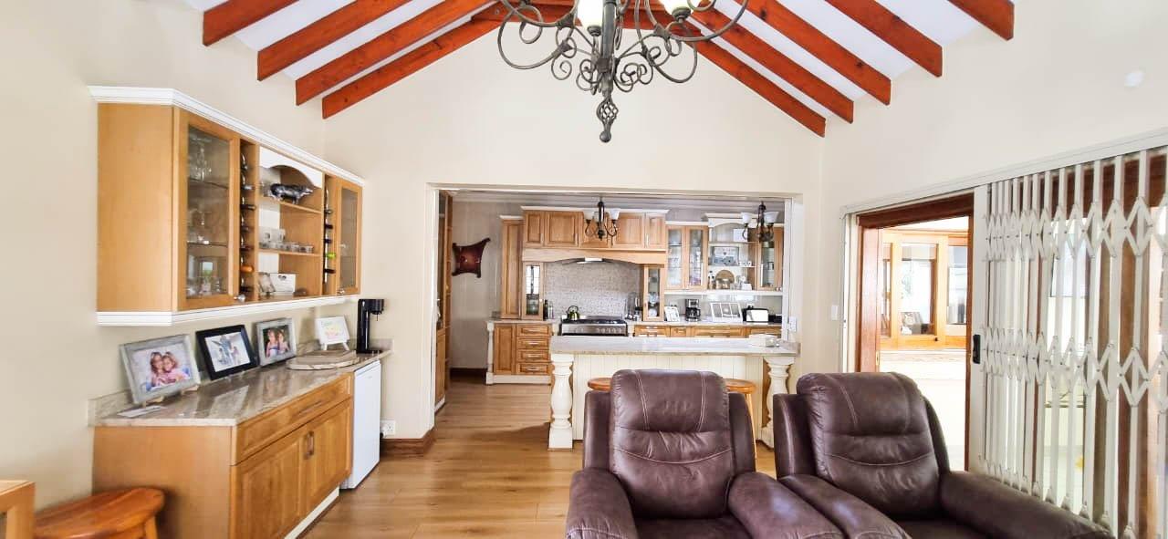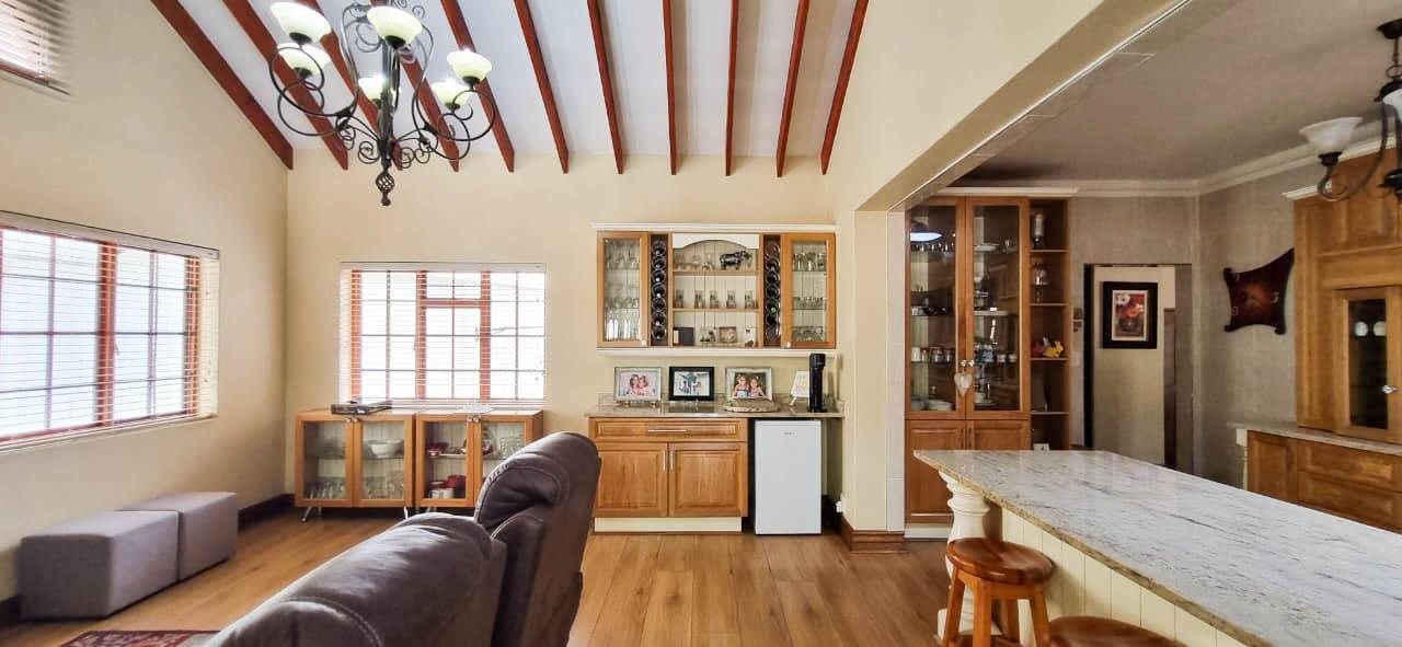 Living and entertaining spaces are truly impressive. The home offers two elegant lounges, a separate dining room, and a spacious TV room open-plan to the kitchen. This TV room flows seamlessly onto a covered entertainer’s patio with built-in braai, overlooking the sparkling swimming pool with fitted cover and expansive outdoor areas—perfect for hosting family and friends in all seasons.