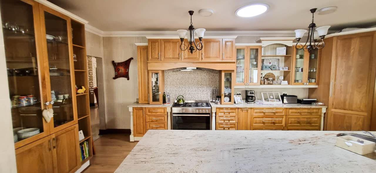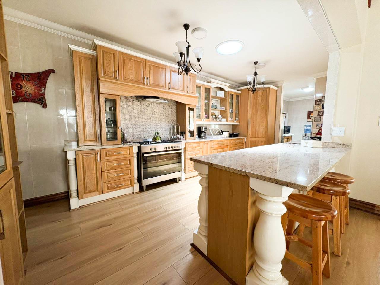 The luxurious kitchen is beautifully finished with wooden cabinetry, stone countertops, a Bosch 5-plate gas hob, electric oven, and single counter basin, supported by a separate scullery and laundry for practical, effortless living. Cottage-style windows throughout add timeless charm and warmth to the home.