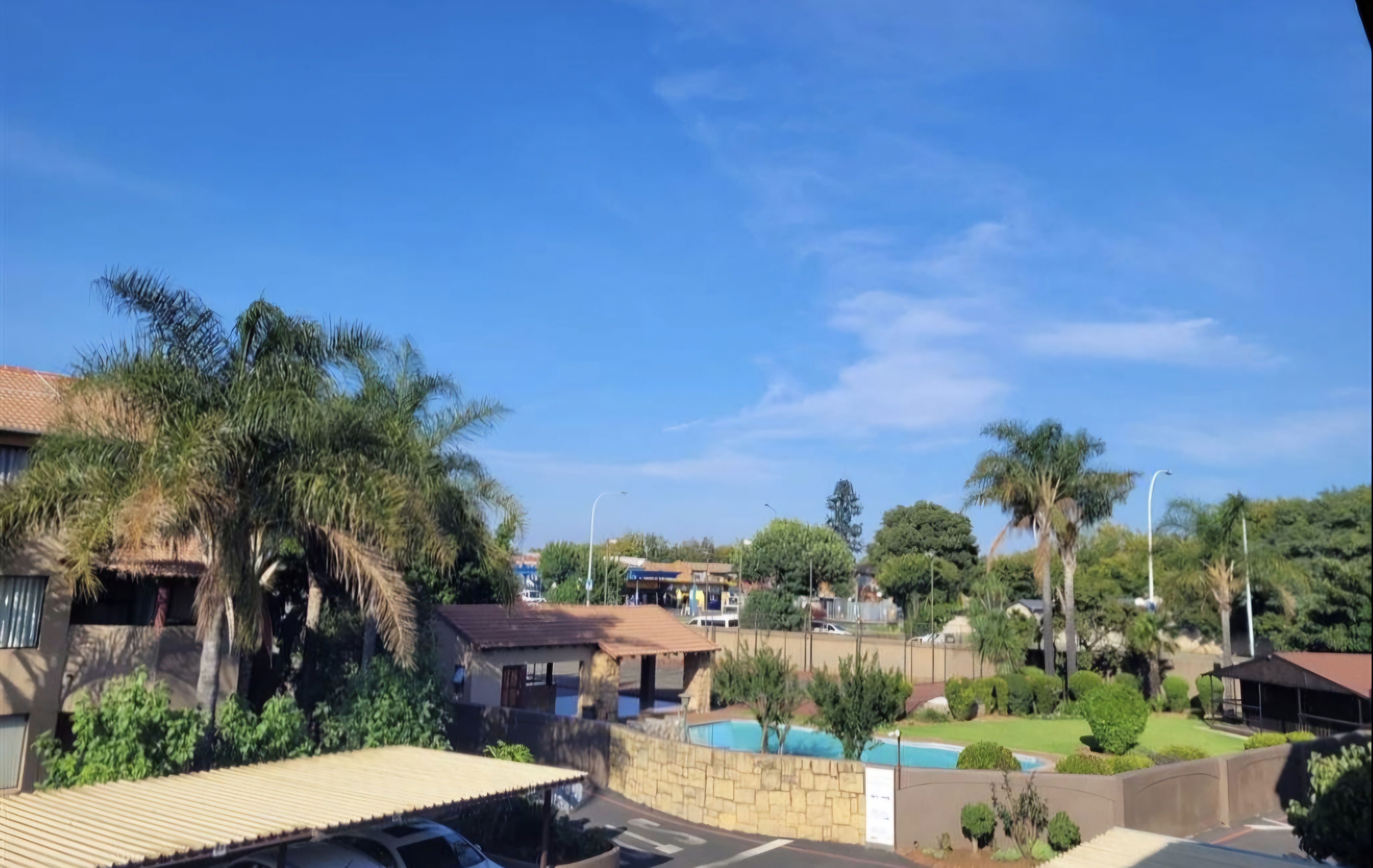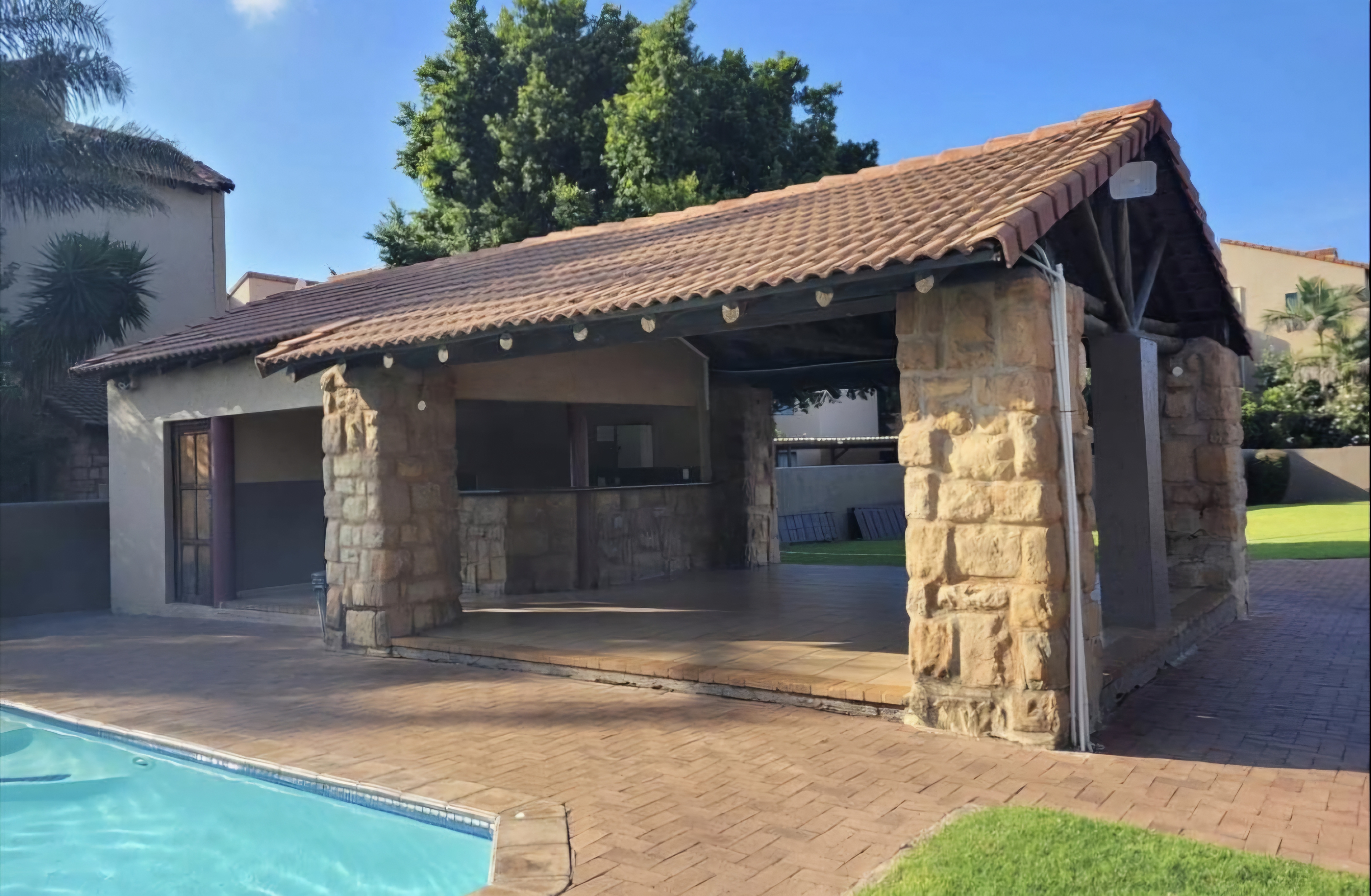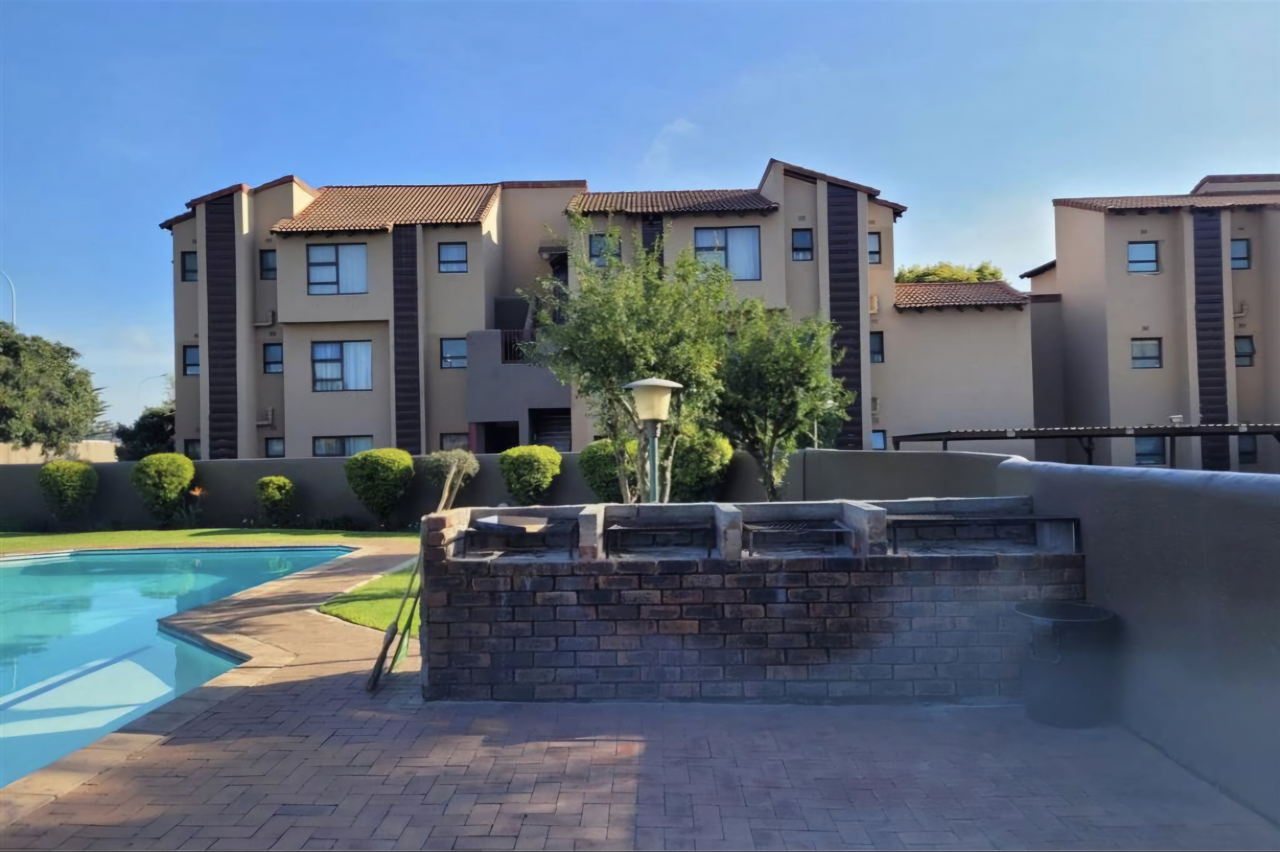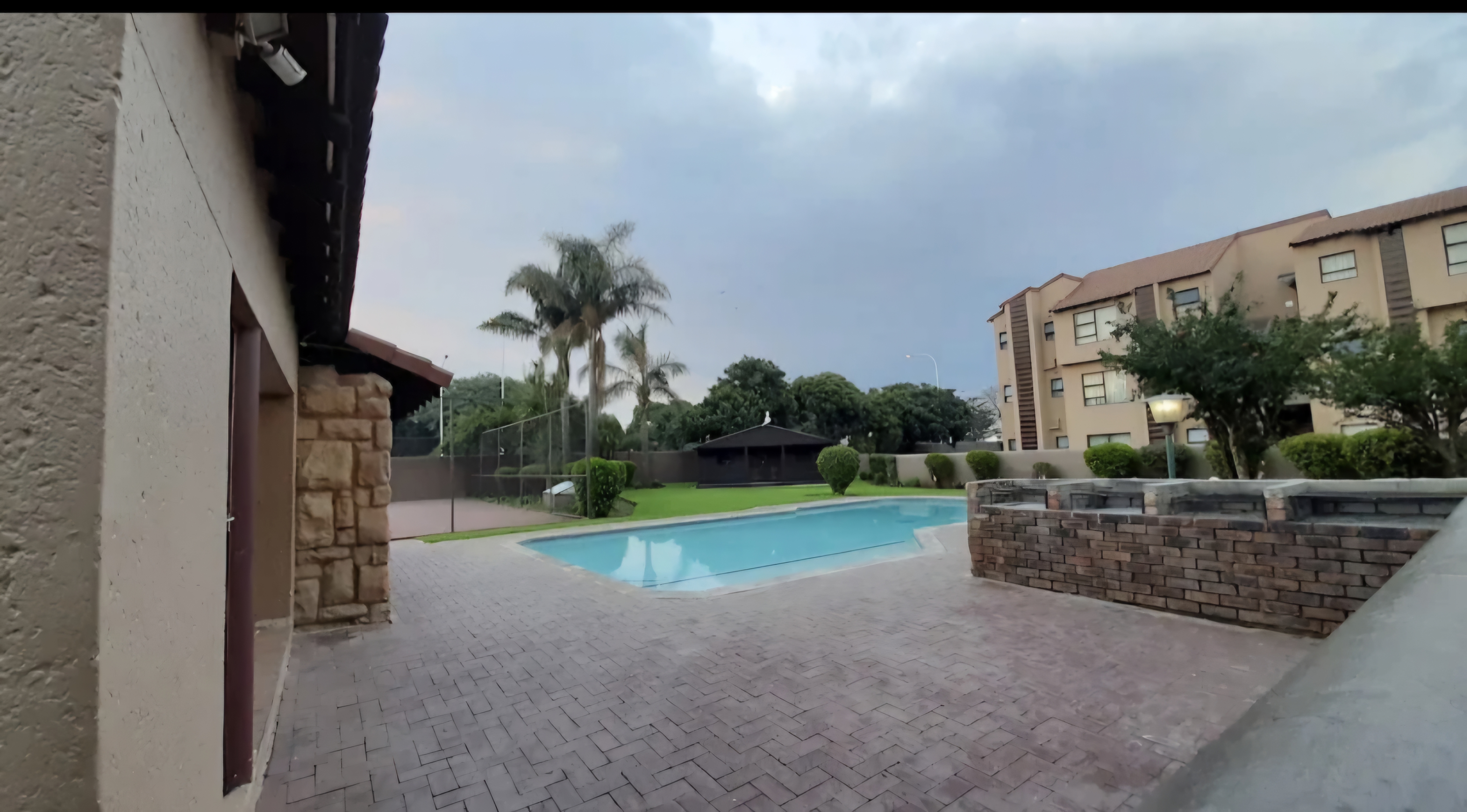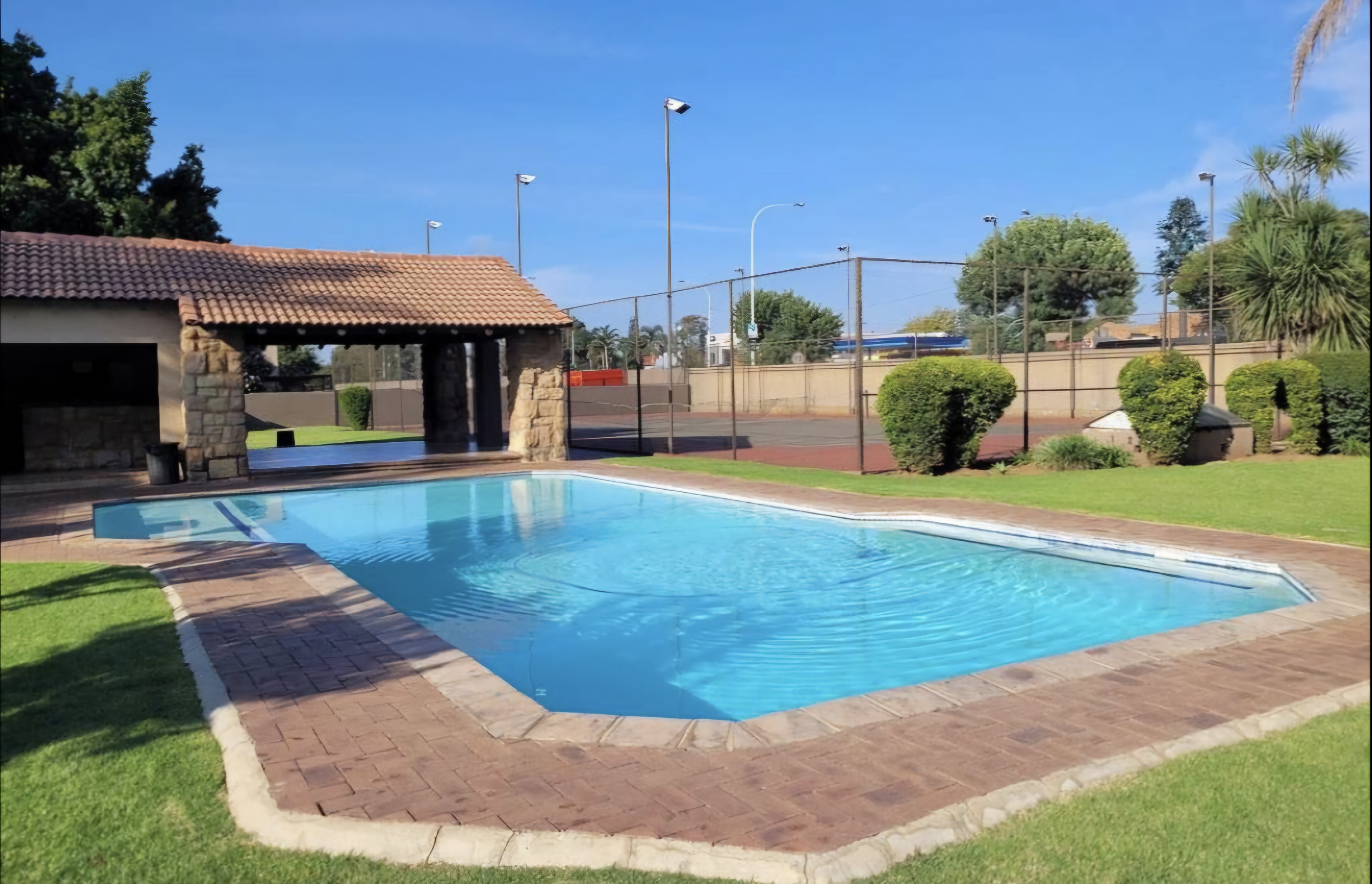 Sparkling communal pool and tennis court for leisure and recreation