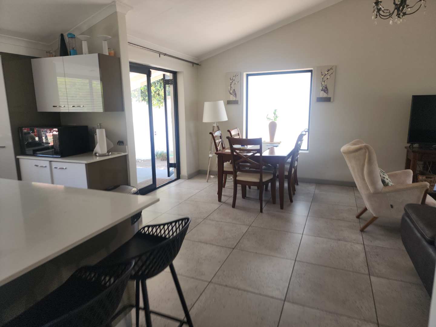 It offers a contemporary design and layout, with modern fixtures, fittings, flooring and aluminum windows and doors throughout. It features spacious open plan living areas with great flow via a small patio to the rear garden, with its covered entertainment area including a built-in braai and a small manageable pool.
