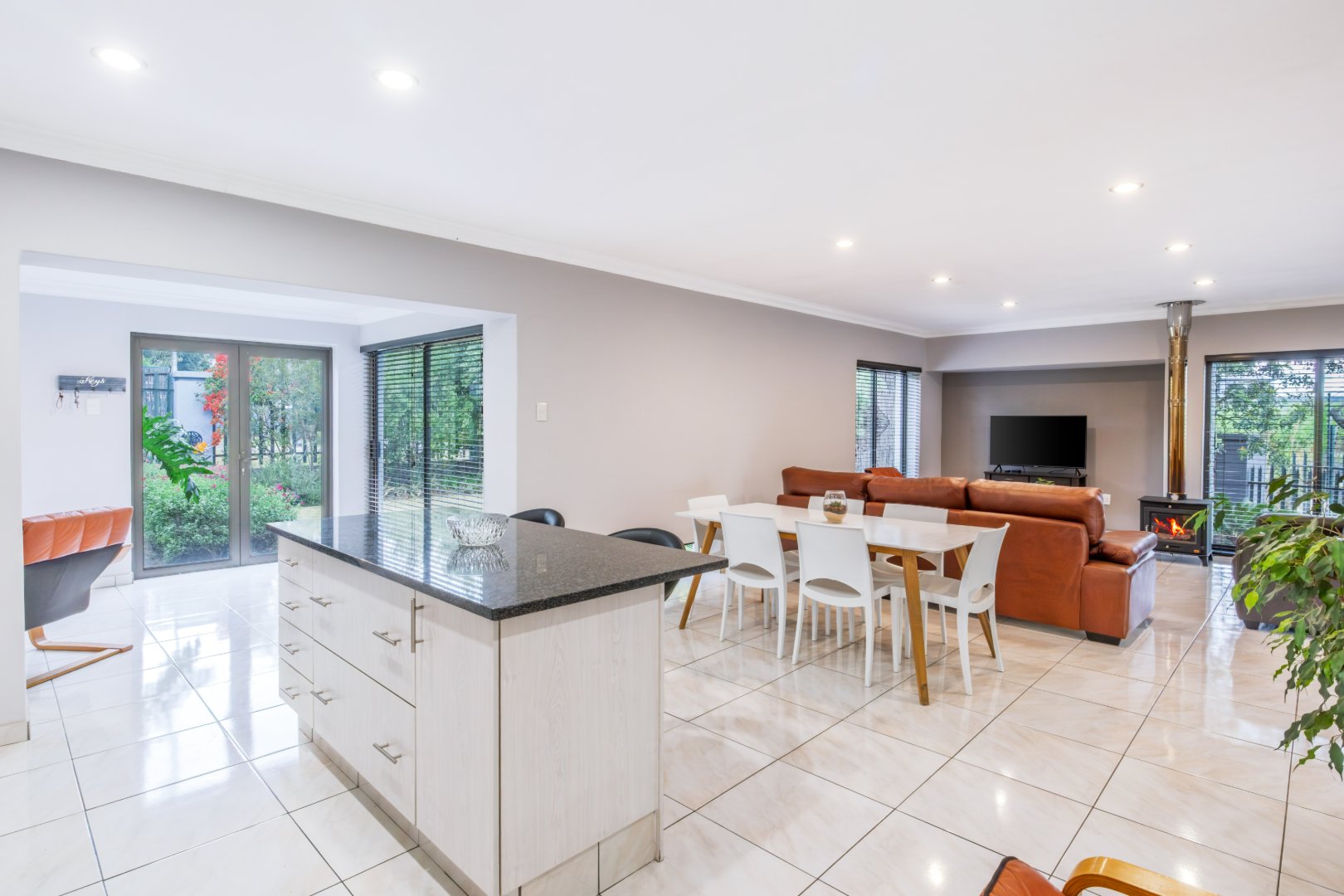 Spacious open-plan living area with fireplace, flowing seamlessly onto a generous patio with built-in braai – perfect for entertaining.