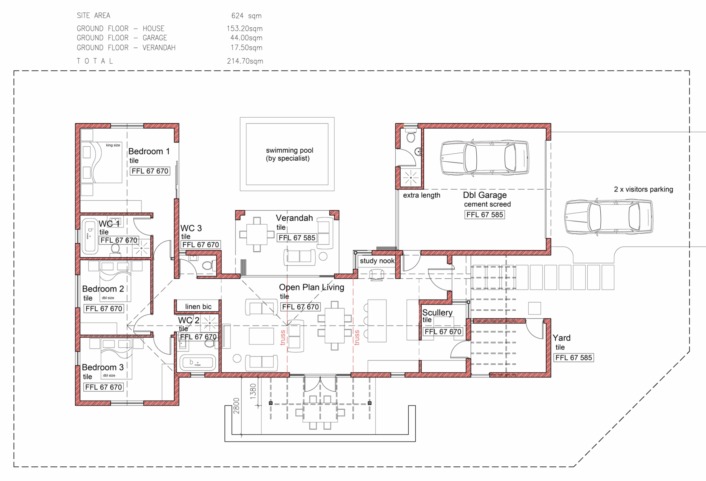 The home features an open plan living and dining area leading through double doors to a covered patio and an adjoining open patio, creating a seamless indoor outdoor flow perfect for entertaining. The kitchen includes a scullery with an enclosed drying yard, and a well positioned study nook adds functional workspace. The main bedroom includes an en-suite bathroom, with two additional bedrooms sharing a full bathroom. A guest bathroom and a double garage complete the layout.