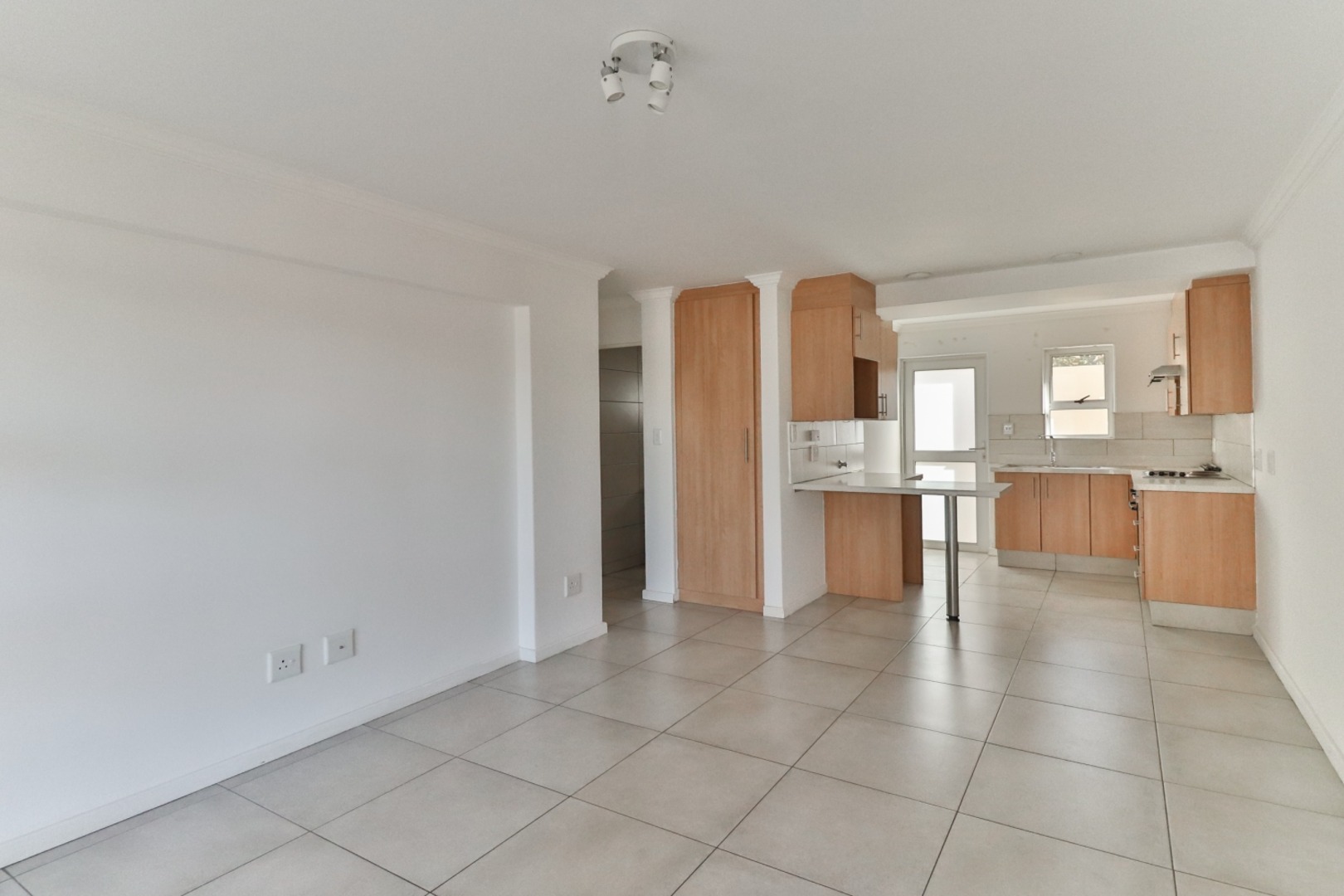 The kitchen is well-equipped with ample built-in cupboards, a stove, and a sink, with provisions for a washing machine or dishwasher.