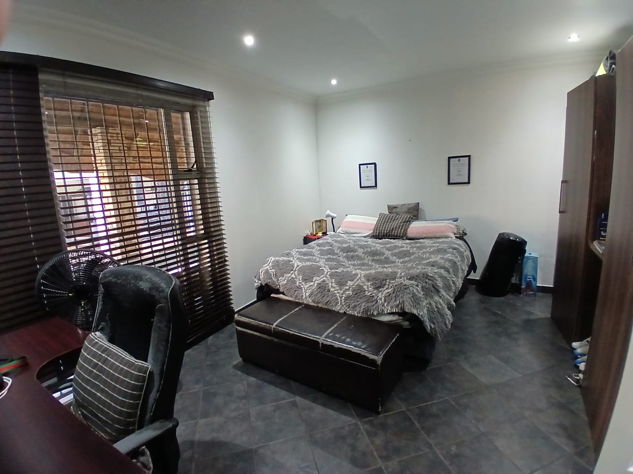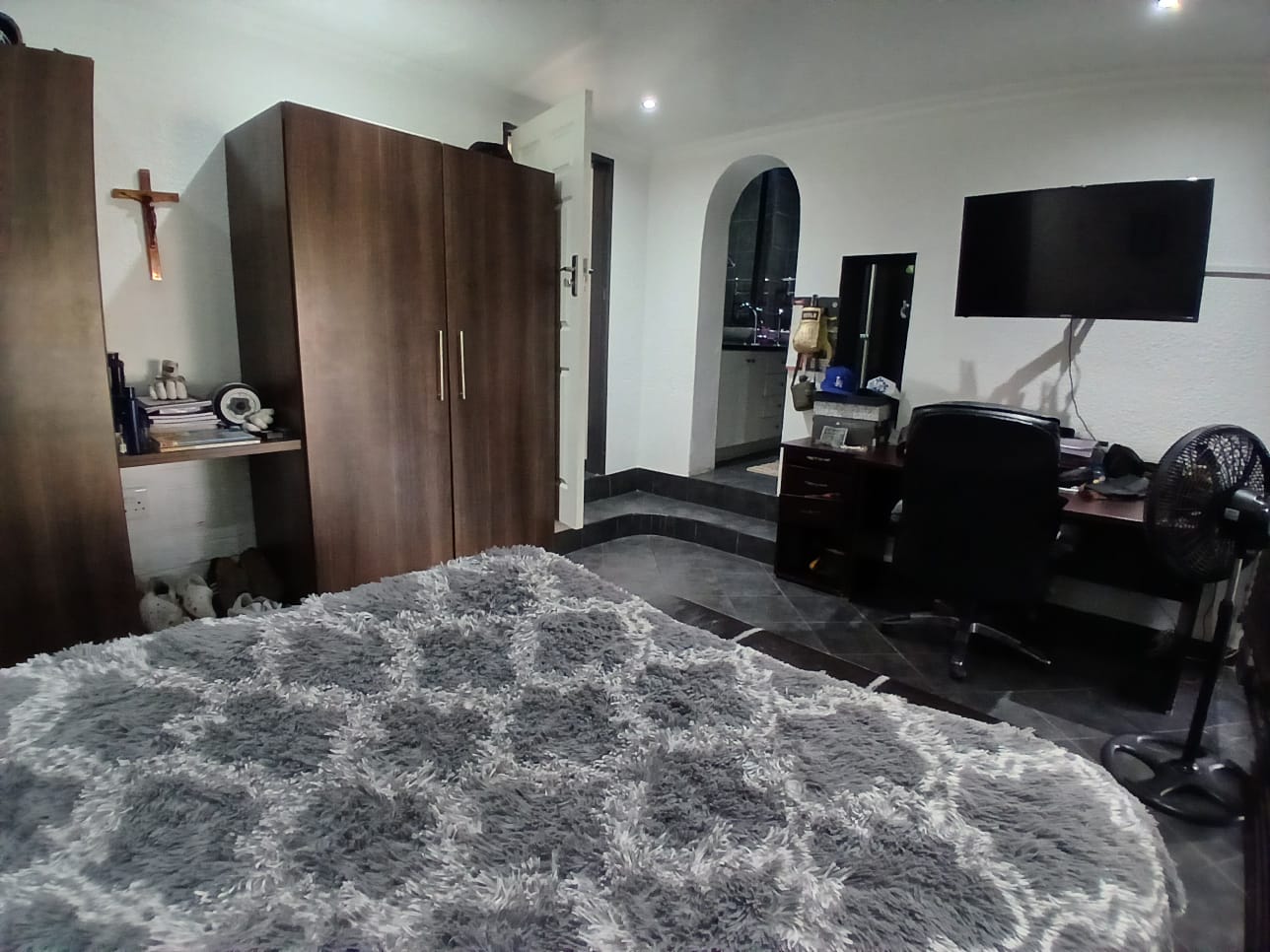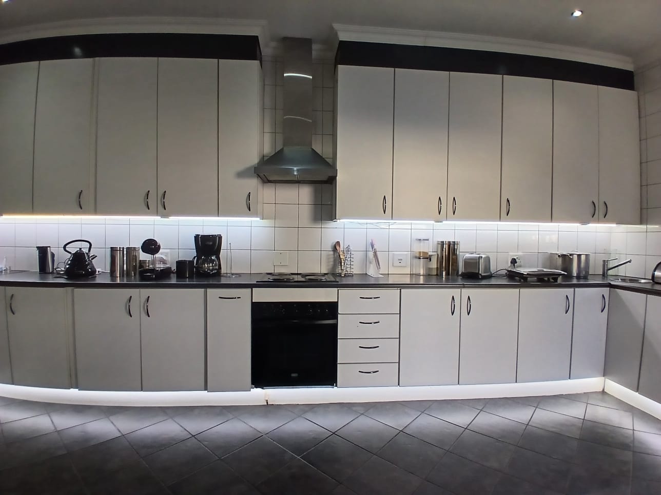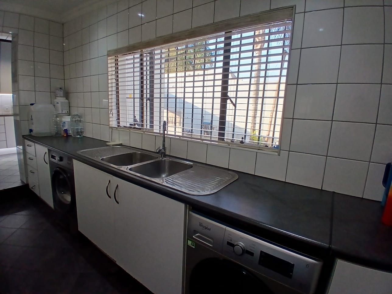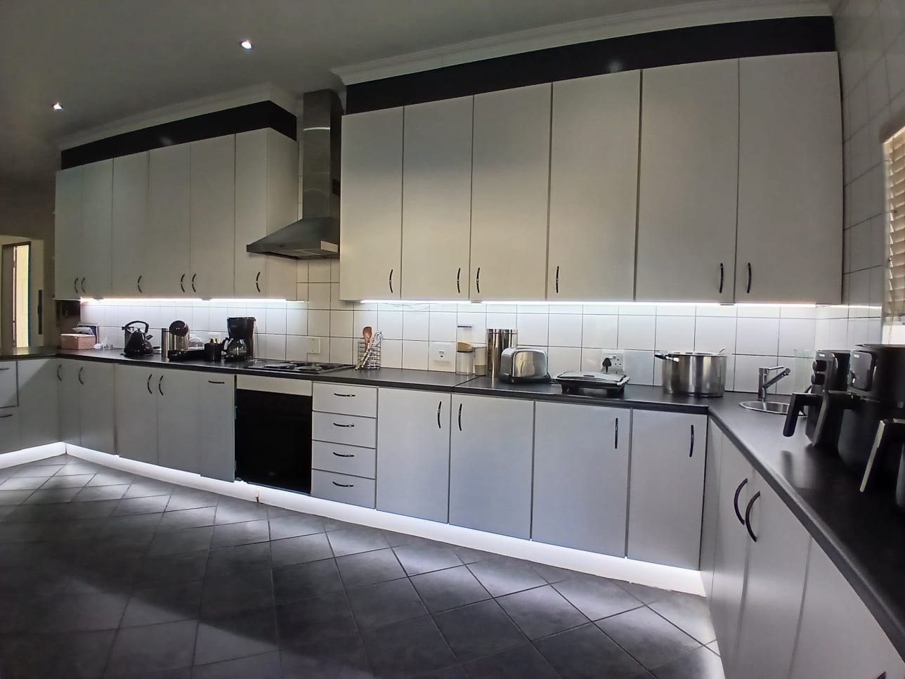 The lounge has a corner fireplace and offers massive space. The stunning kitchen is fitted with stylish white finishings under downlights. There is a separate scullery with pace for all other larger appliances. The kitchen offers ample storage, quality countertops, and modern finishes—ideal for family meals or hosting guests.