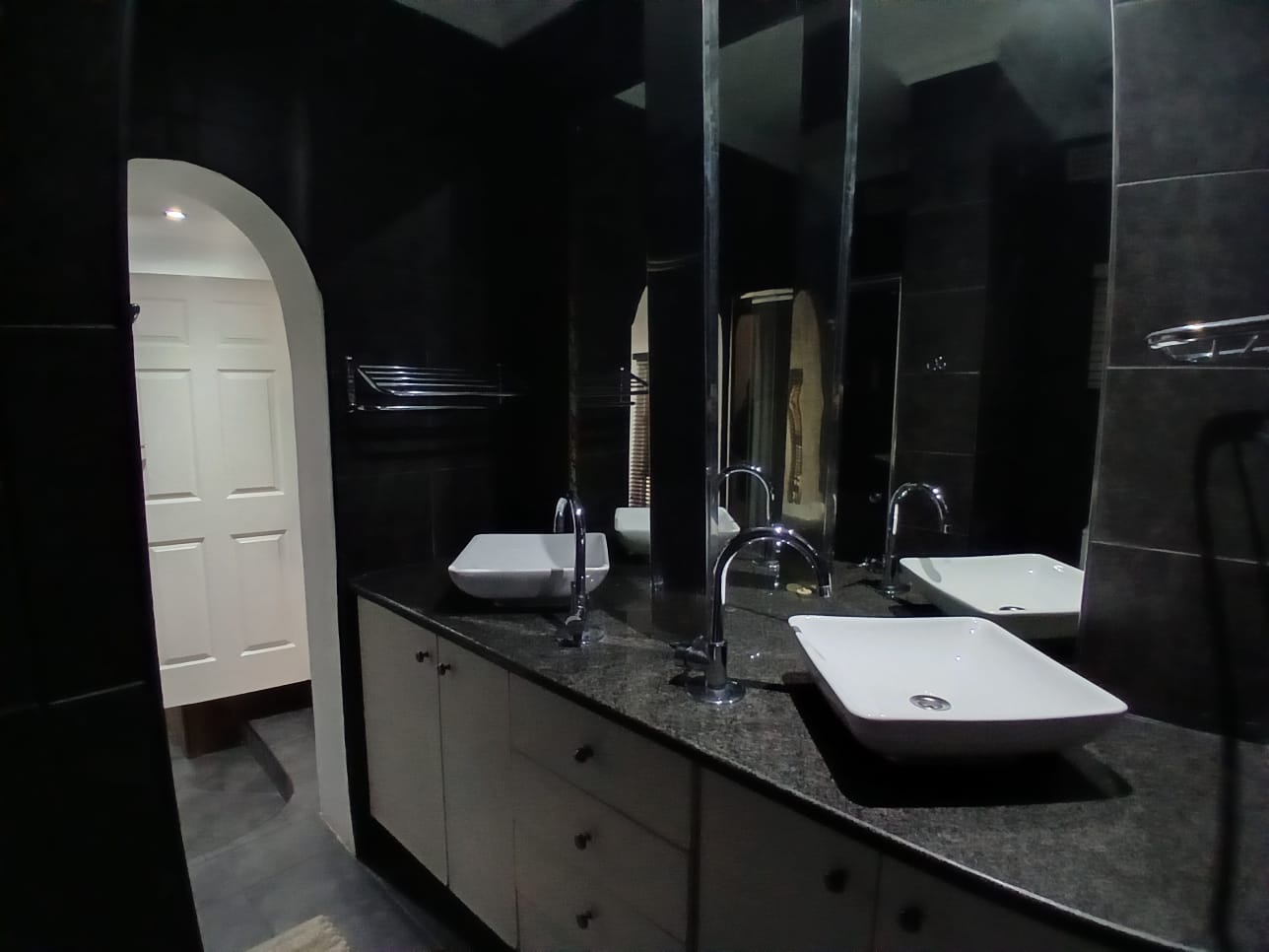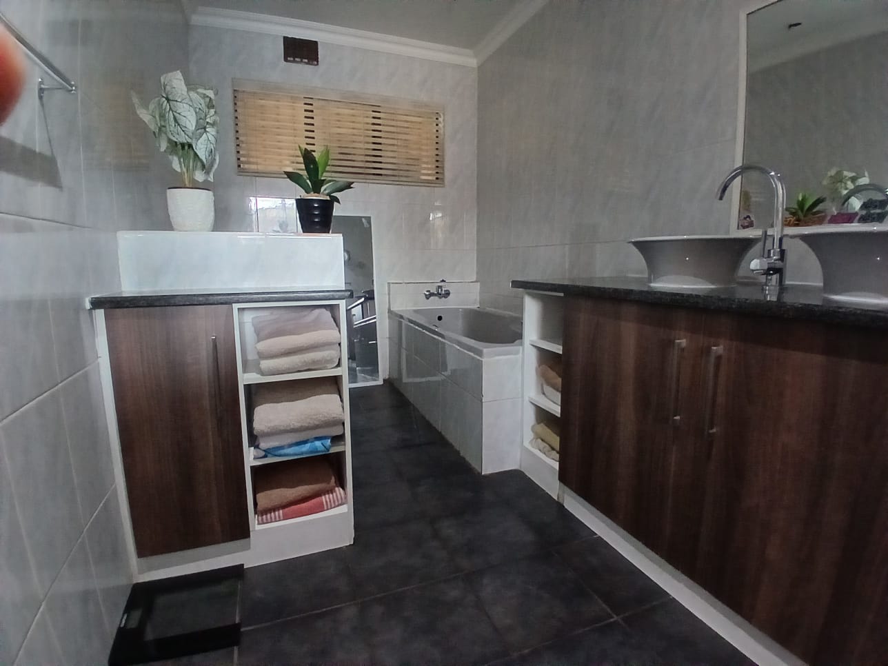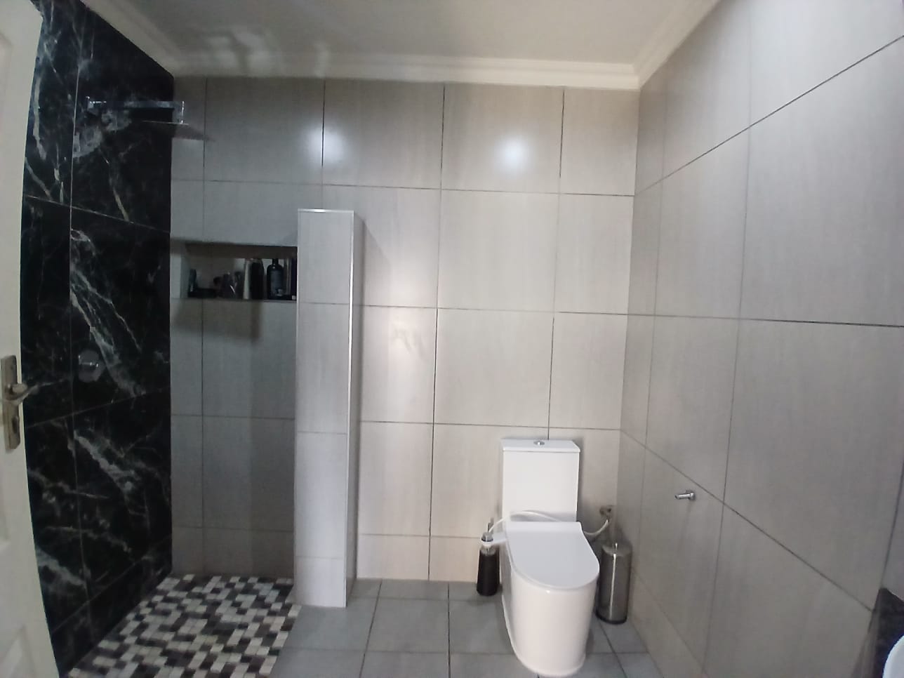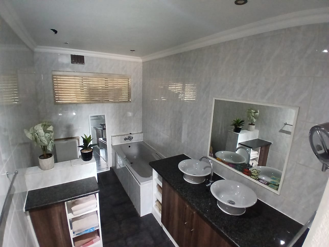 The main home features four generously sized bedrooms with built-in cupboards, natural light, and garden views. Two bedrooms include modern en-suite bathrooms for privacy. One has a bath and the other a shower. The third bathroom has a double shower. All are elegantly designed with quality finishes.