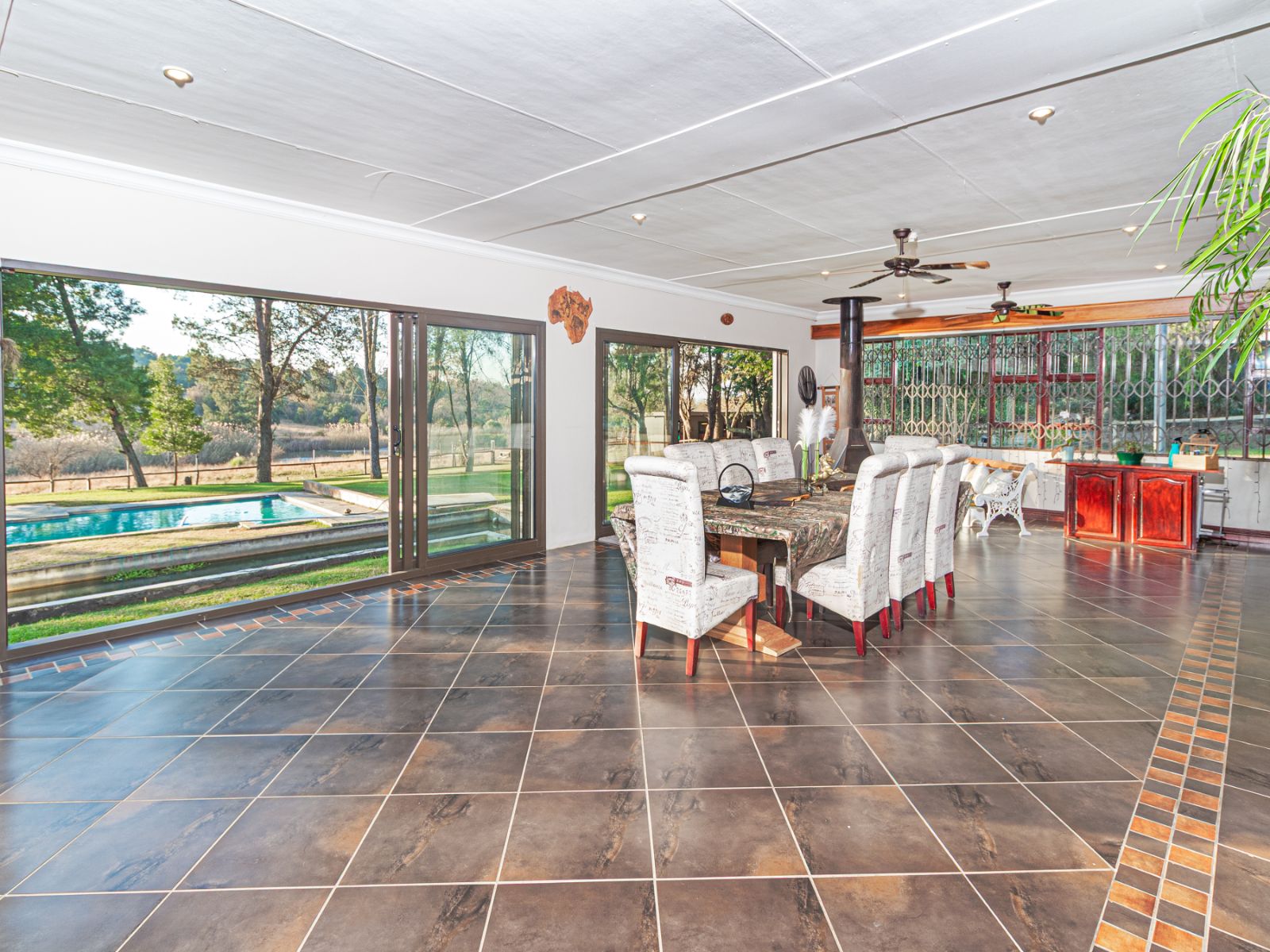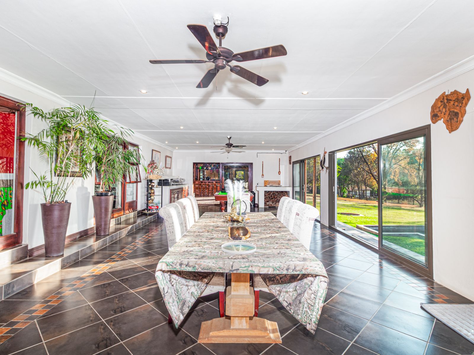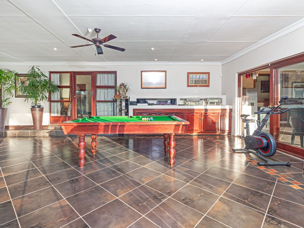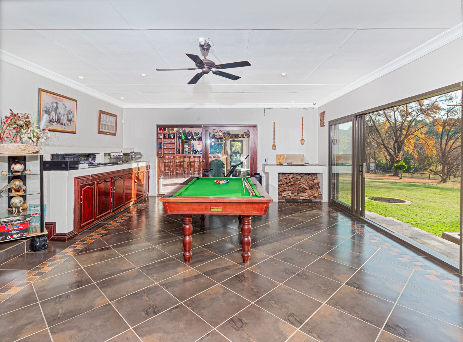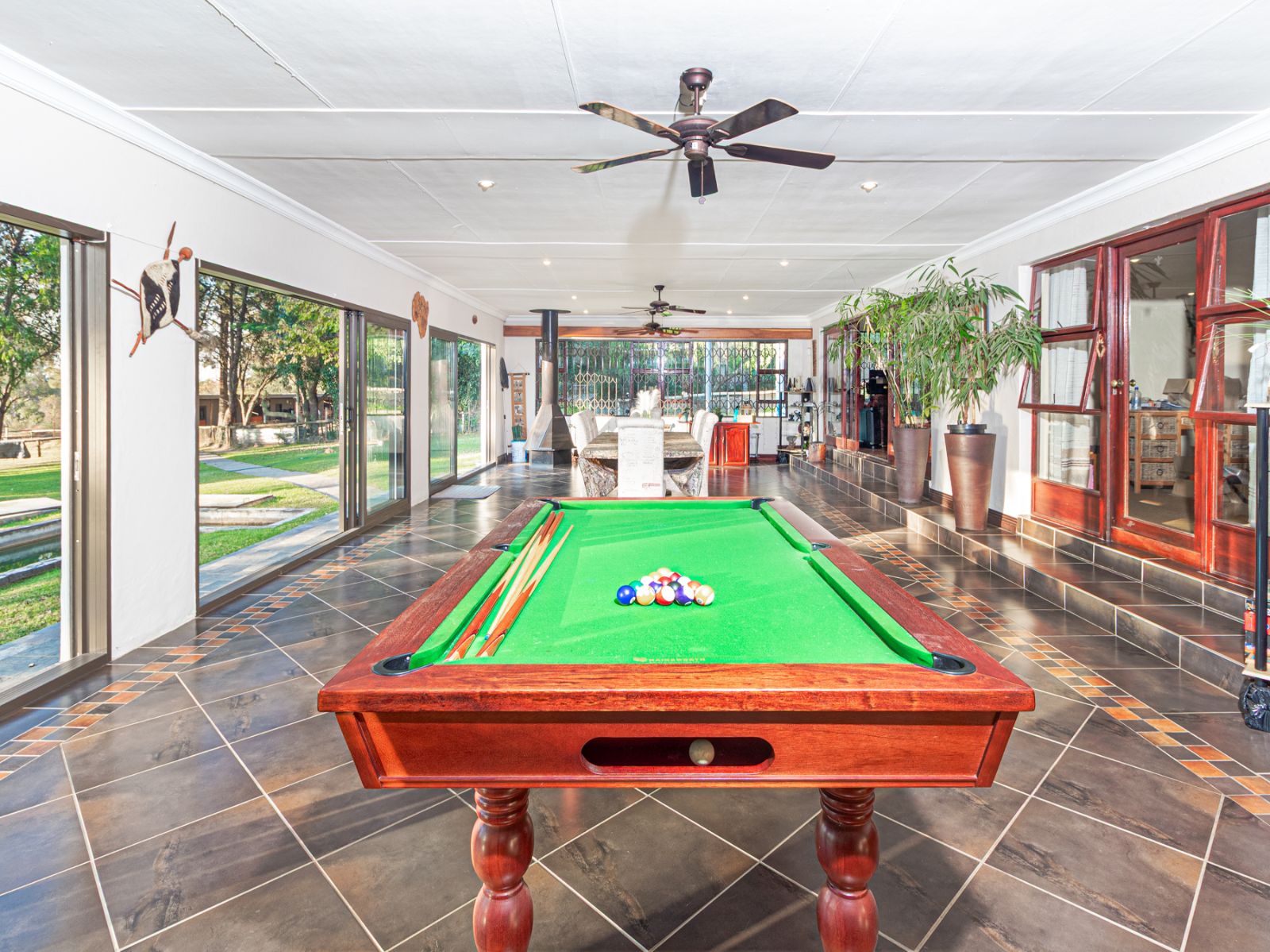 Large open spaces, with your dining room, billiard pool table which remains, opens up with double glazed aluminum sliding doors onto the lush garden with pool and koi pond.