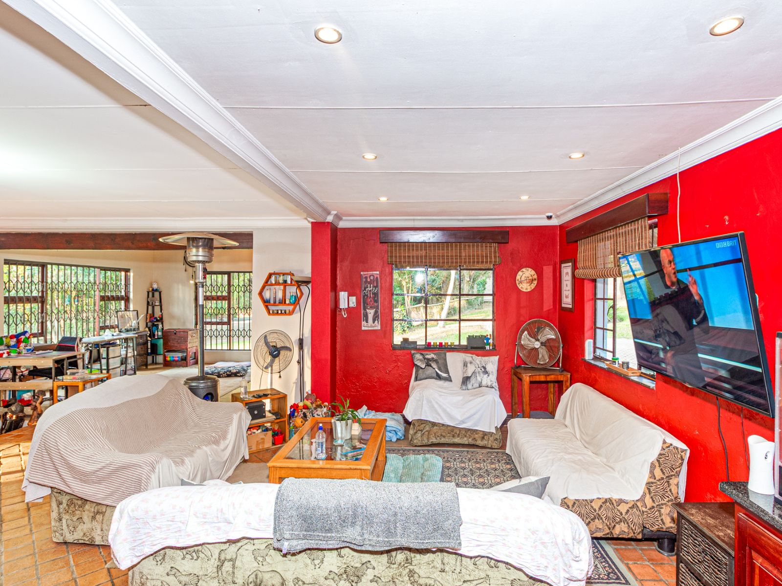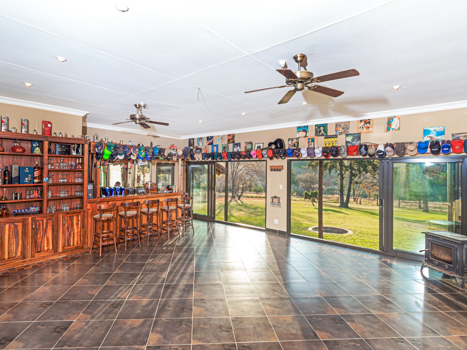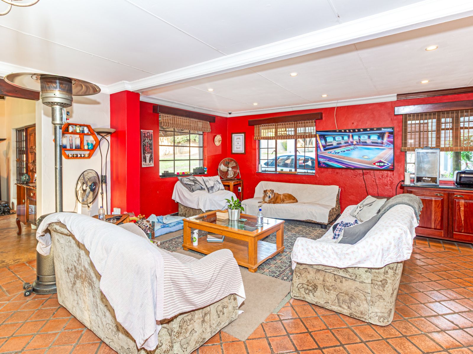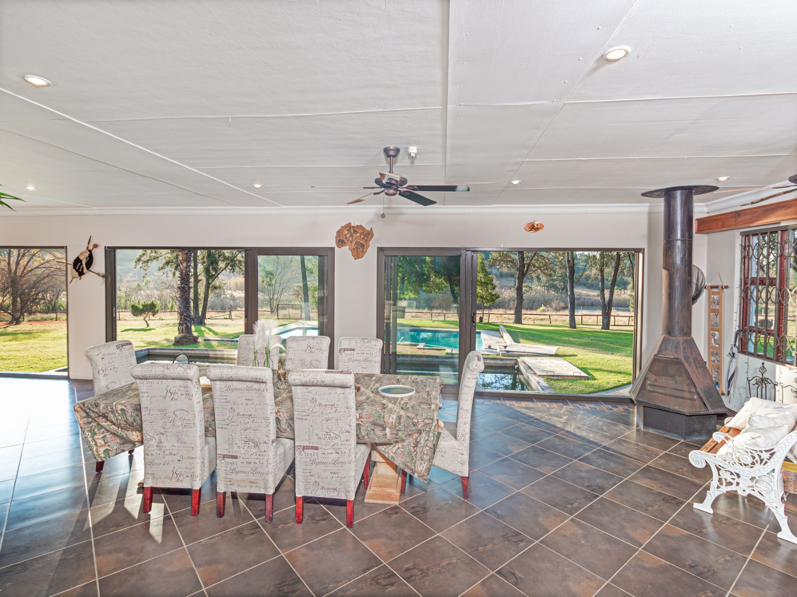 Large open spaces, with your dining room, billiard pool table which remains, opens up with double glazed aluminum sliding doors onto the lush garden with pool and koi pond.