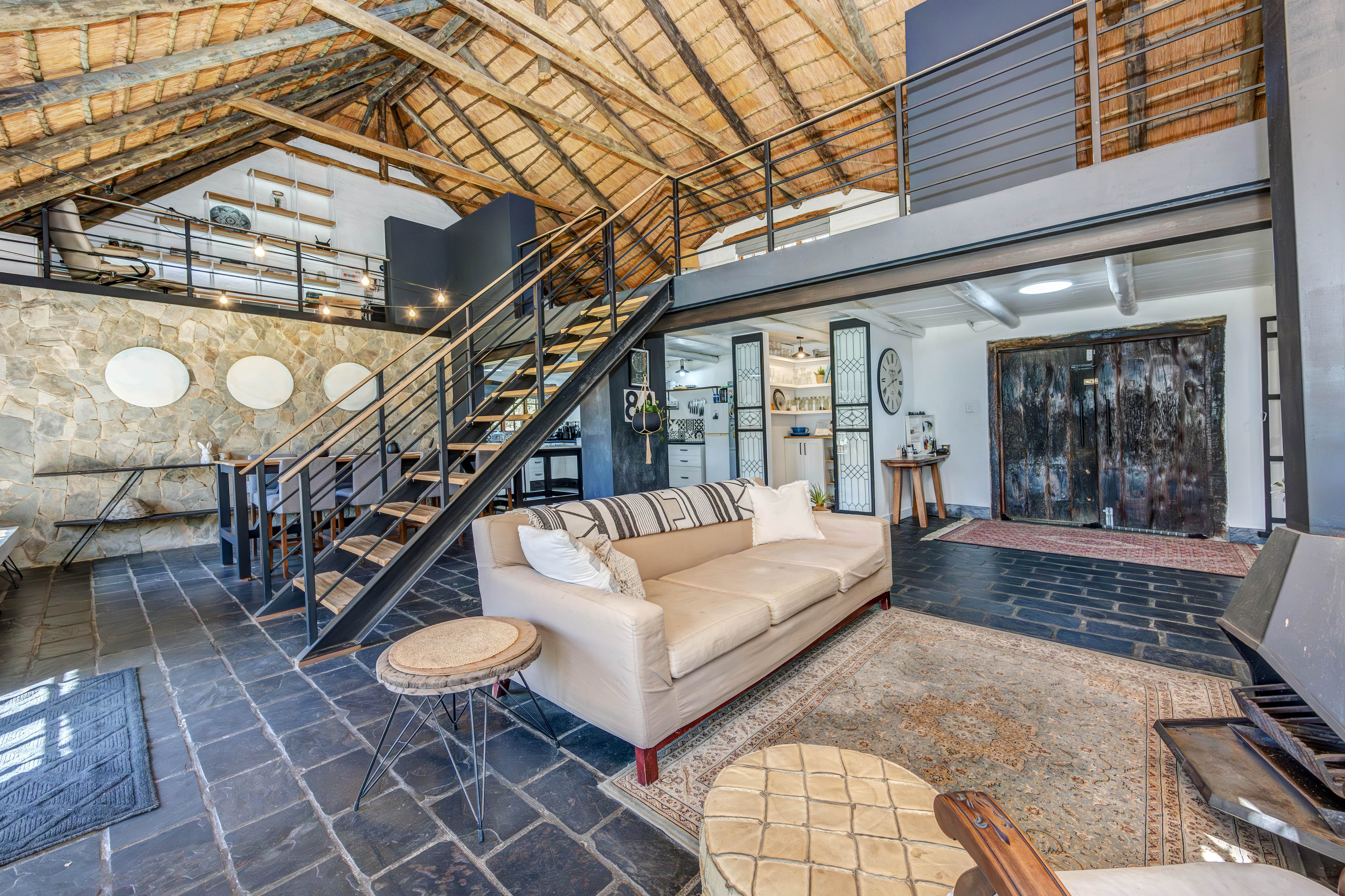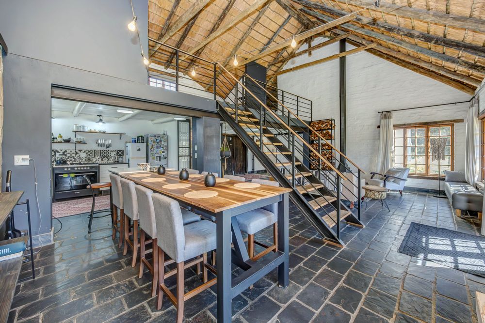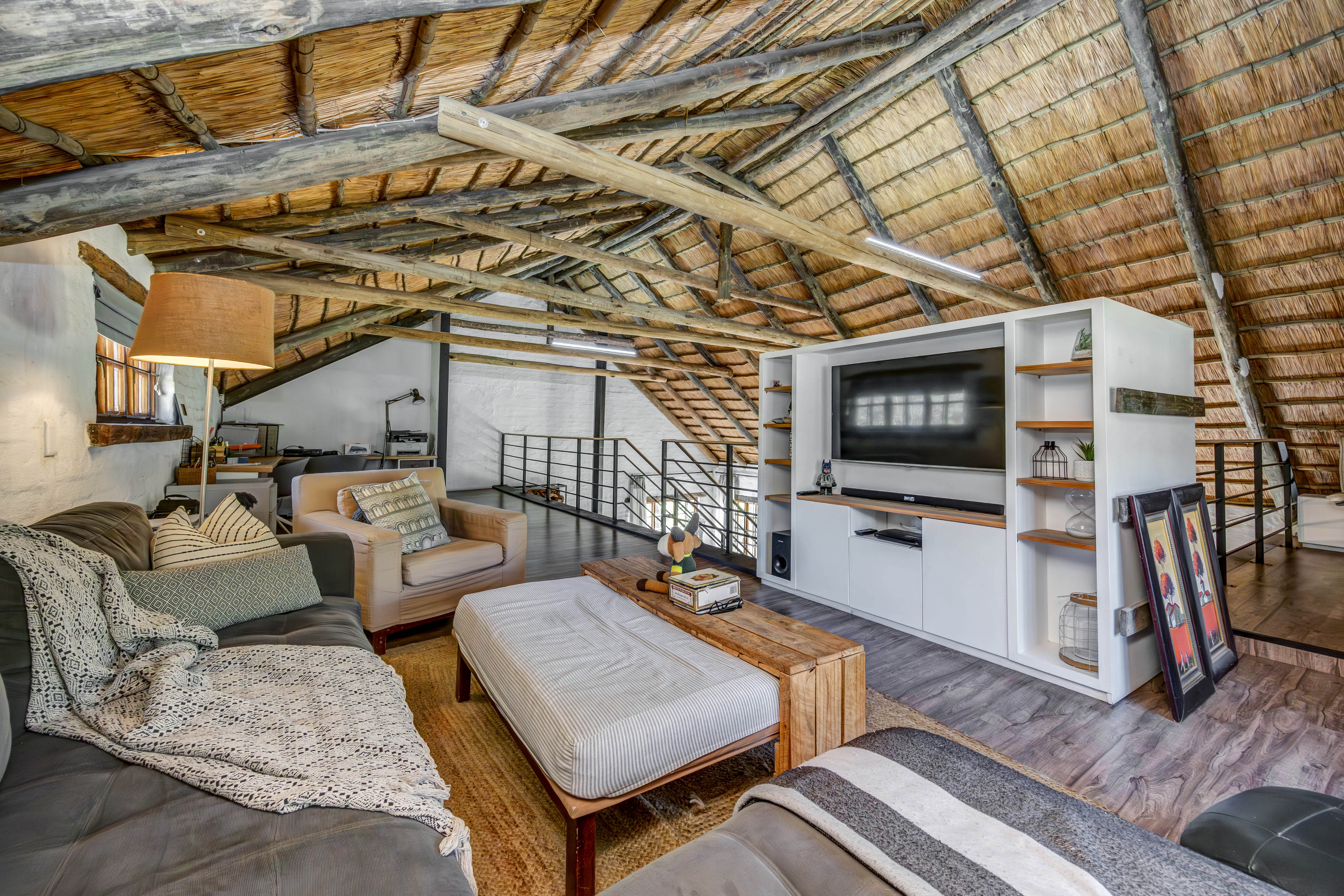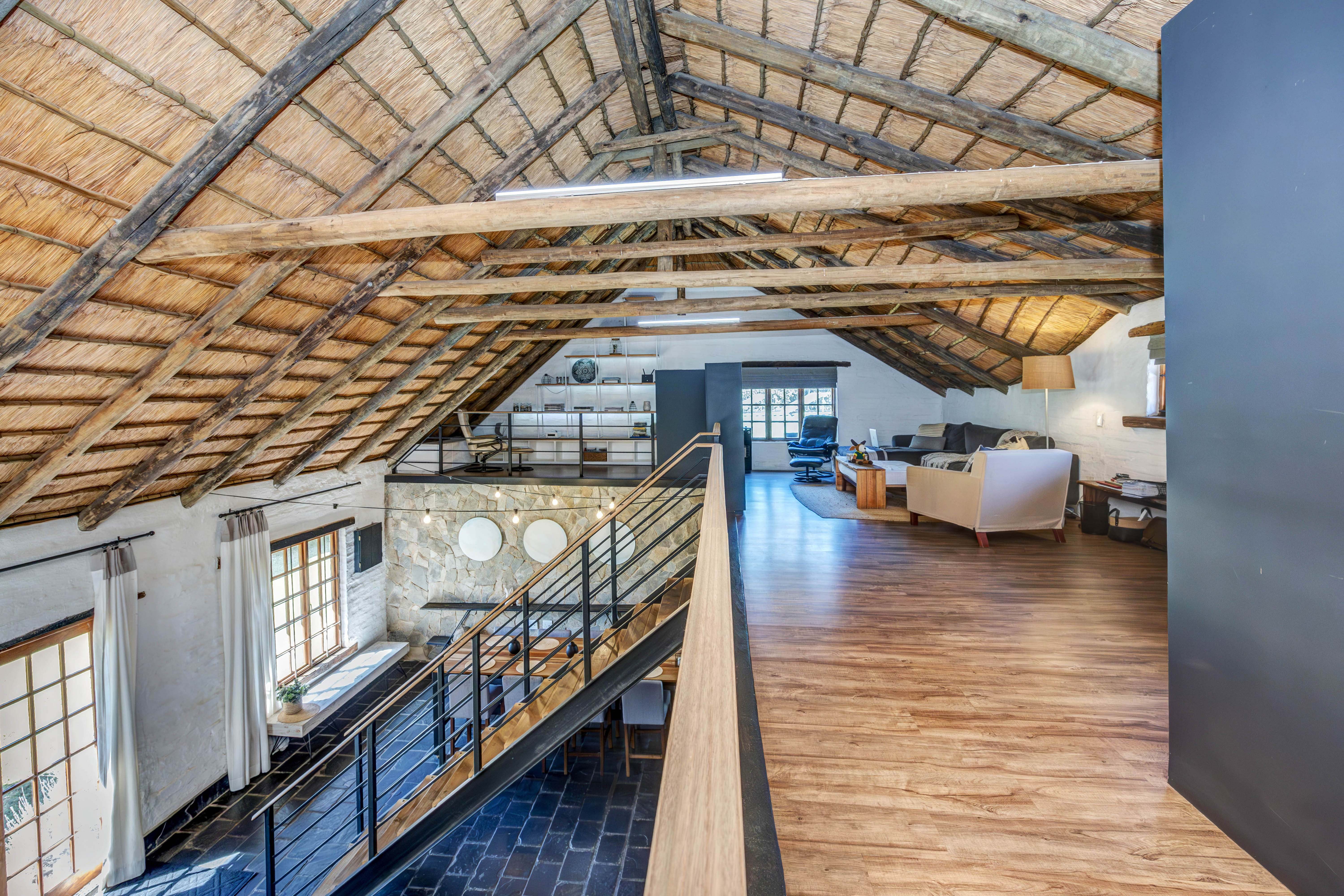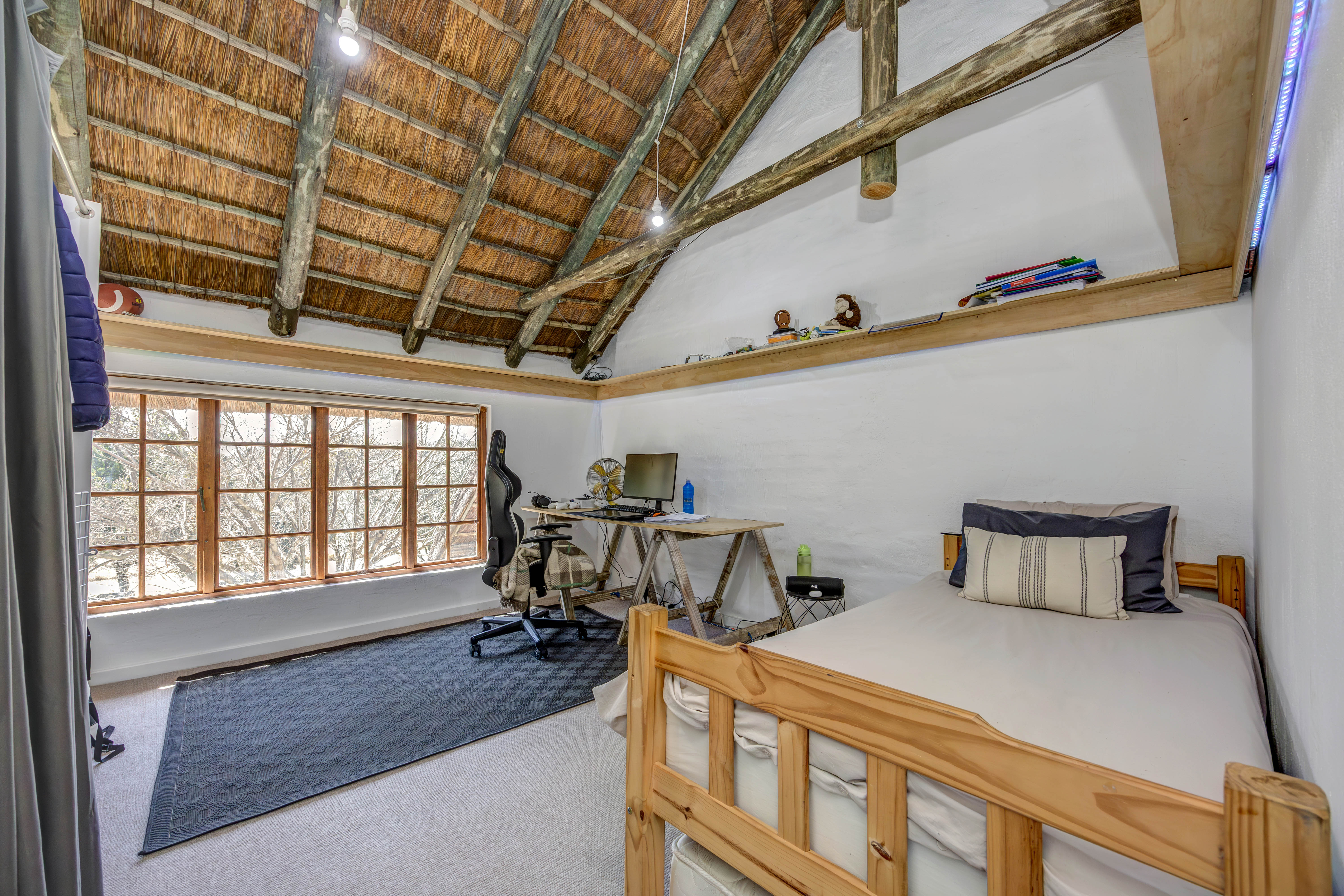 Nestled within the secure and tranquil gated community of Lammermoor, Muldersdrift, minutes away from Broadacres, this exceptional property offers a harmonious blend of rustic charm and modern convenience. This thatch dwelling exudes warmth and character, boasting four spacious bedrooms and two well-appointed bathrooms. Upstairs, two bedrooms are complemented by a cozy TV lounge and a charming reading nook, creating an inviting retreat. The ground floor showcases an open-plan lounge and dining area, complete with a custom-made dining table and a wood-burning Morso-type fireplace, ideal for intimate gatherings. The kitchen is a chef’s delight, featuring a scullery and a walk-in pantry for added functionality. Step outside to discover an entertainer’s paradise—an expansive covered entertainment area with a bar and guest loo, a sparkling pool, a captivating fire-pit, and a lush, sizeable garden. Practicality is ensured with three garages, staff accommodation, and a storeroom. The property is fortified with top-tier security, including electric fencing with angled brackets, a Paradox alarm system, Roboguard, and a main gate with a daytime guard and night-time patrols. Sustainability is seamlessly integrated with three-phase electricity, a 10KVA back-up inverter powered by solar panels, two boreholes, and a well-irrigated veggie garden. Fibre connectivity adds to the modern conveniences, making this property a rare gem in a serene setting, where luxury meets security and self-sufficiency. Close to Lanseria International Airport and minutes away from Broadacres and Fourways.