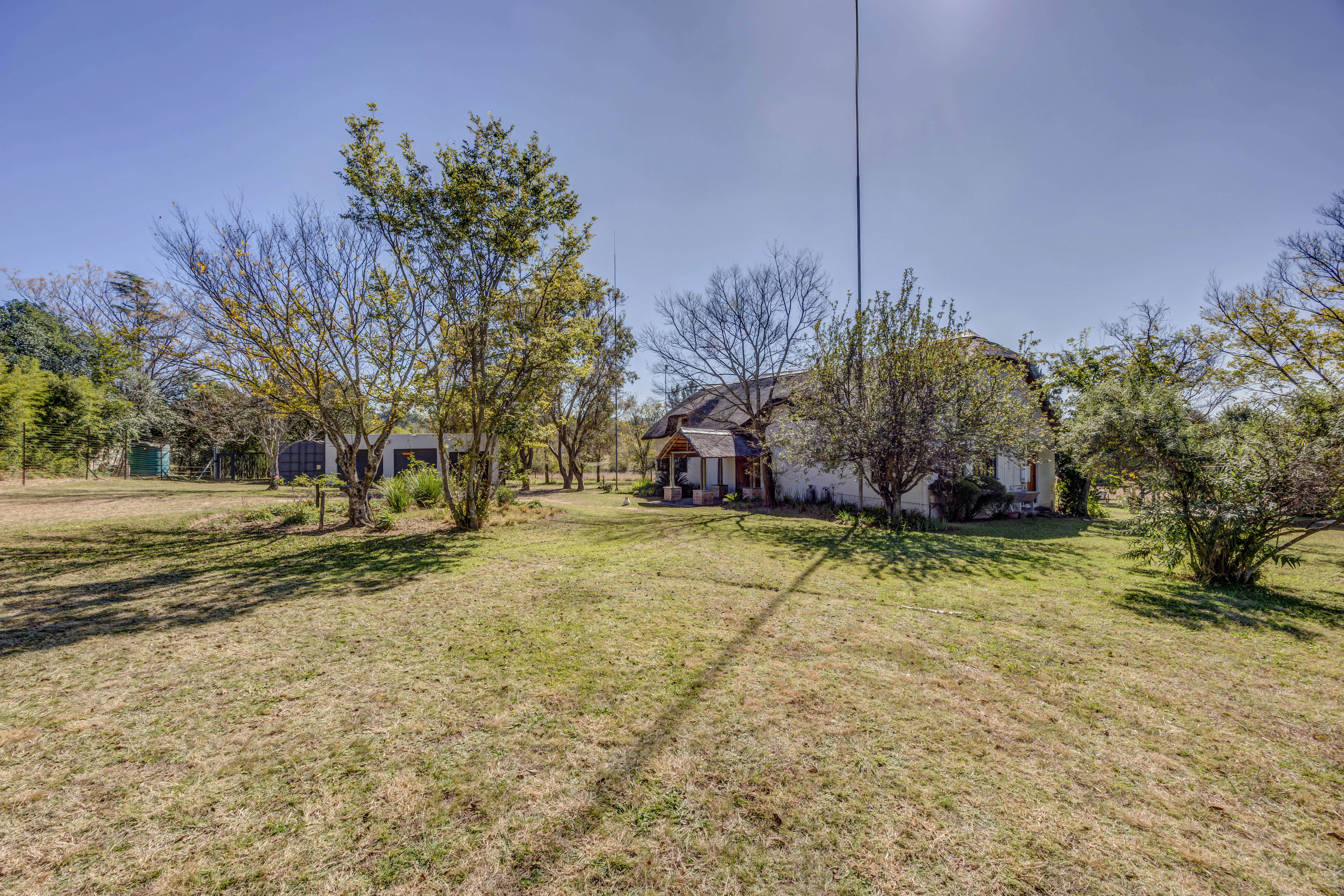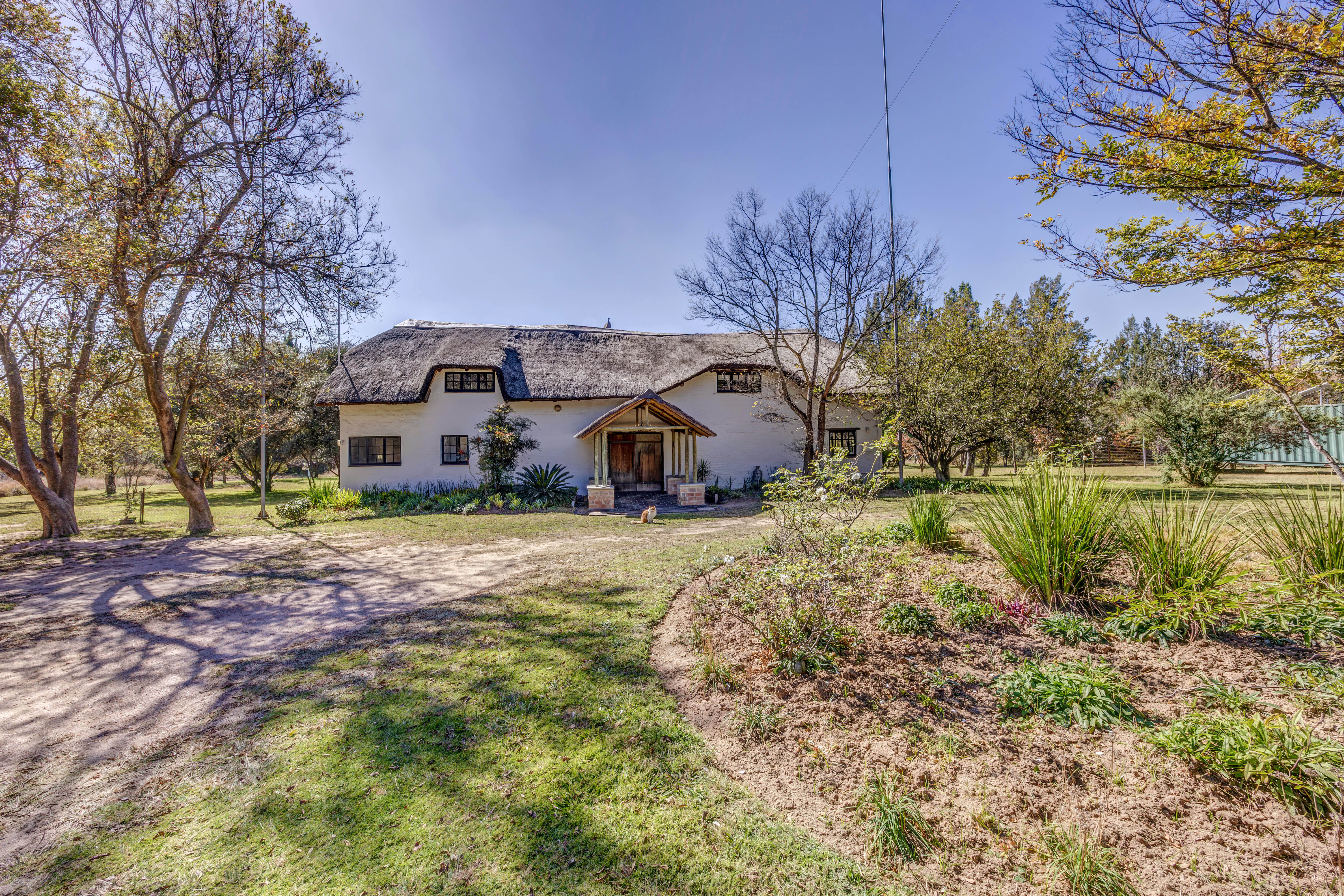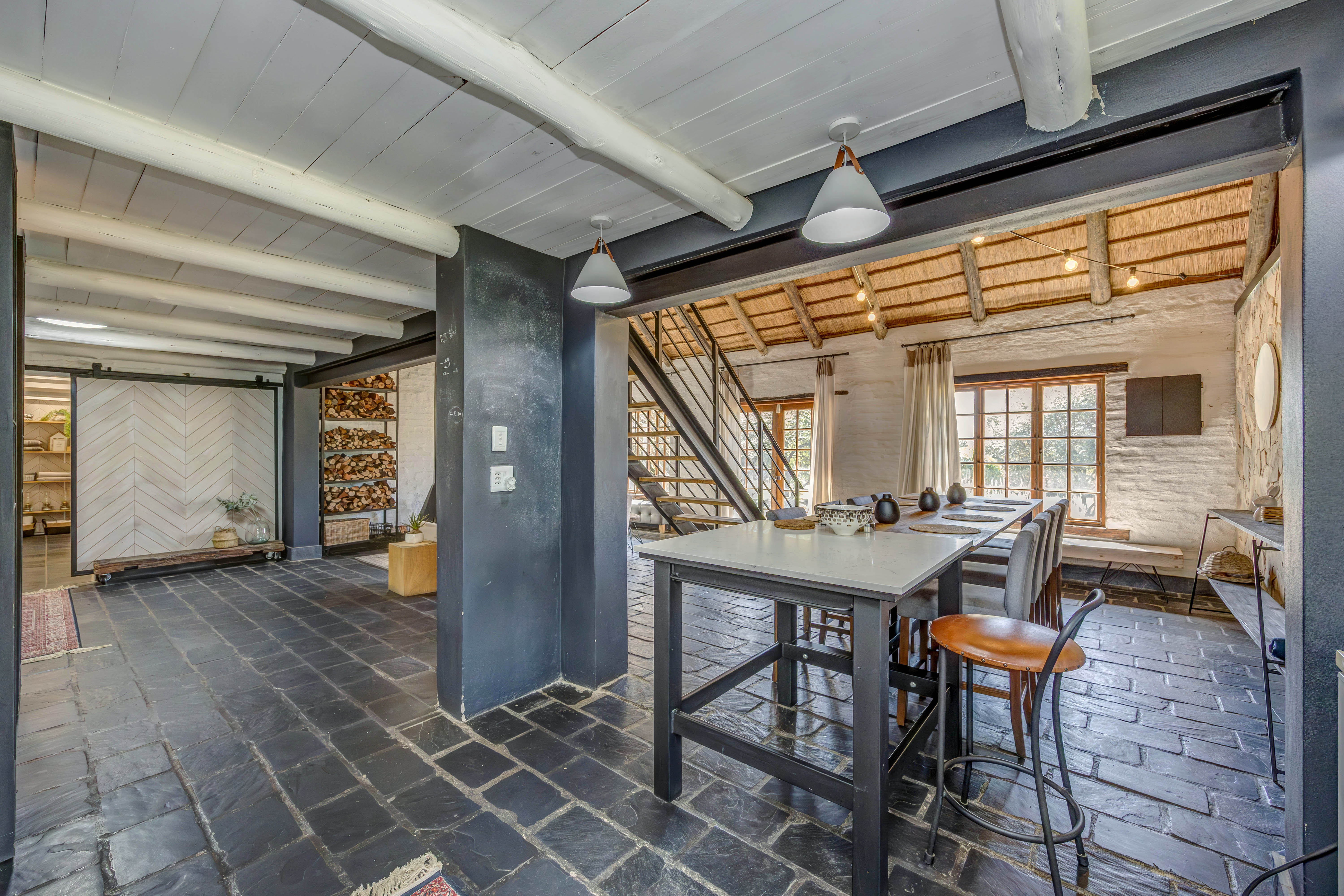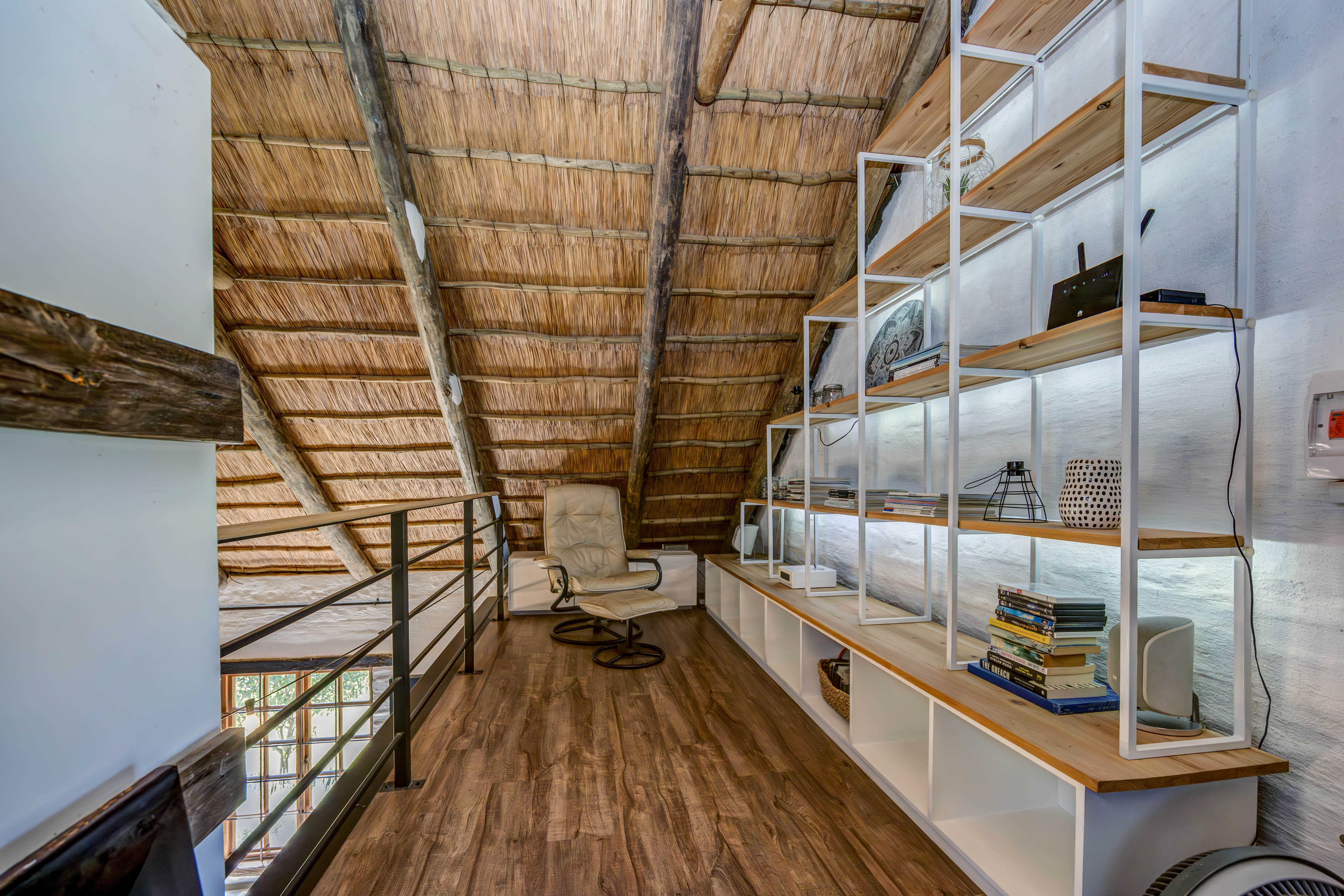 Nestled within the secure and tranquil gated community of Lammermoor, Muldersdrift, minutes away from Broadacres, this exceptional property offers a harmonious blend of rustic charm and modern convenience. This thatch dwelling exudes warmth and character, boasting four spacious bedrooms and two well-appointed bathrooms. Upstairs, two bedrooms are complemented by a cozy TV lounge and a charming reading nook, creating an inviting retreat. The ground floor showcases an open-plan lounge and dining area, complete with a custom-made dining table and a wood-burning Morso-type fireplace, ideal for intimate gatherings. The kitchen is a chef’s delight, featuring a scullery and a walk-in pantry for added functionality. Step outside to discover an entertainer’s paradise—an expansive covered entertainment area with a bar and guest loo, a sparkling pool, a captivating fire-pit, and a lush, sizeable garden. Practicality is ensured with three garages, staff accommodation, and a storeroom. The property is fortified with top-tier security, including electric fencing with angled brackets, a Paradox alarm system, Roboguard, and a main gate with a daytime guard and night-time patrols. Sustainability is seamlessly integrated with three-phase electricity, a 10KVA back-up inverter powered by solar panels, two boreholes, and a well-irrigated veggie garden. Fibre connectivity adds to the modern conveniences, making this property a rare gem in a serene setting, where luxury meets security and self-sufficiency. Close to Lanseria International Airport and minutes away from Broadacres and Fourways.