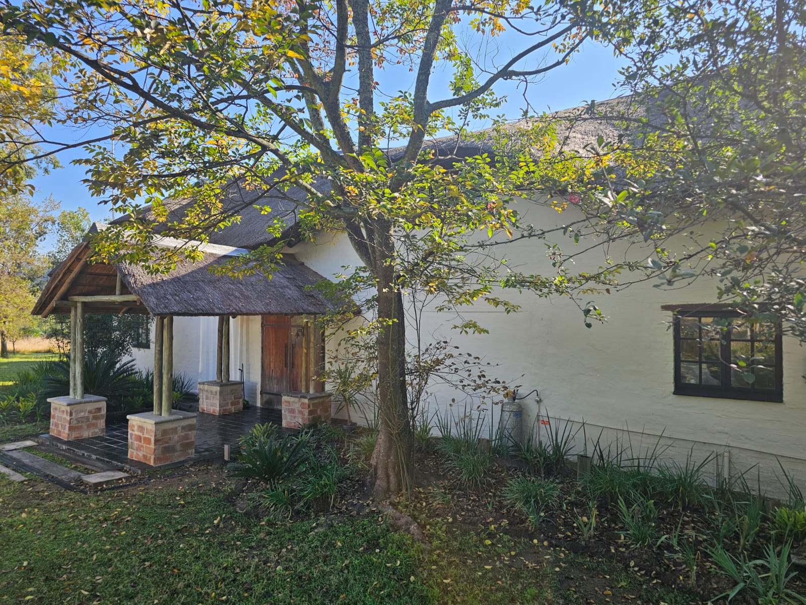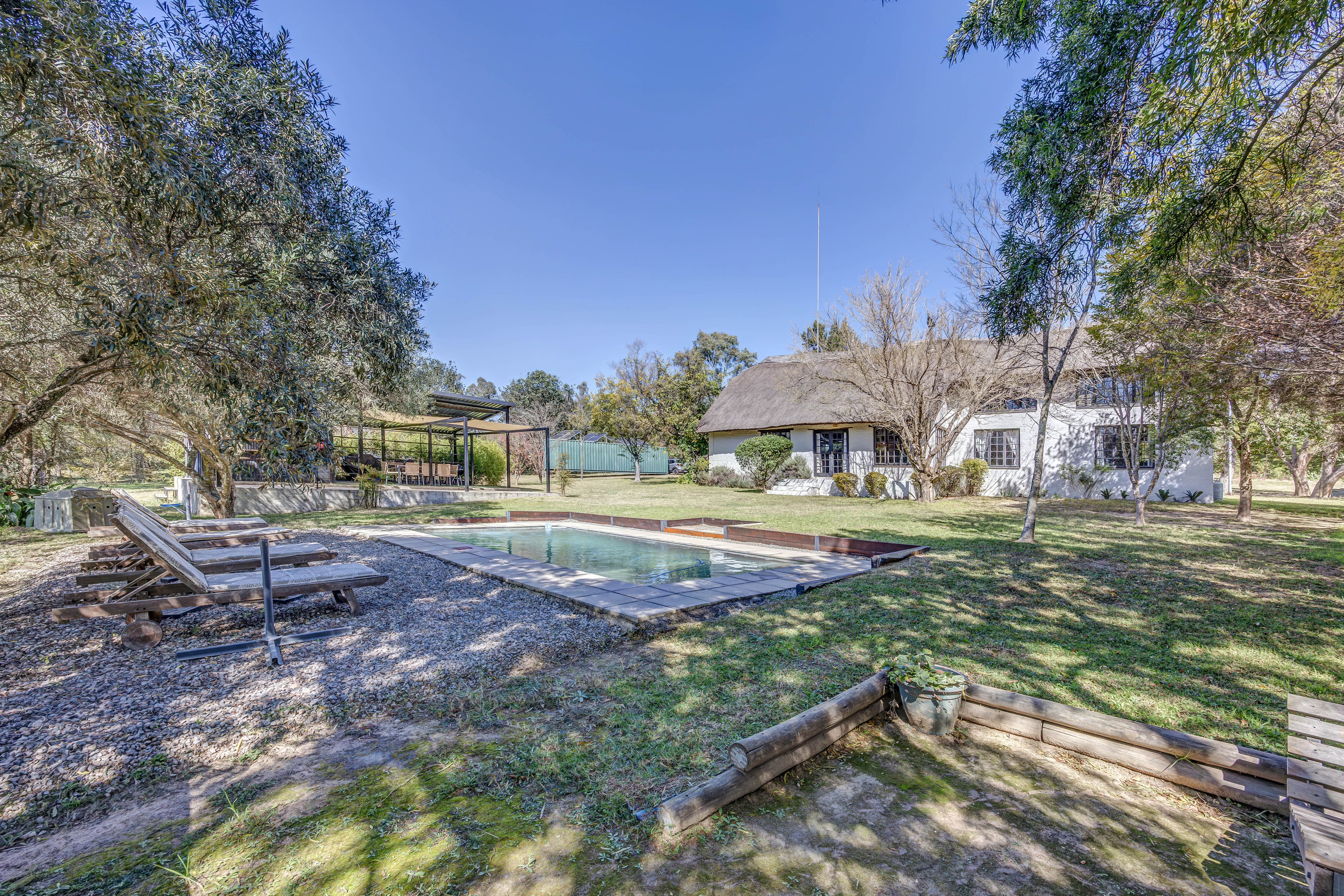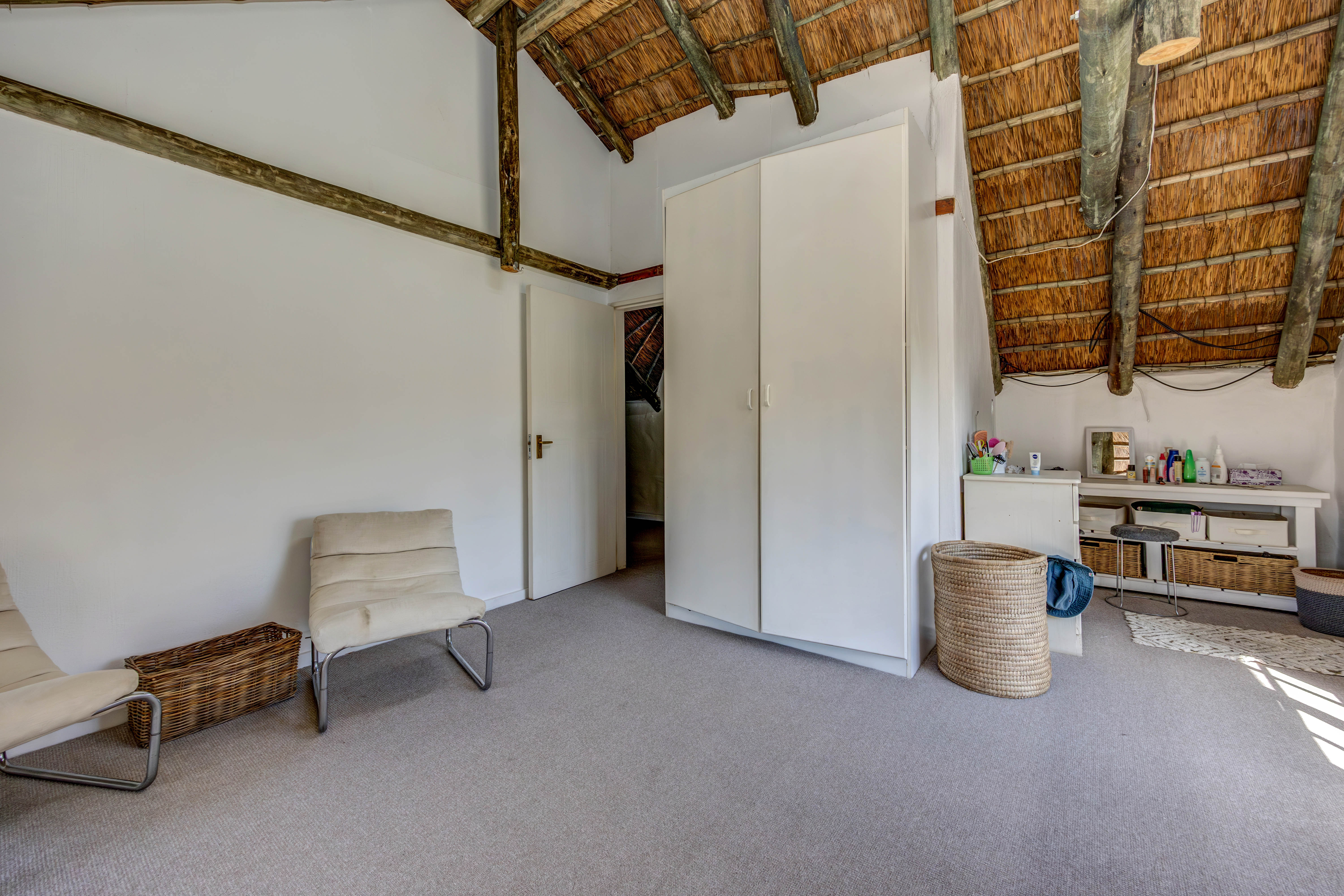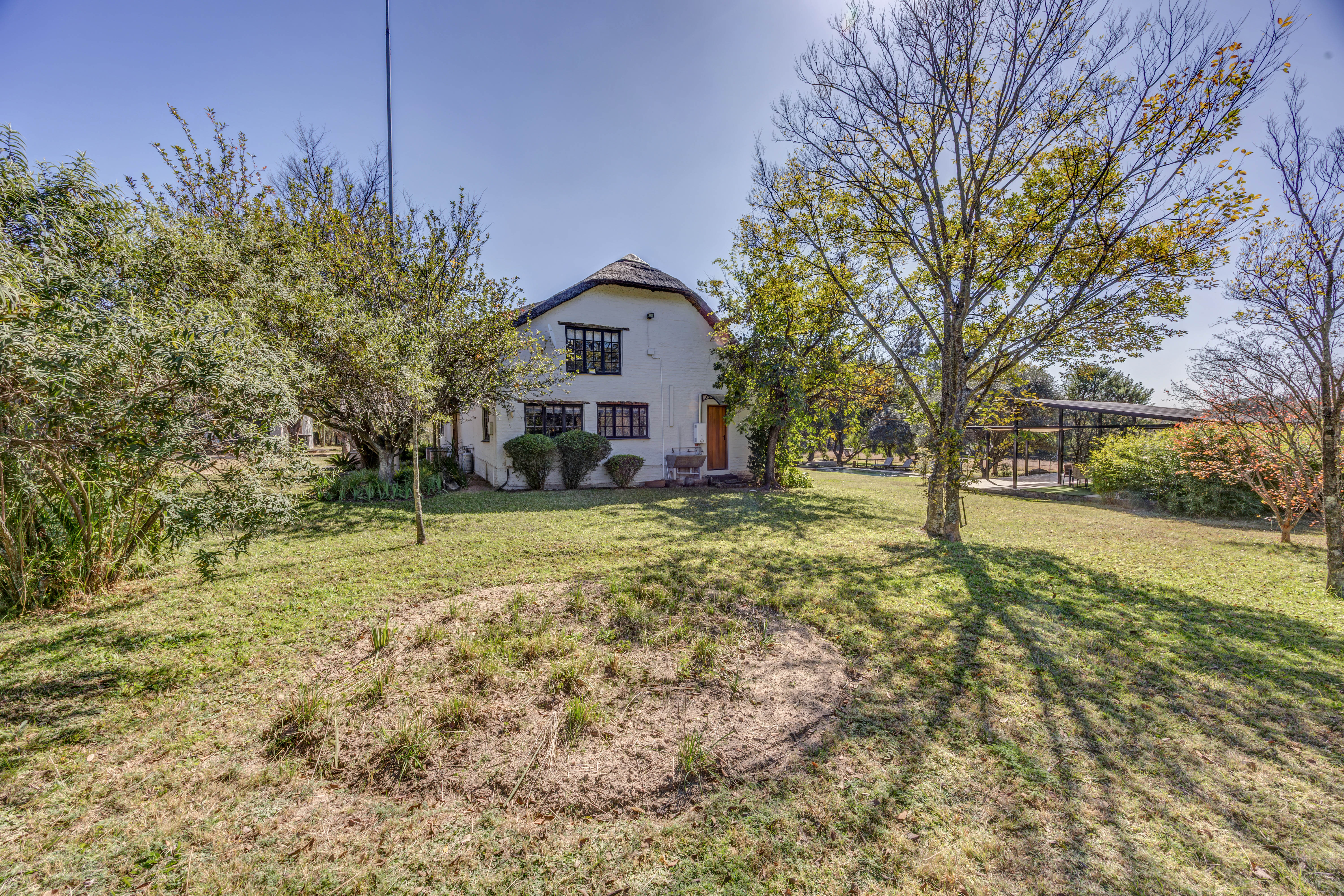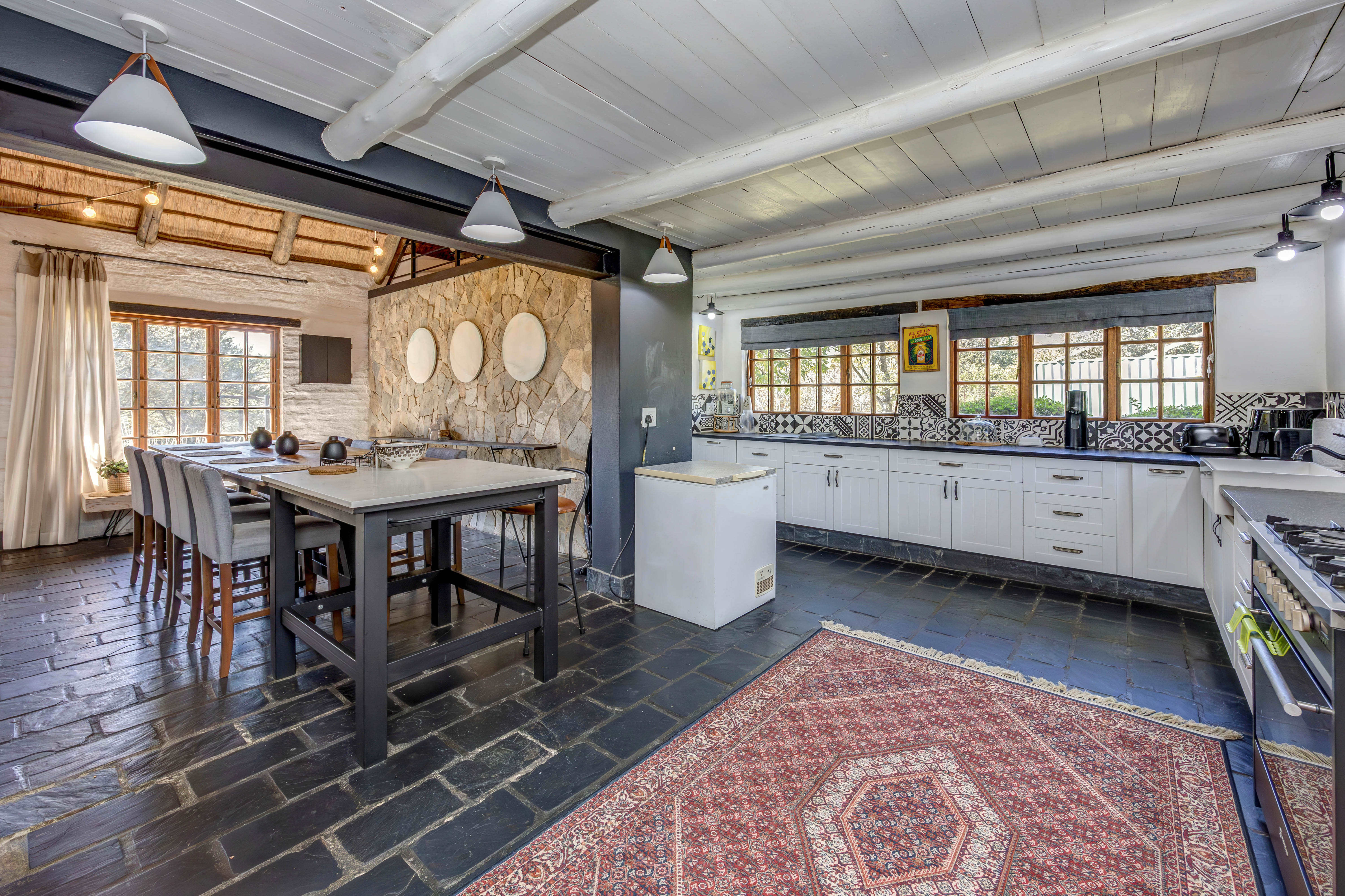 Nestled within the secure and tranquil gated community of Lammermoor, Muldersdrift, minutes away from Broadacres, this exceptional property offers a harmonious blend of rustic charm and modern convenience. This thatch dwelling exudes warmth and character, boasting four spacious bedrooms and two well-appointed bathrooms. Upstairs, two bedrooms are complemented by a cozy TV lounge and a charming reading nook, creating an inviting retreat. The ground floor showcases an open-plan lounge and dining area, complete with a custom-made dining table and a wood-burning Morso-type fireplace, ideal for intimate gatherings. The kitchen is a chef’s delight, featuring a scullery and a walk-in pantry for added functionality. Step outside to discover an entertainer’s paradise—an expansive covered entertainment area with a bar and guest loo, a sparkling pool, a captivating fire-pit, and a lush, sizeable garden. Practicality is ensured with three garages, staff accommodation, and a storeroom. The property is fortified with top-tier security, including electric fencing with angled brackets, a Paradox alarm system, Roboguard, and a main gate with a daytime guard and night-time patrols. Sustainability is seamlessly integrated with three-phase electricity, a 10KVA back-up inverter powered by solar panels, two boreholes, and a well-irrigated veggie garden. Fibre connectivity adds to the modern conveniences, making this property a rare gem in a serene setting, where luxury meets security and self-sufficiency. Close to Lanseria International Airport and minutes away from Broadacres and Fourways.