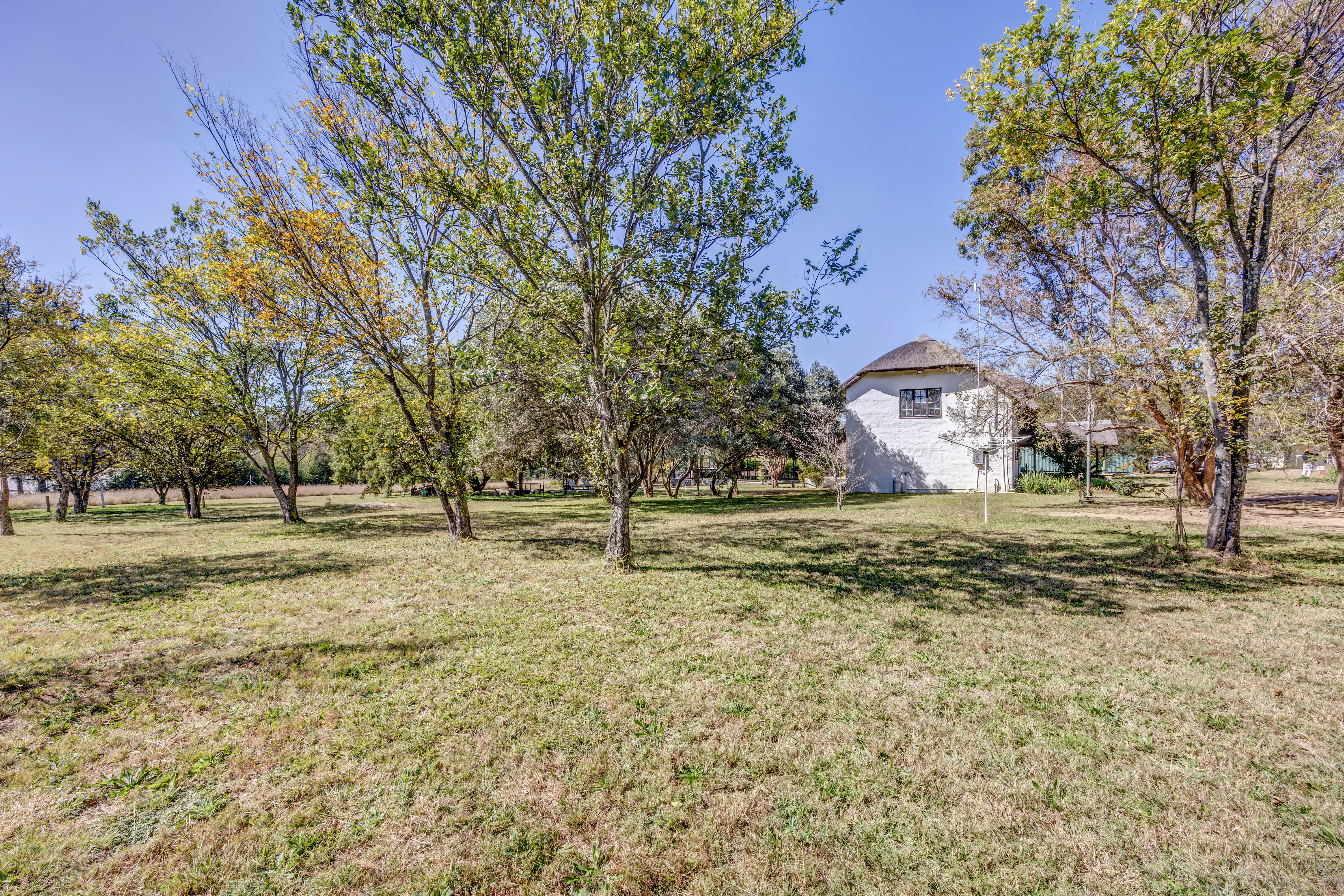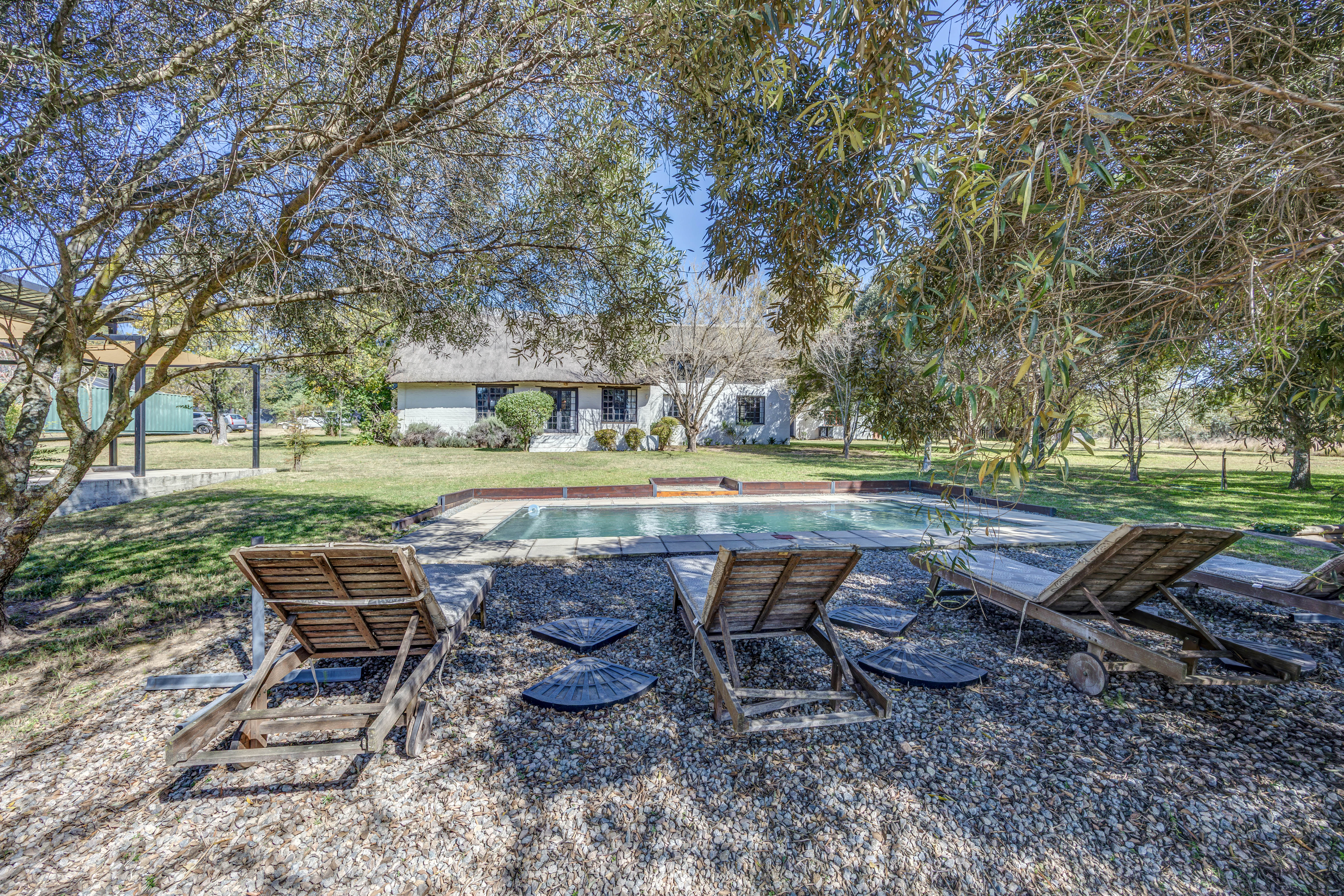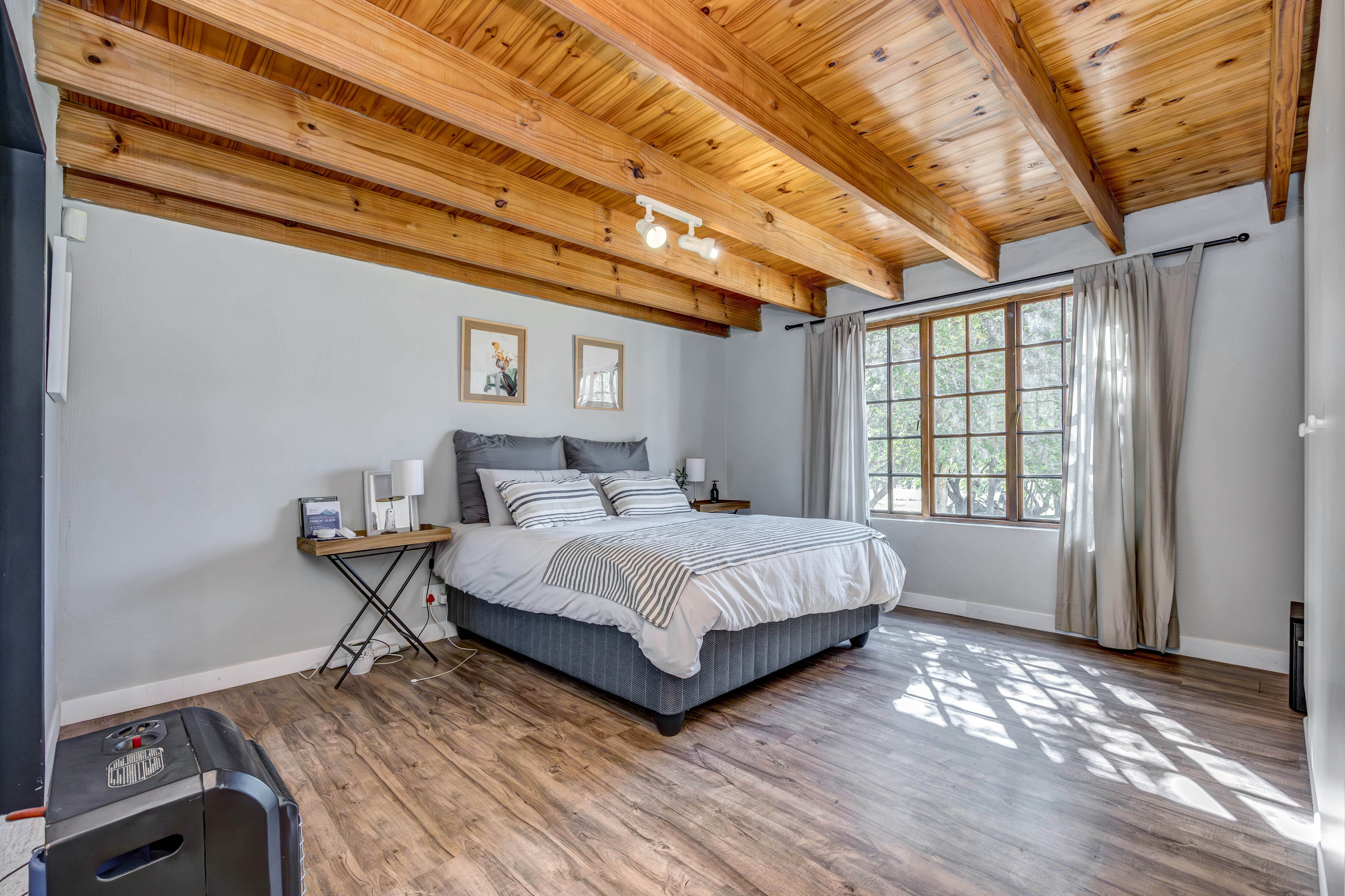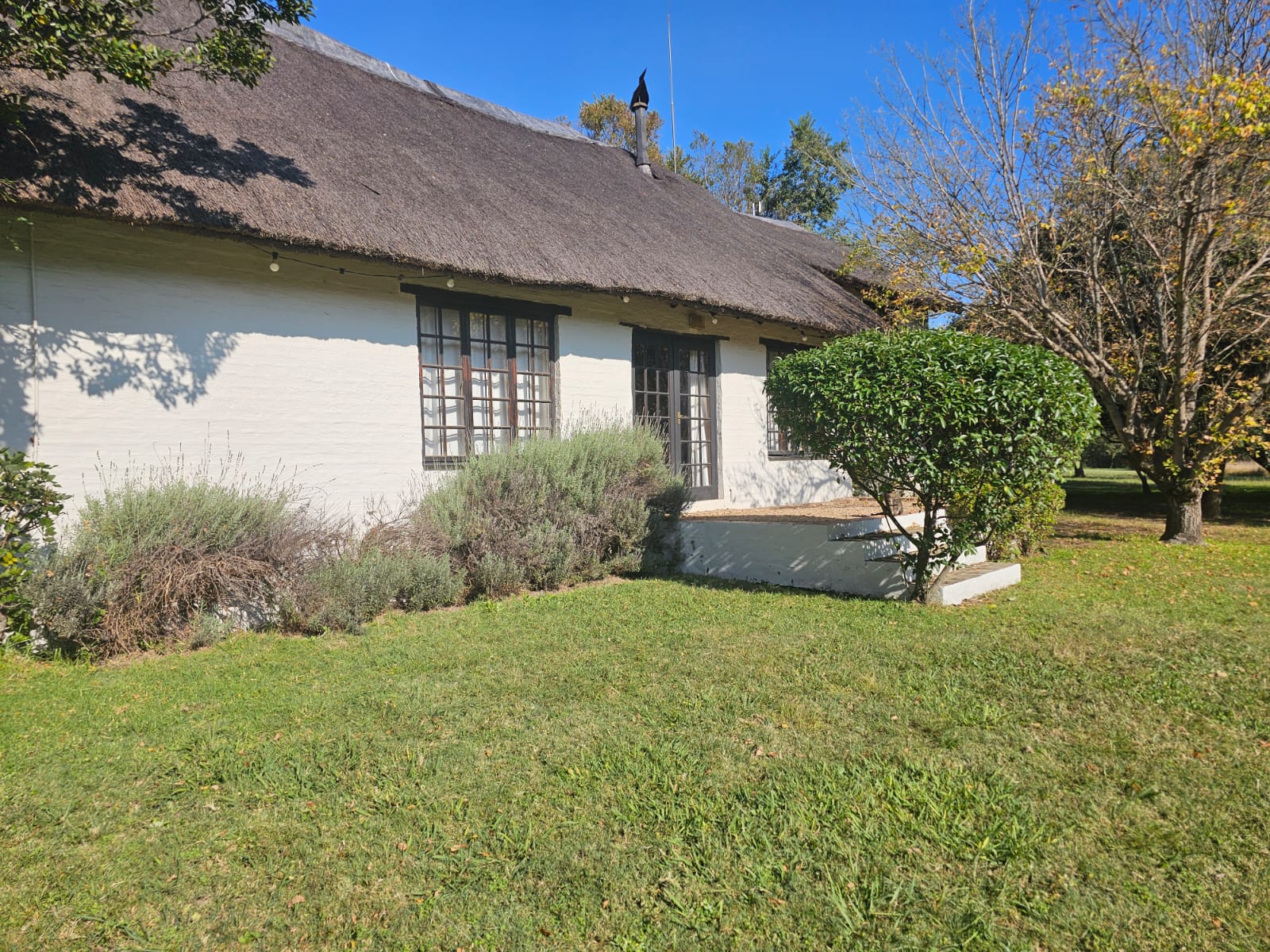 Nestled within the secure and tranquil gated community of Lammermoor, Muldersdrift, minutes away from Broadacres, this exceptional property offers a harmonious blend of rustic charm and modern convenience. This thatch dwelling exudes warmth and character, boasting four spacious bedrooms and two well-appointed bathrooms. Upstairs, two bedrooms are complemented by a cozy TV lounge and a charming reading nook, creating an inviting retreat. The ground floor showcases an open-plan lounge and dining area, complete with a custom-made dining table and a wood-burning Morso-type fireplace, ideal for intimate gatherings. The kitchen is a chef’s delight, featuring a scullery and a walk-in pantry for added functionality. Step outside to discover an entertainer’s paradise—an expansive covered entertainment area with a bar and guest loo, a sparkling pool, a captivating fire-pit, and a lush, sizeable garden. Practicality is ensured with three garages, staff accommodation, and a storeroom. The property is fortified with top-tier security, including electric fencing with angled brackets, a Paradox alarm system, Roboguard, and a main gate with a daytime guard and night-time patrols. Sustainability is seamlessly integrated with three-phase electricity, a 10KVA back-up inverter powered by solar panels, two boreholes, and a well-irrigated veggie garden. Fibre connectivity adds to the modern conveniences, making this property a rare gem in a serene setting, where luxury meets security and self-sufficiency. Close to Lanseria International Airport and minutes away from Broadacres and Fourways.
