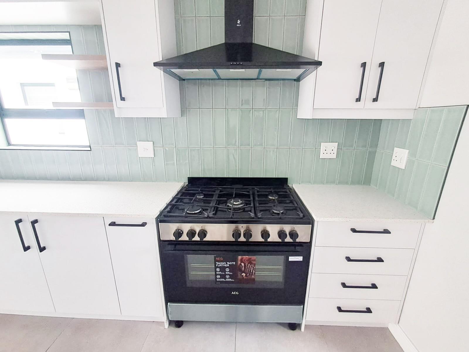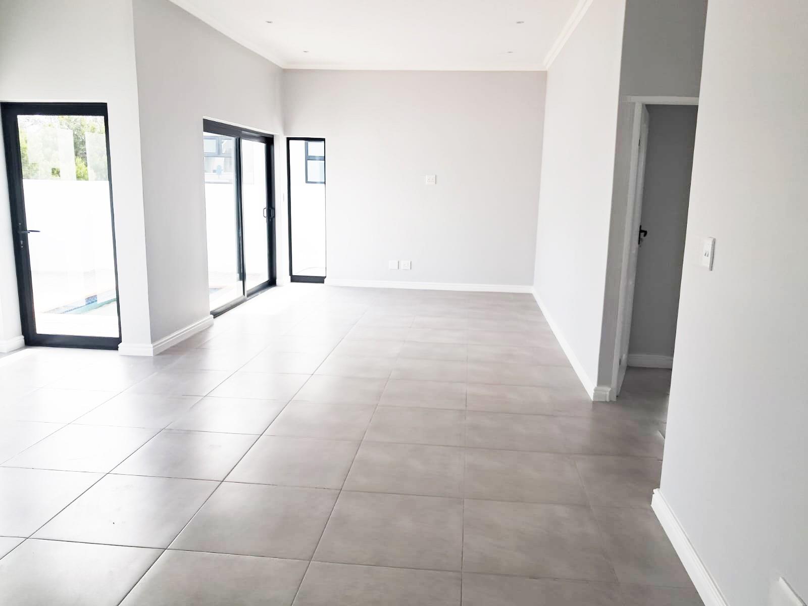 The spacious open-plan living, dining, and kitchen area opens seamlessly into an indoor braai area, ideal for entertaining friends and family. Large aluminum doors and windows flood the home with natural light, creating an inviting, airy atmosphere.