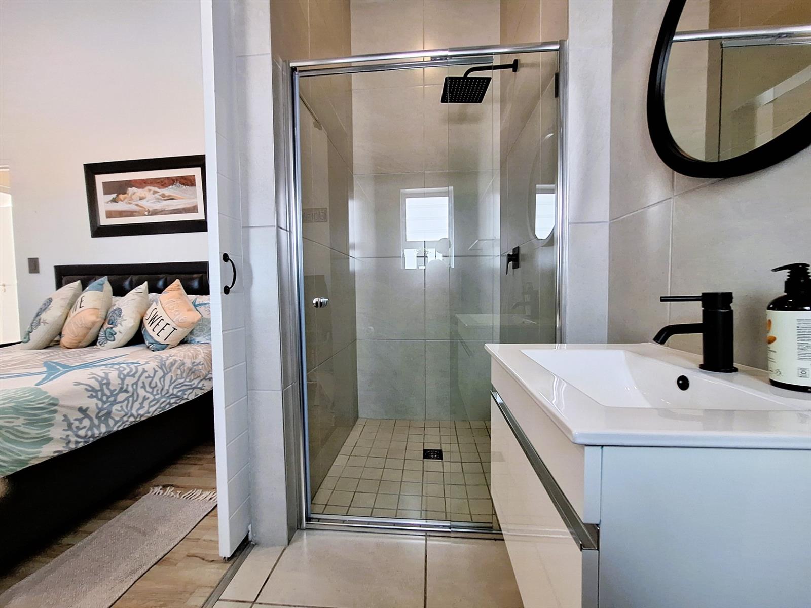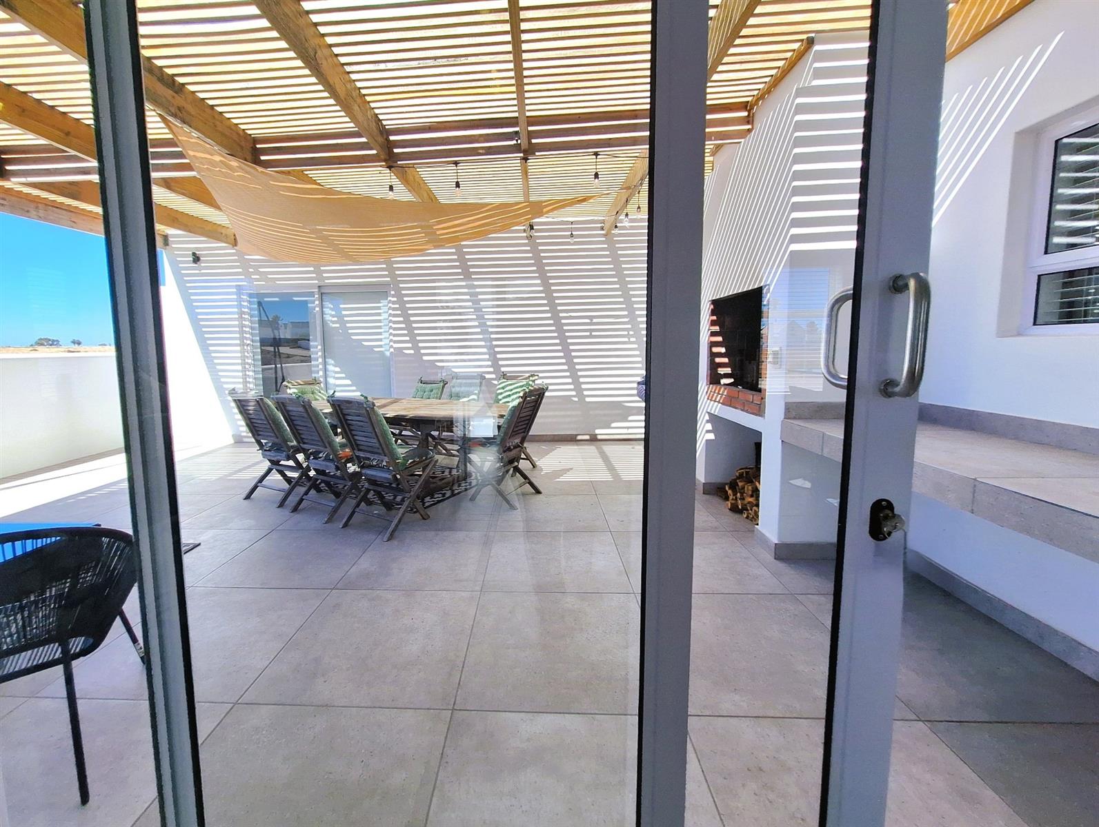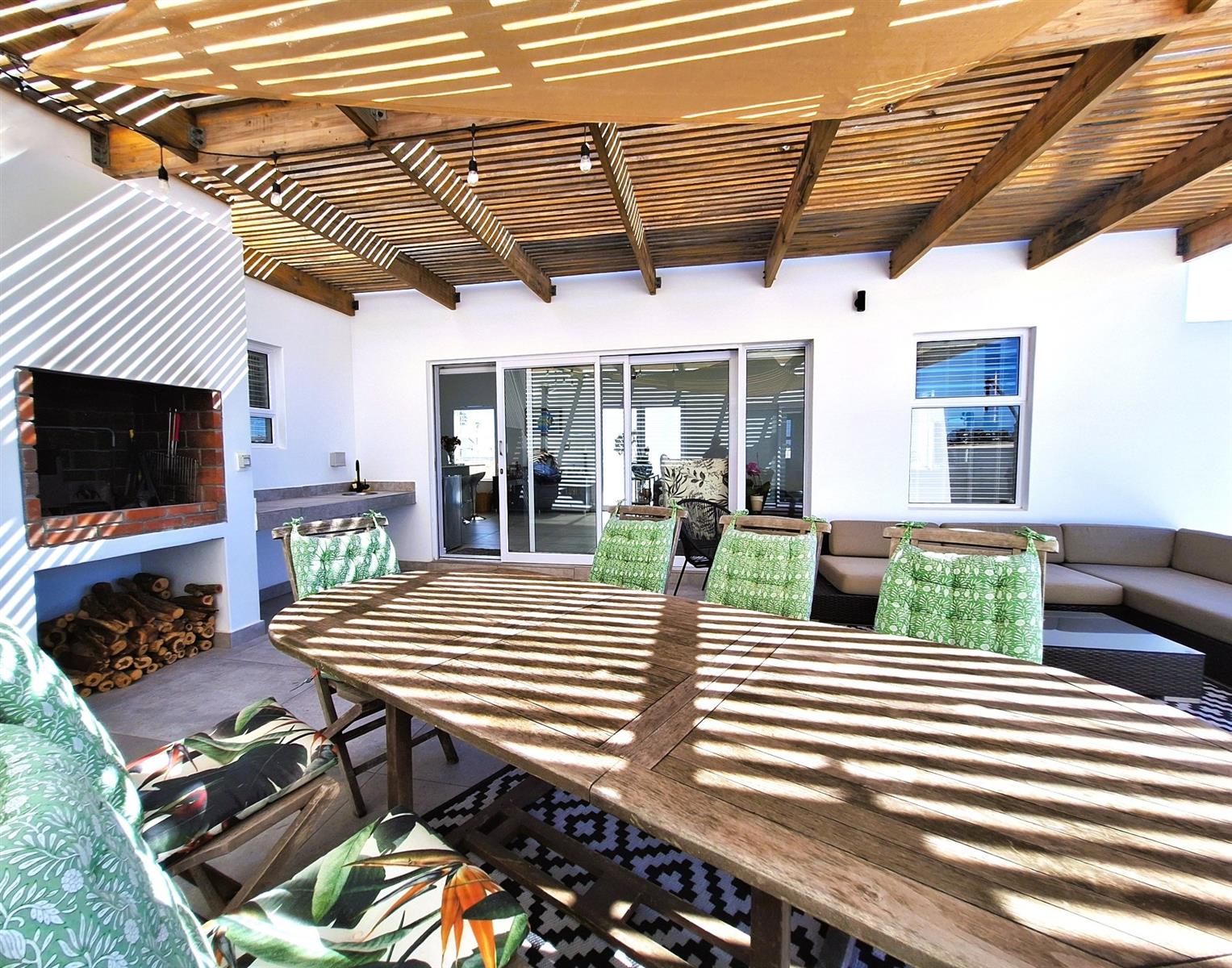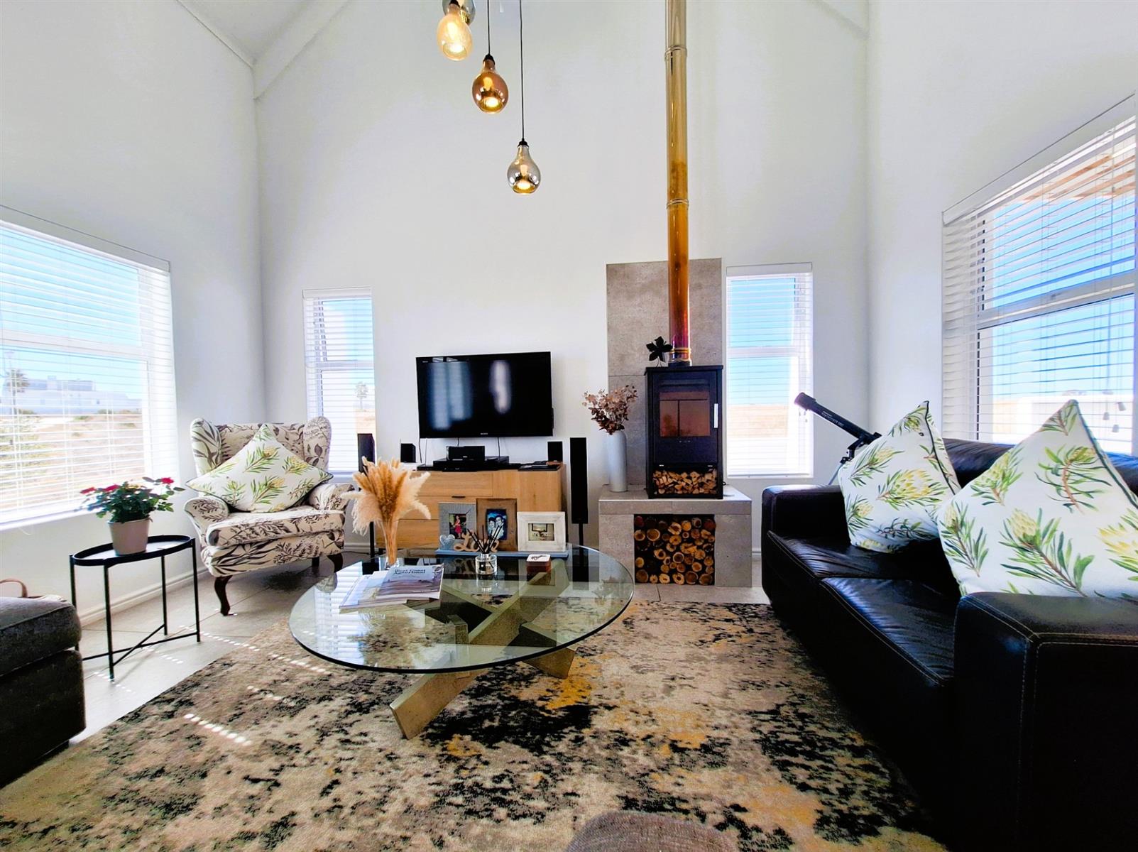 Aluminium sliding doors open from the living area to a generous outdoor braai and entertainment area, complete with a stylish wooden shade structure that allows you to bask in the sun while enjoying the fresh coastal air. This area is designed for relaxing evenings and lively gatherings. Shielded from the gusty Southeaster, this outside patio will greatly enhance your West Coast lifestyle.