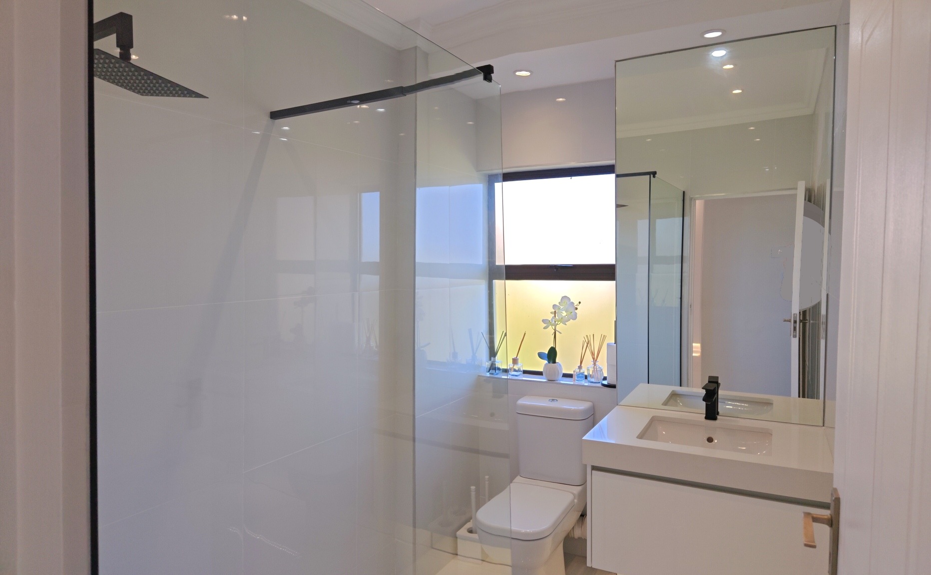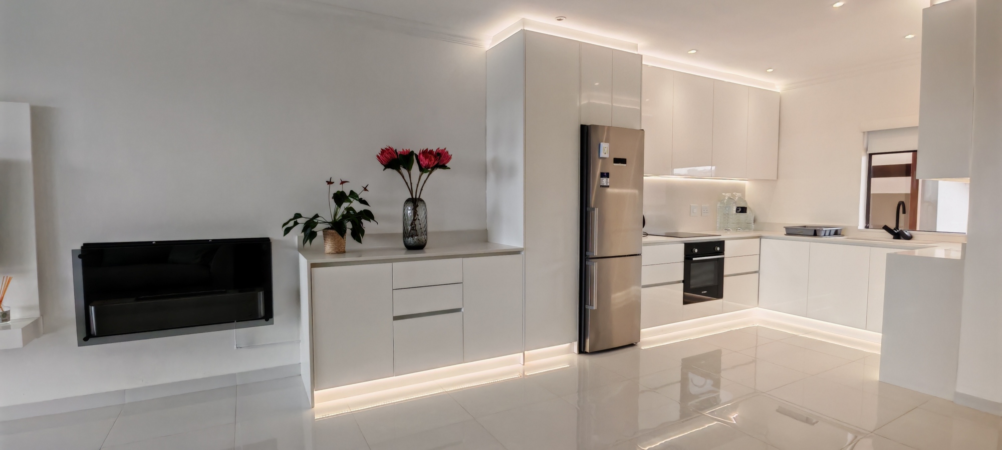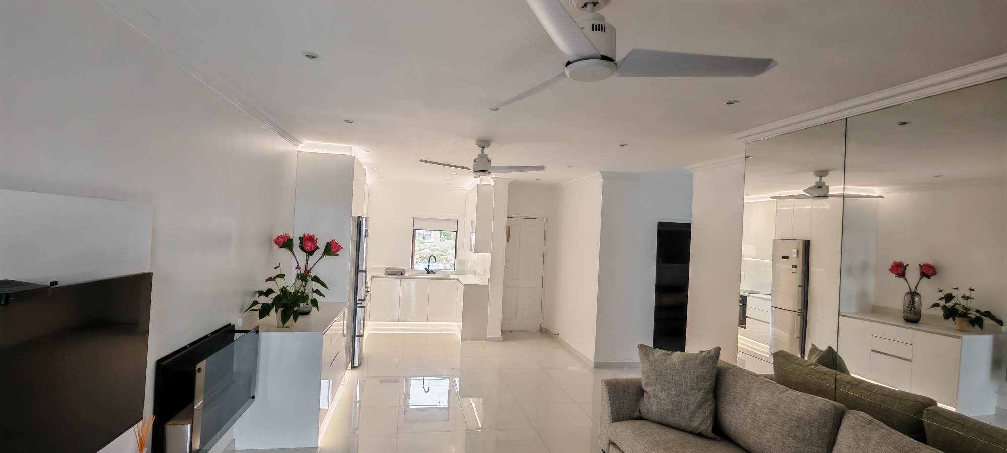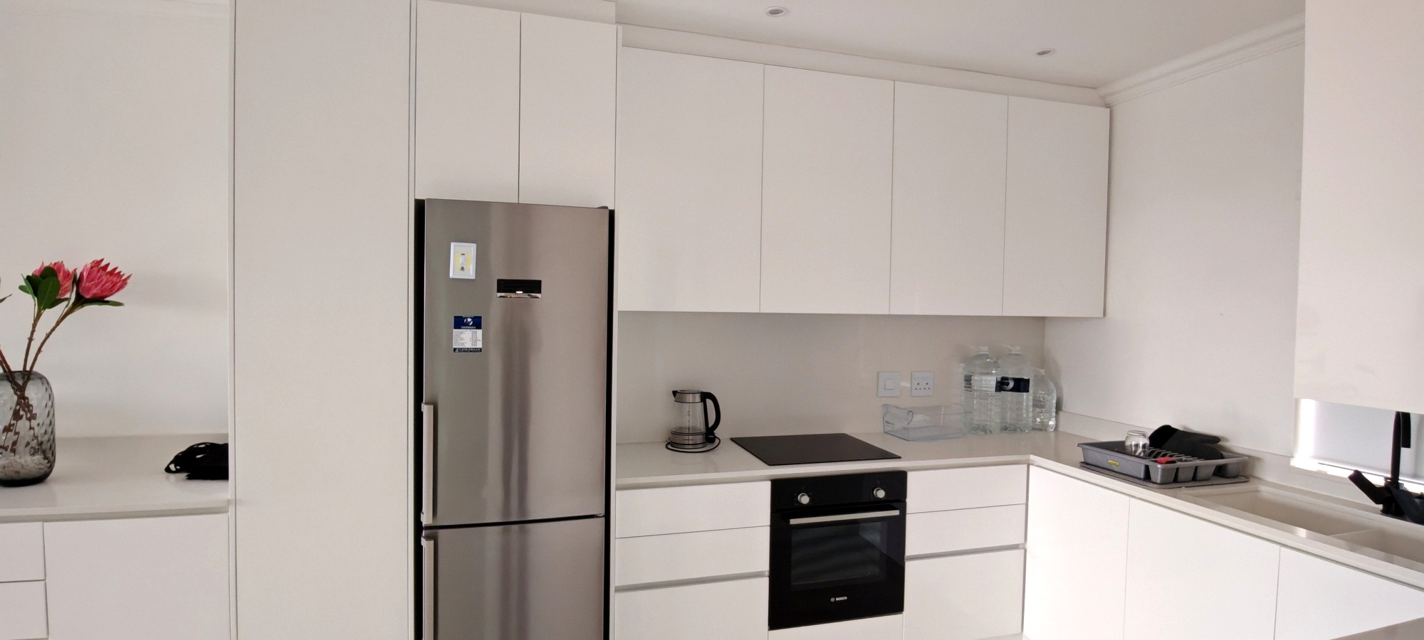 The open-plan kitchen, dining and lounge area flows seamlessly, ideal for effortless hosting and everyday comfort. The lounge features a gas fireplace, a feature mirrored wall and the apartment is complimented by an inverter and solar system for energy efficiency and peace of mind. Entertainment is effortless with a TV, WiFi and soft lighting throughout. The kitchen features quartz countertops Bosch electric oven and hob and extractor, while the entire apartment has high-end decor.