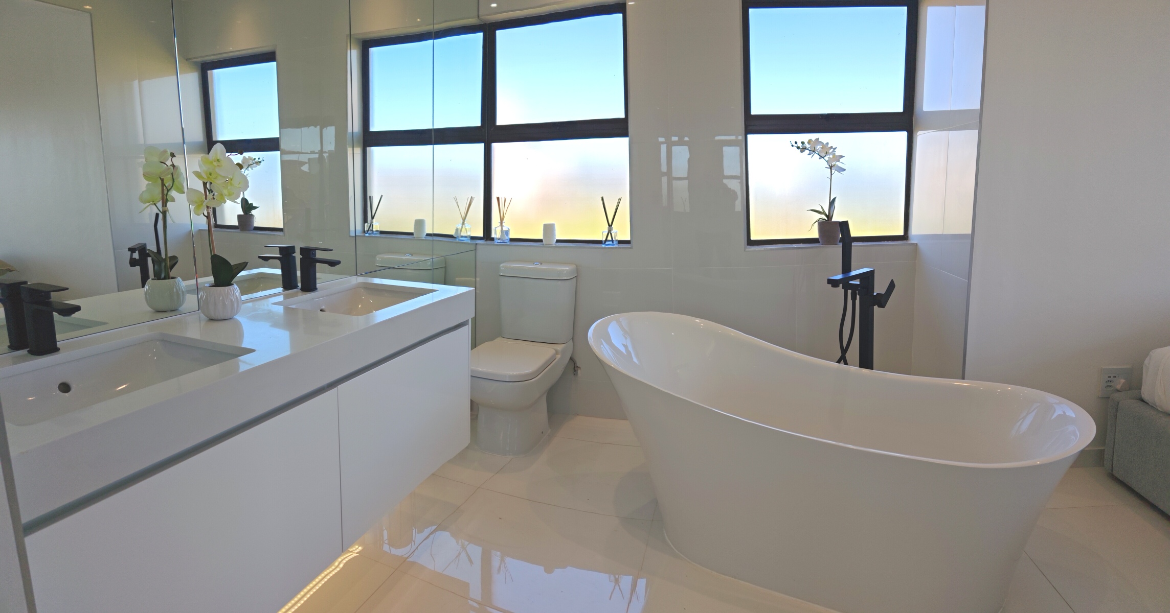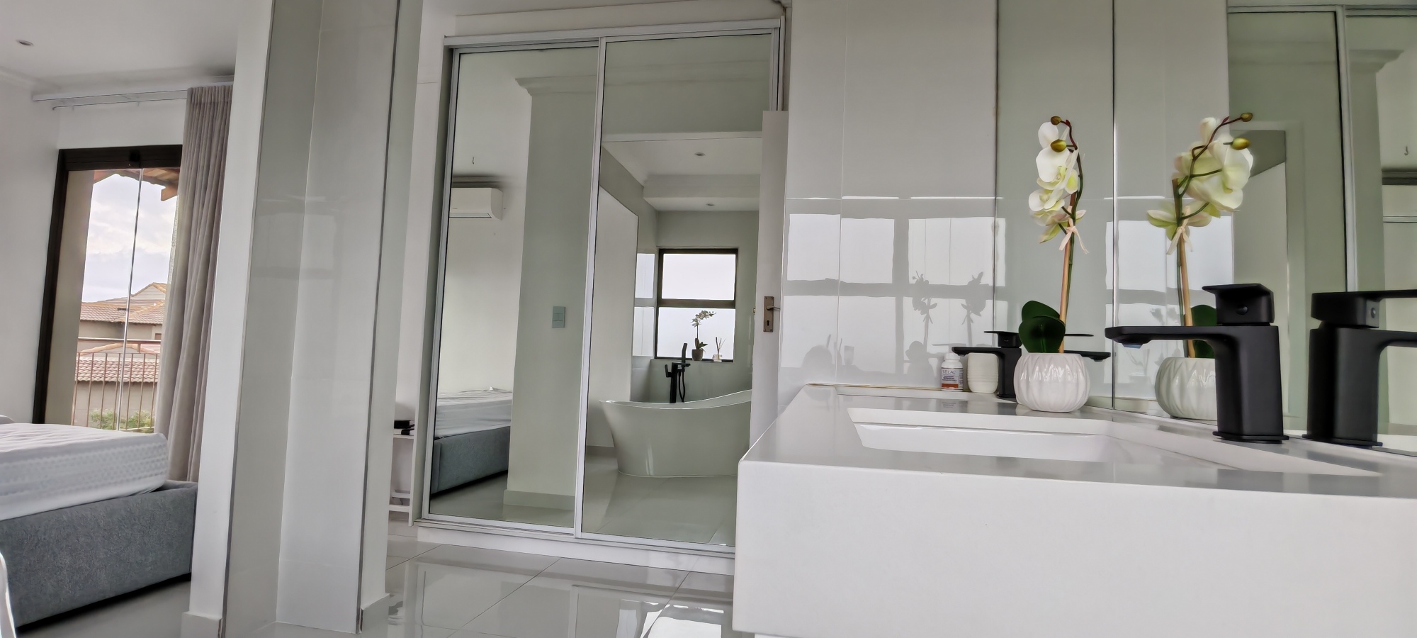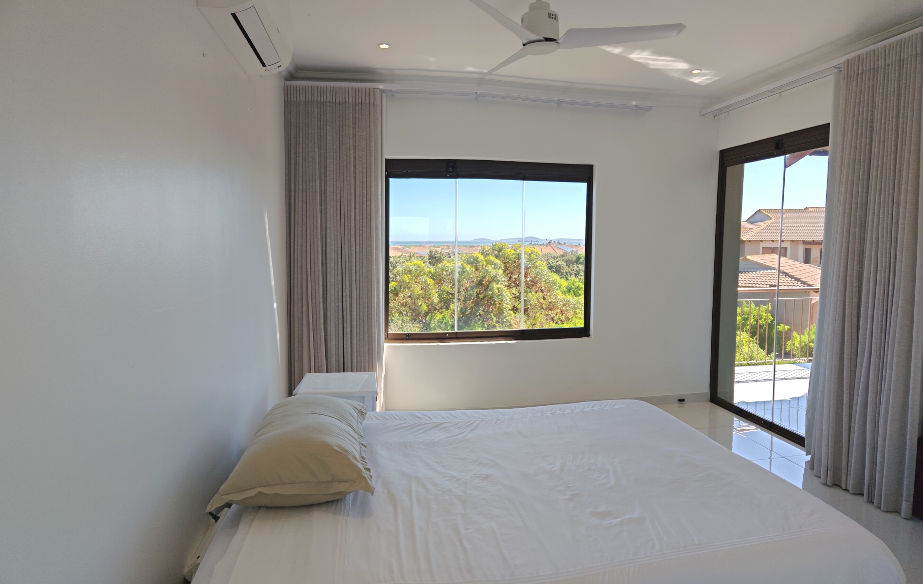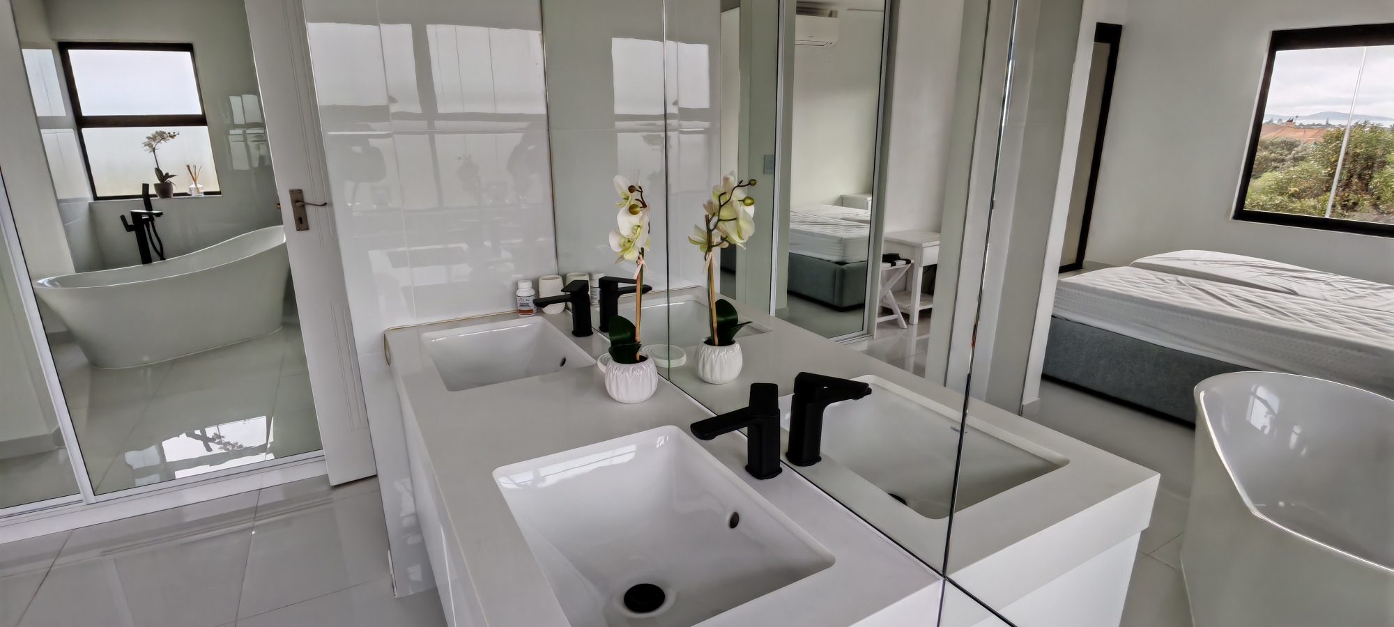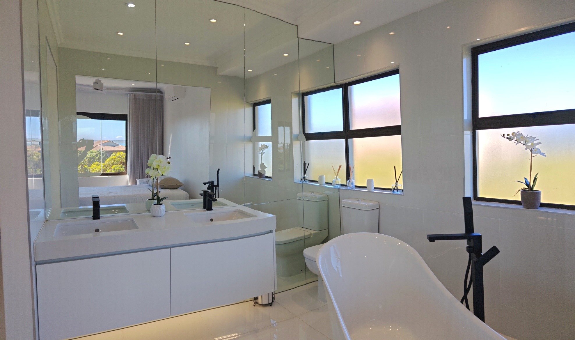 The main bedroom and open plan bathroom design, offers a luxurious feel, with double vanities, a free-standing bath, air conditioner and overhead fan for year-round climate control.