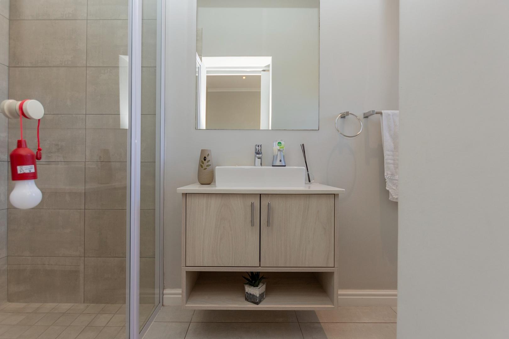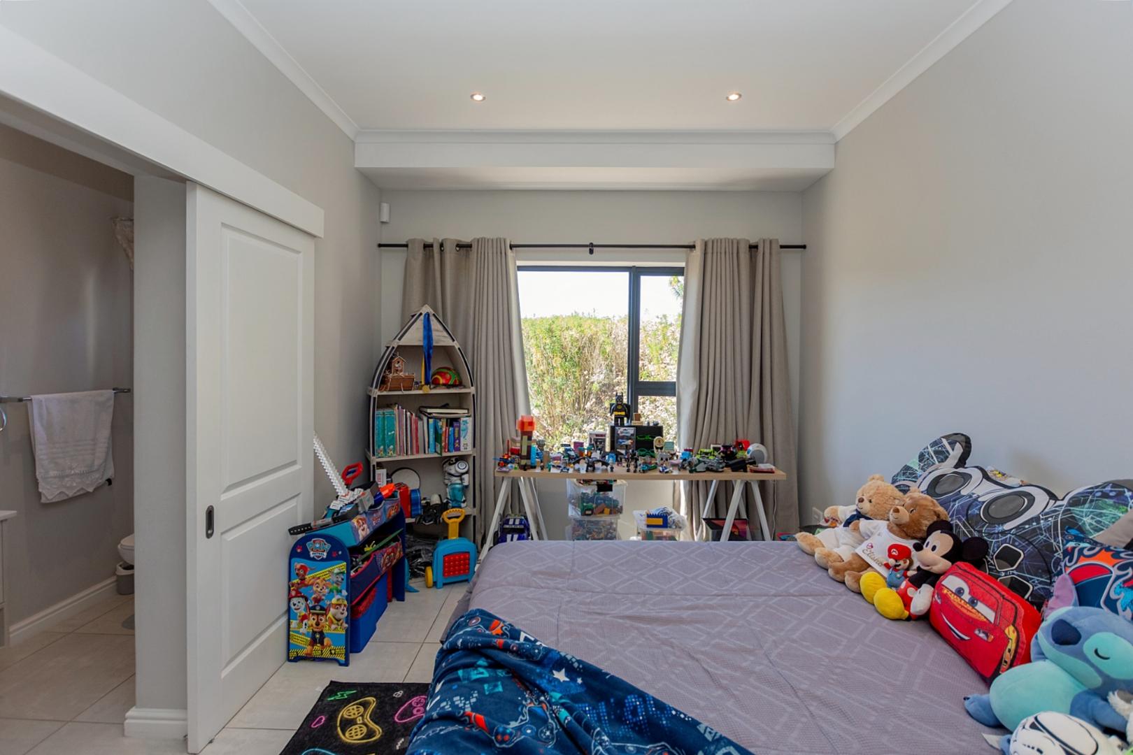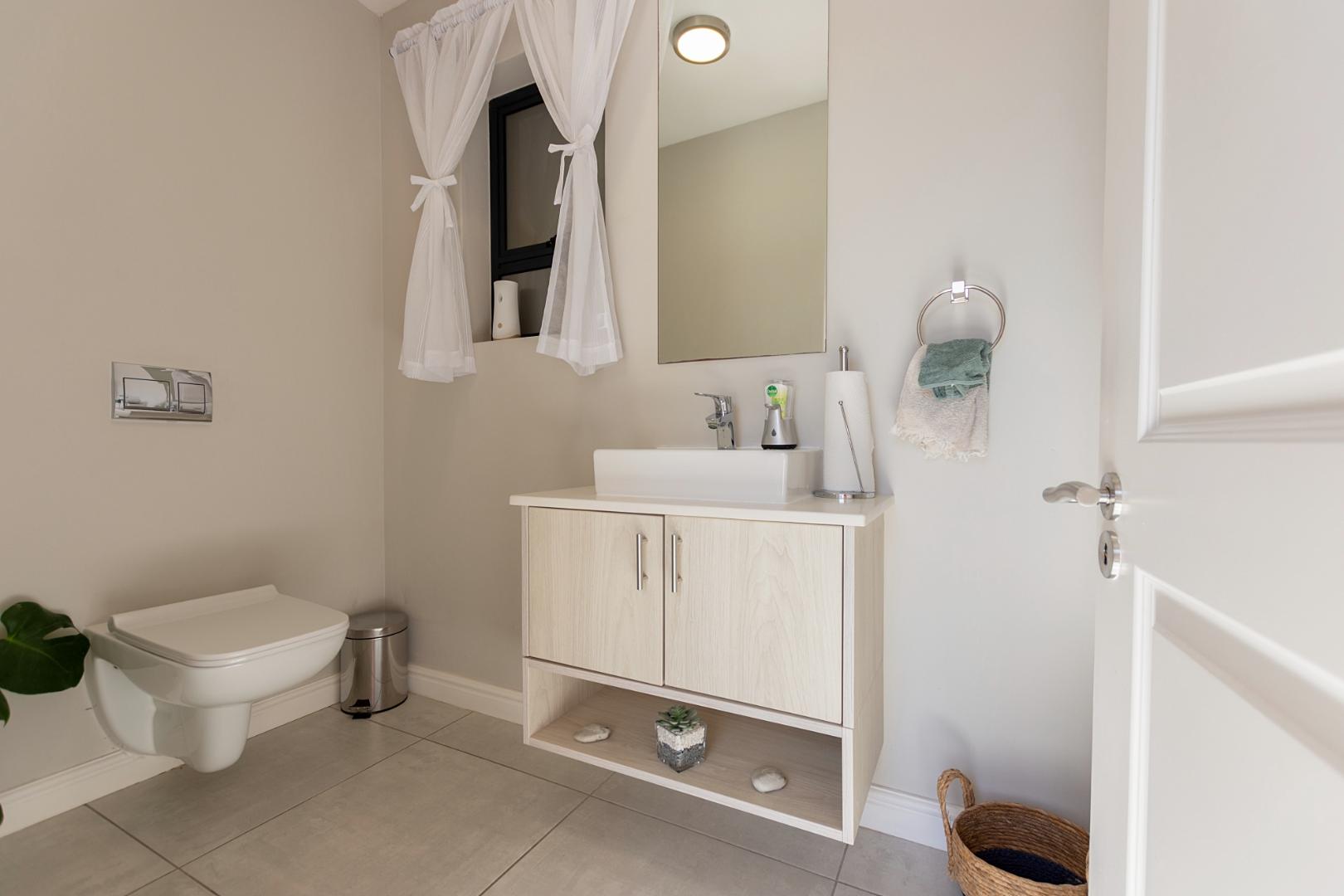 A guest bathroom is conveniently positioned along the passage. The north-facing bedroom wing features a spacious main suite with a walk-through cupboard and full en-suite bathroom. Two additional en-suite bedrooms provide privacy and comfort for family or guests.