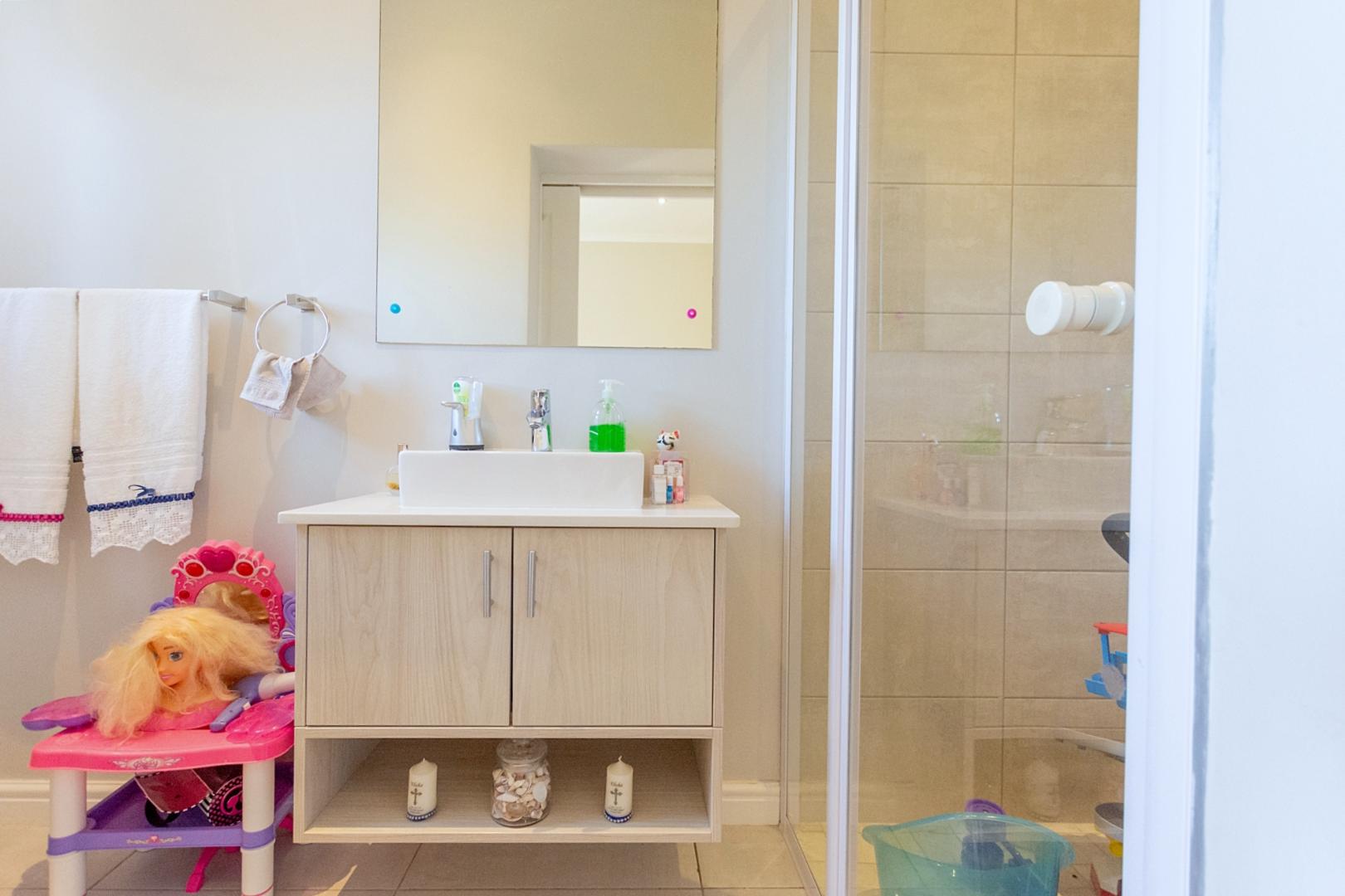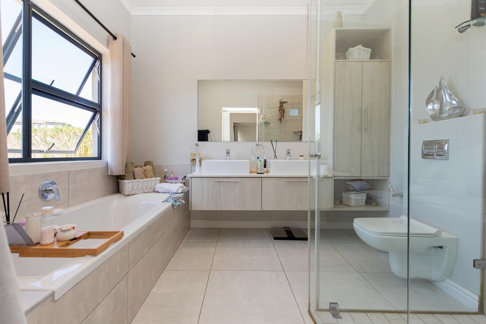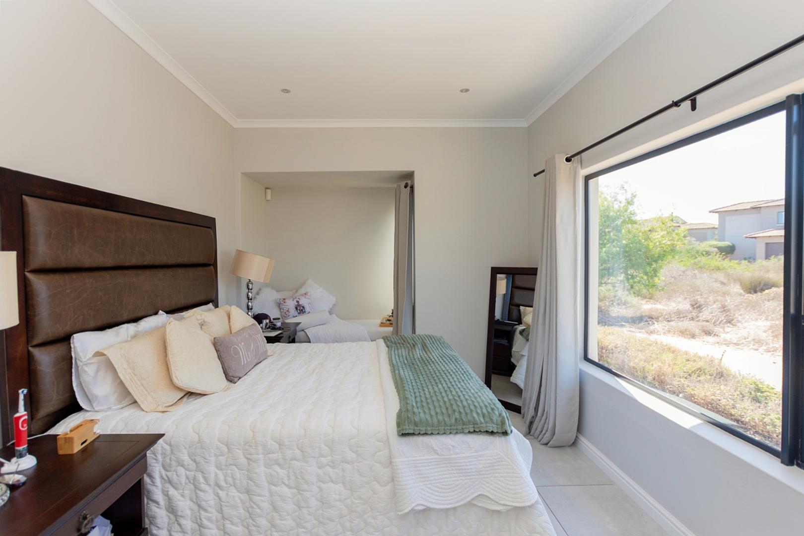 A guest bathroom is conveniently positioned along the passage. The north-facing bedroom wing features a spacious main suite with a walk-through cupboard and full en-suite bathroom. Two additional en-suite bedrooms provide privacy and comfort for family or guests.