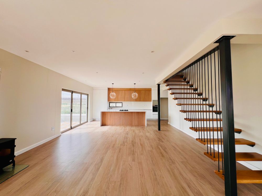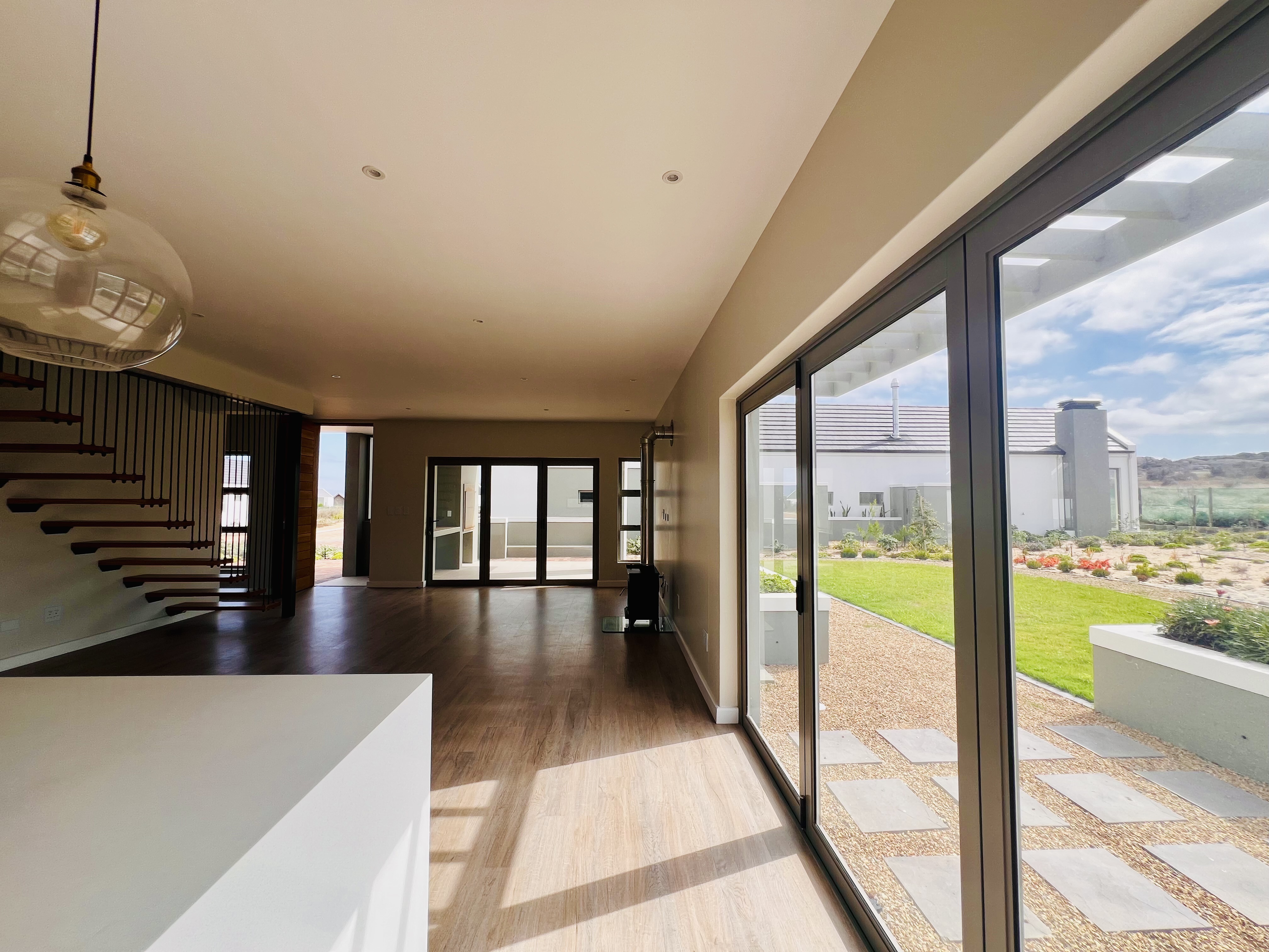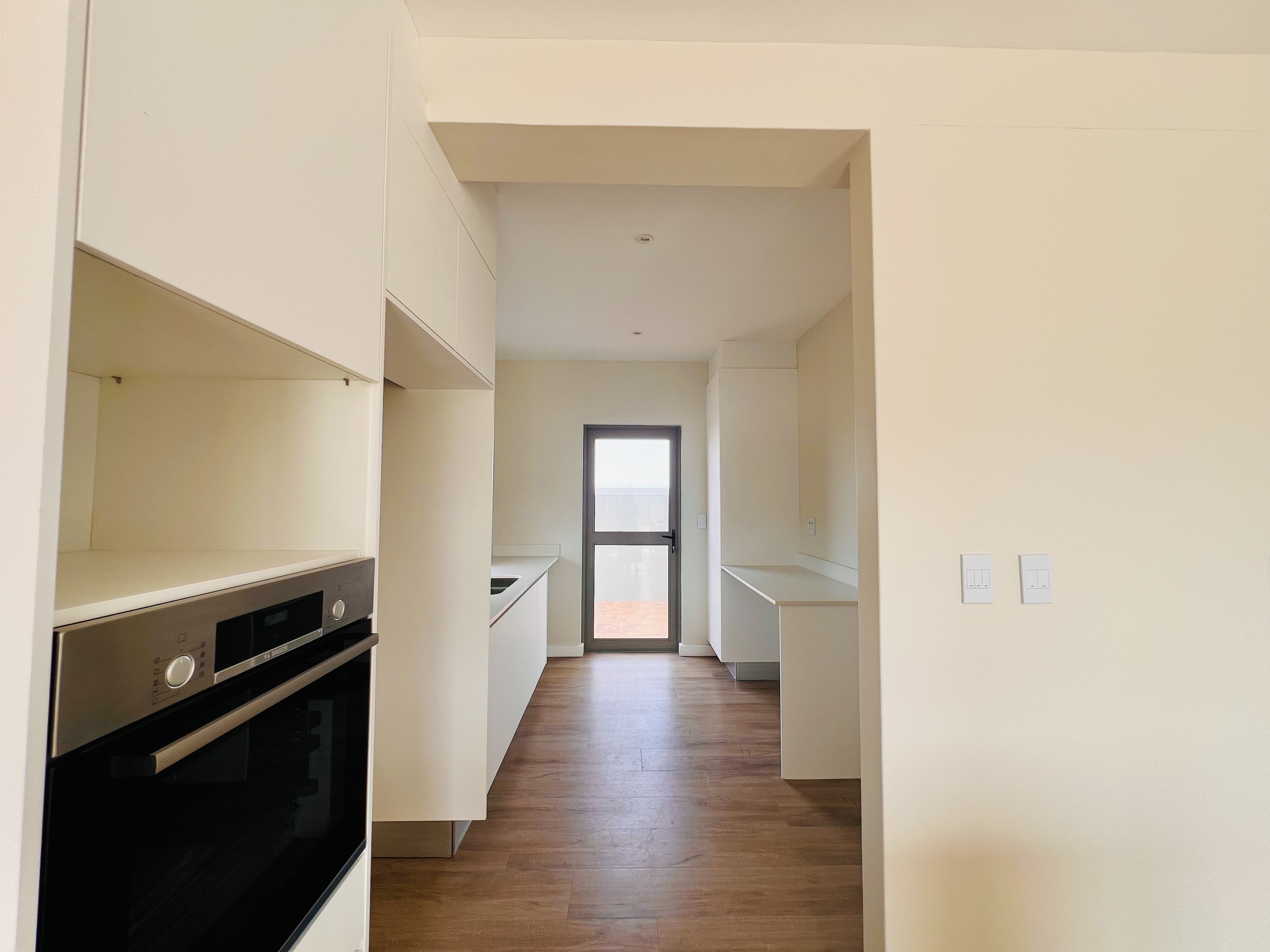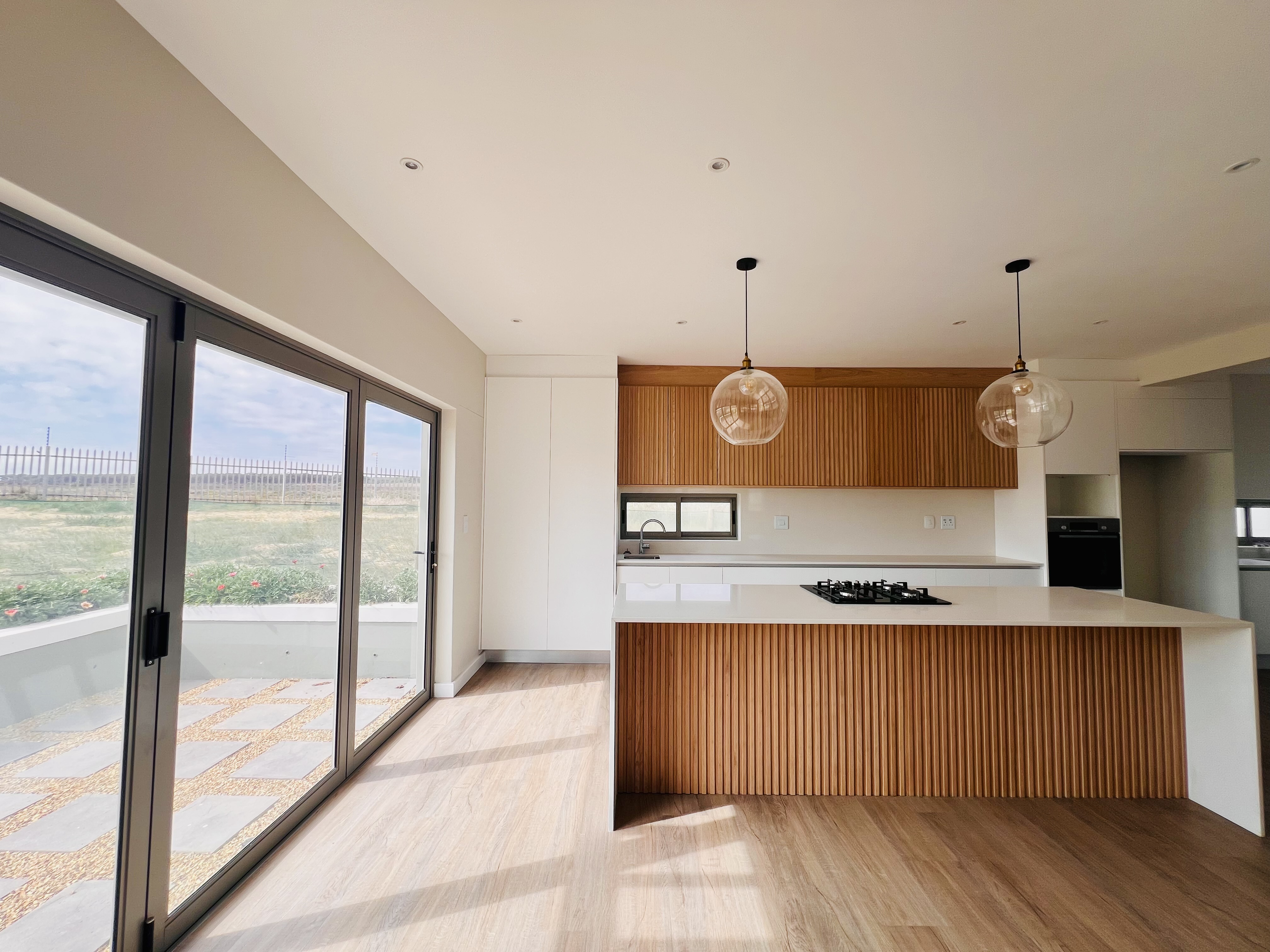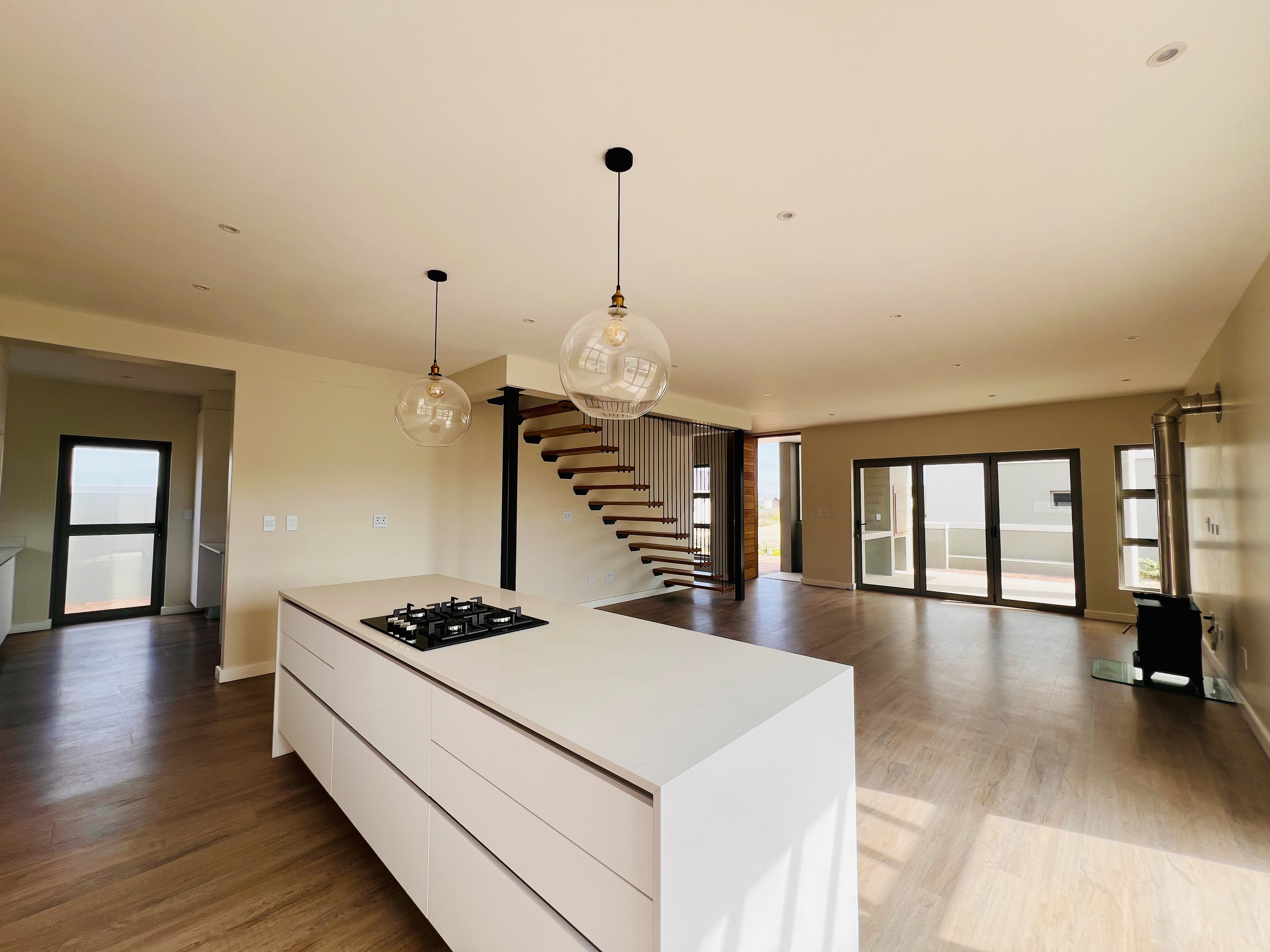 Designed for effortless modern living, this 3-bedroom home welcomes you with a spacious open-plan layout that flows seamlessly from the kitchen to the lounge and dining area. Whether you're hosting lively gatherings or enjoying a quiet evening, this space is made for connection and comfort. The kitchen is both stylish and functional, featuring a sleek Caesarstone center island, a gas hob, an eye-level oven, and custom-built soft-close cupboards and drawers. A separate scullery and laundry room keep things neat, with direct access to a private drying courtyard.