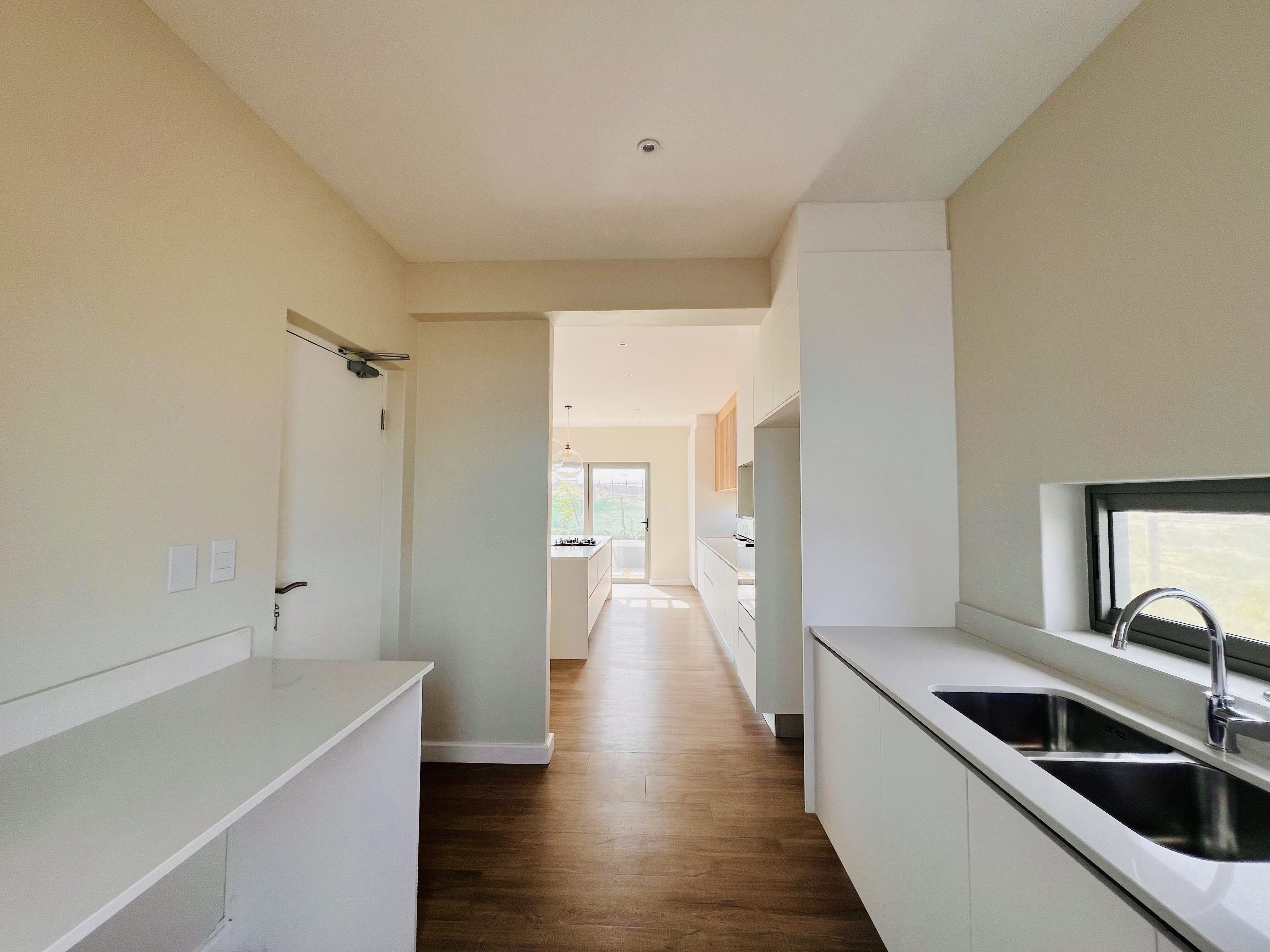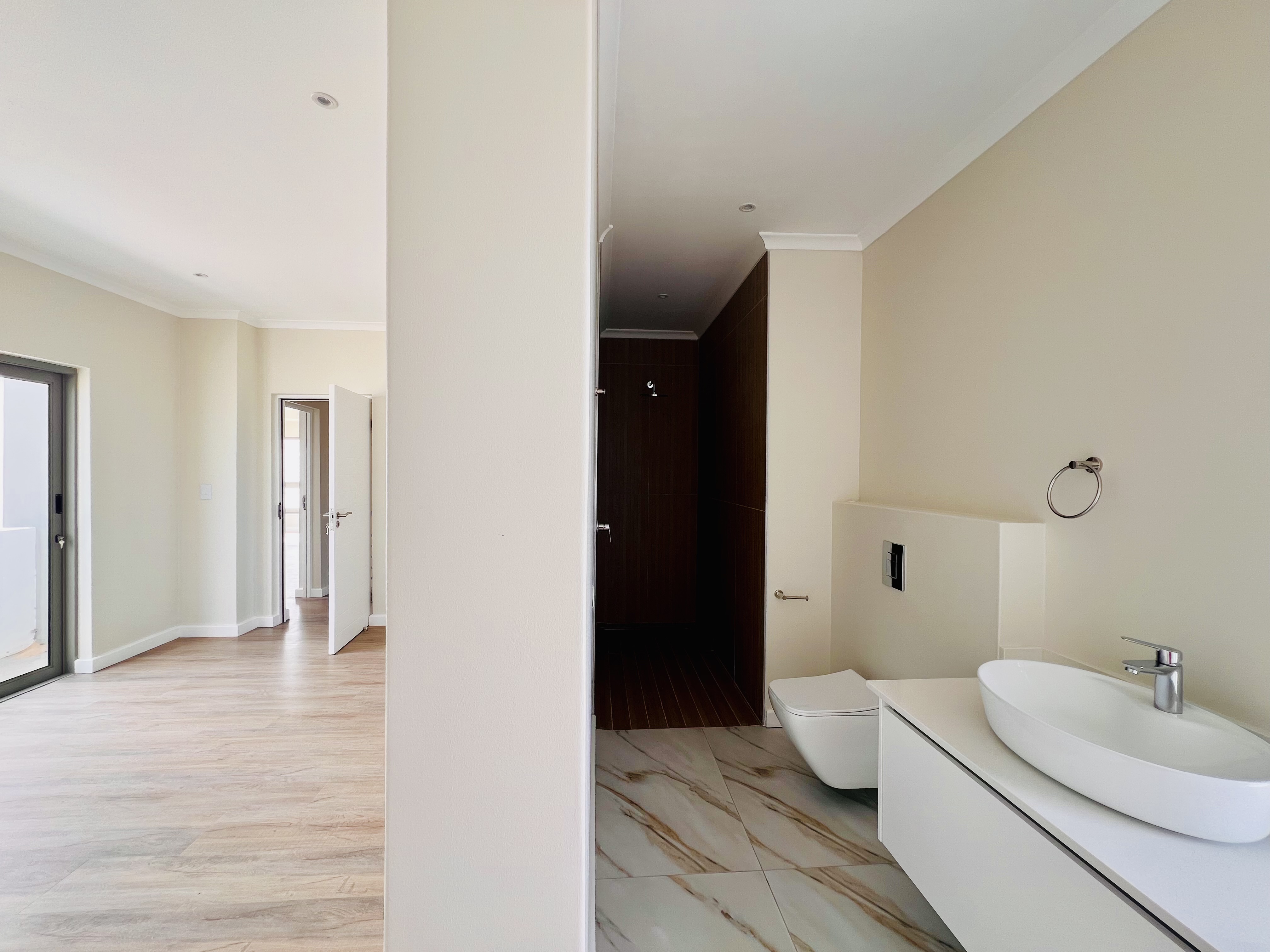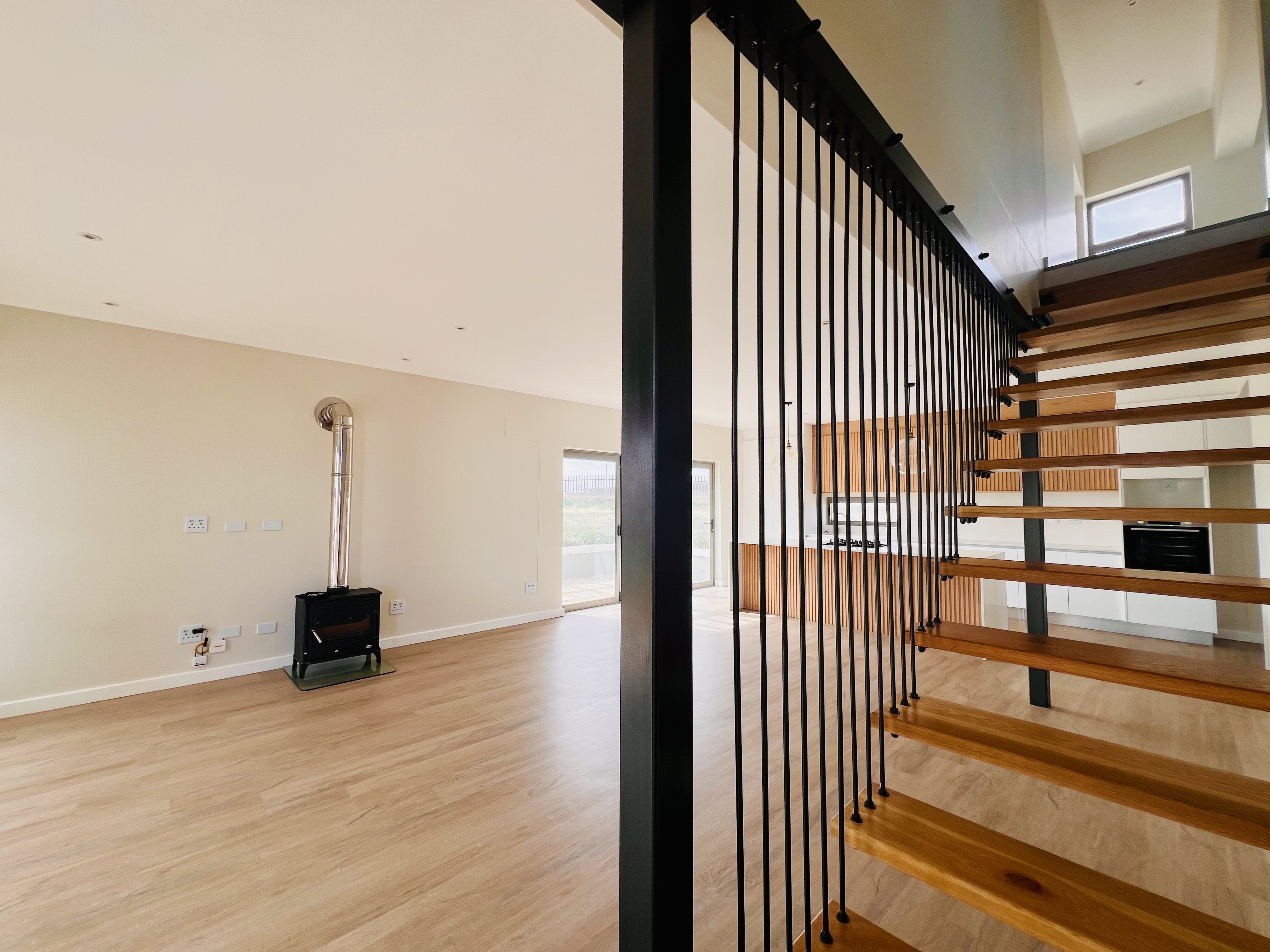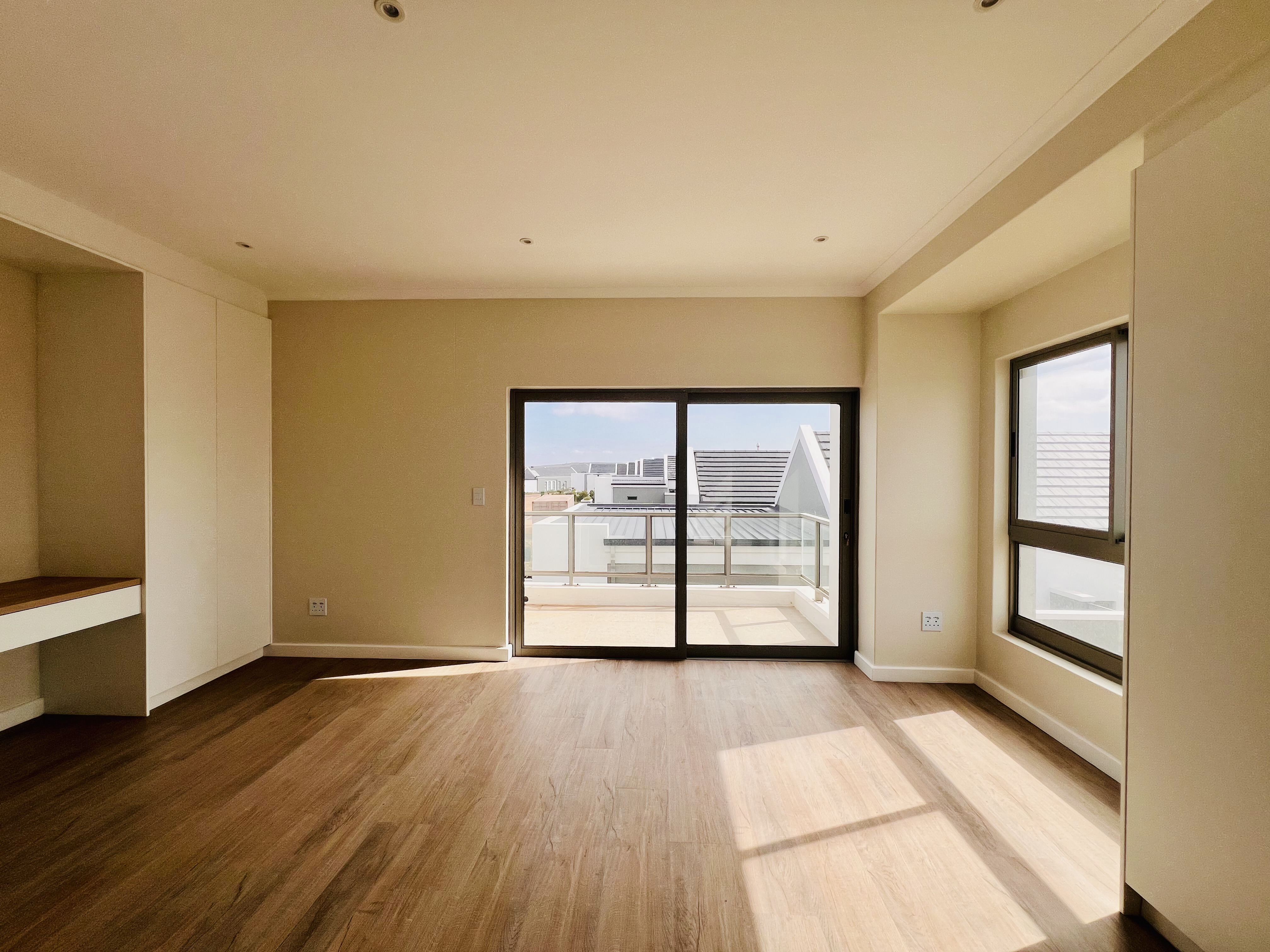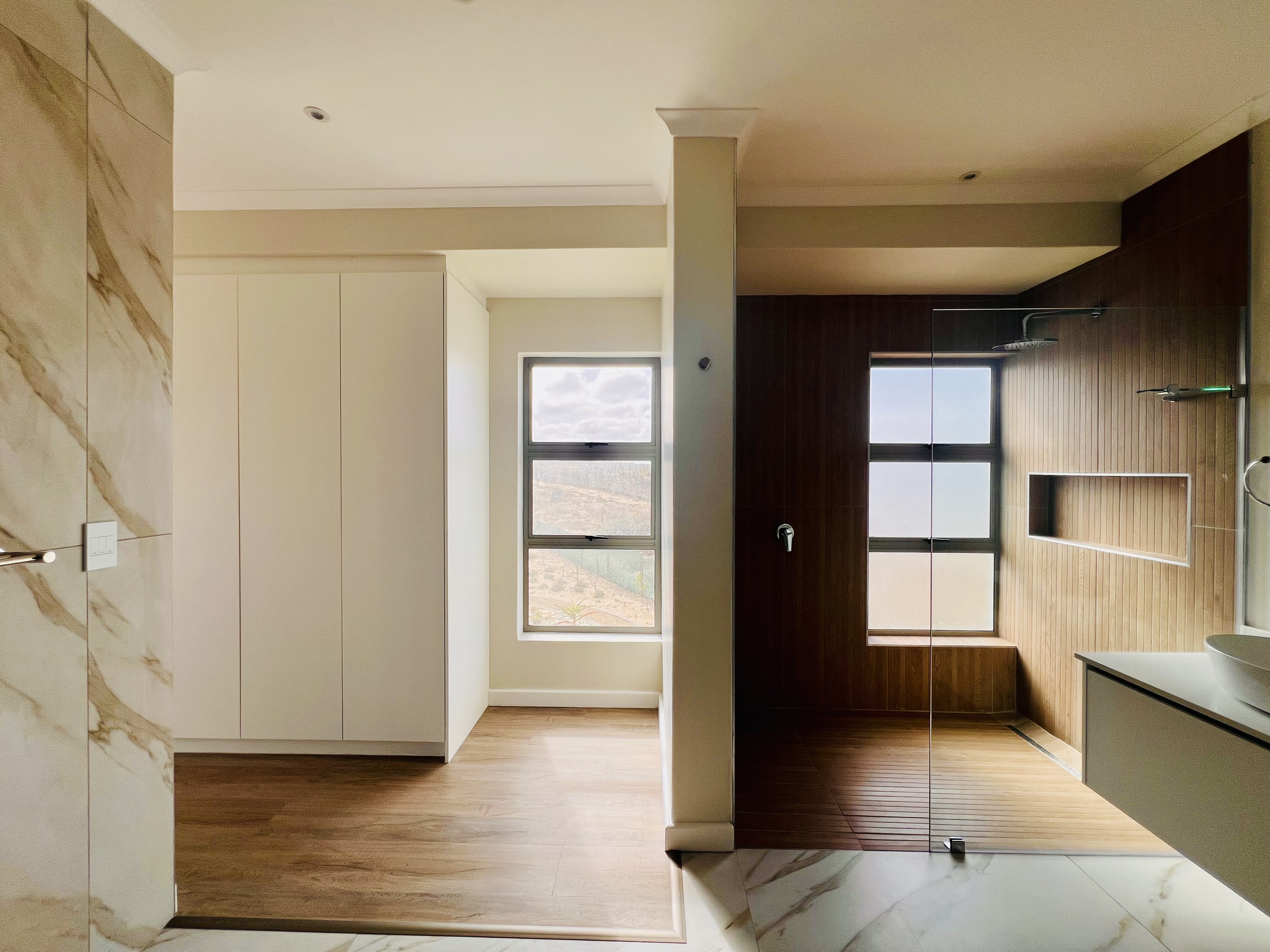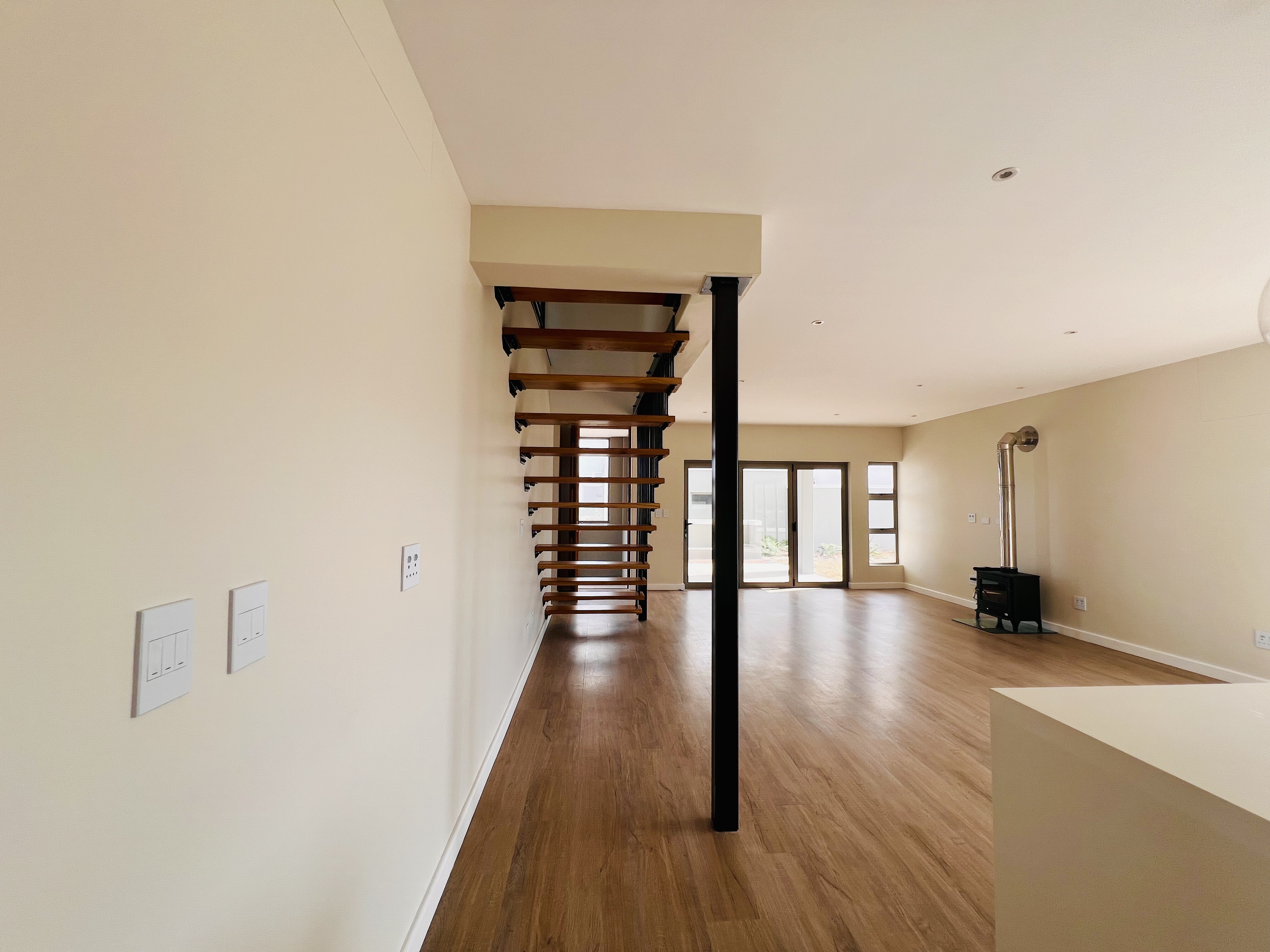 Designed for effortless modern living, this 3-bedroom home welcomes you with a spacious open-plan layout that flows seamlessly from the kitchen to the lounge and dining area. Whether you're hosting lively gatherings or enjoying a quiet evening, this space is made for connection and comfort. The kitchen is both stylish and functional, featuring a sleek Caesarstone center island, a gas hob, an eye-level oven, and custom-built soft-close cupboards and drawers. A separate scullery and laundry room keep things neat, with direct access to a private drying courtyard.