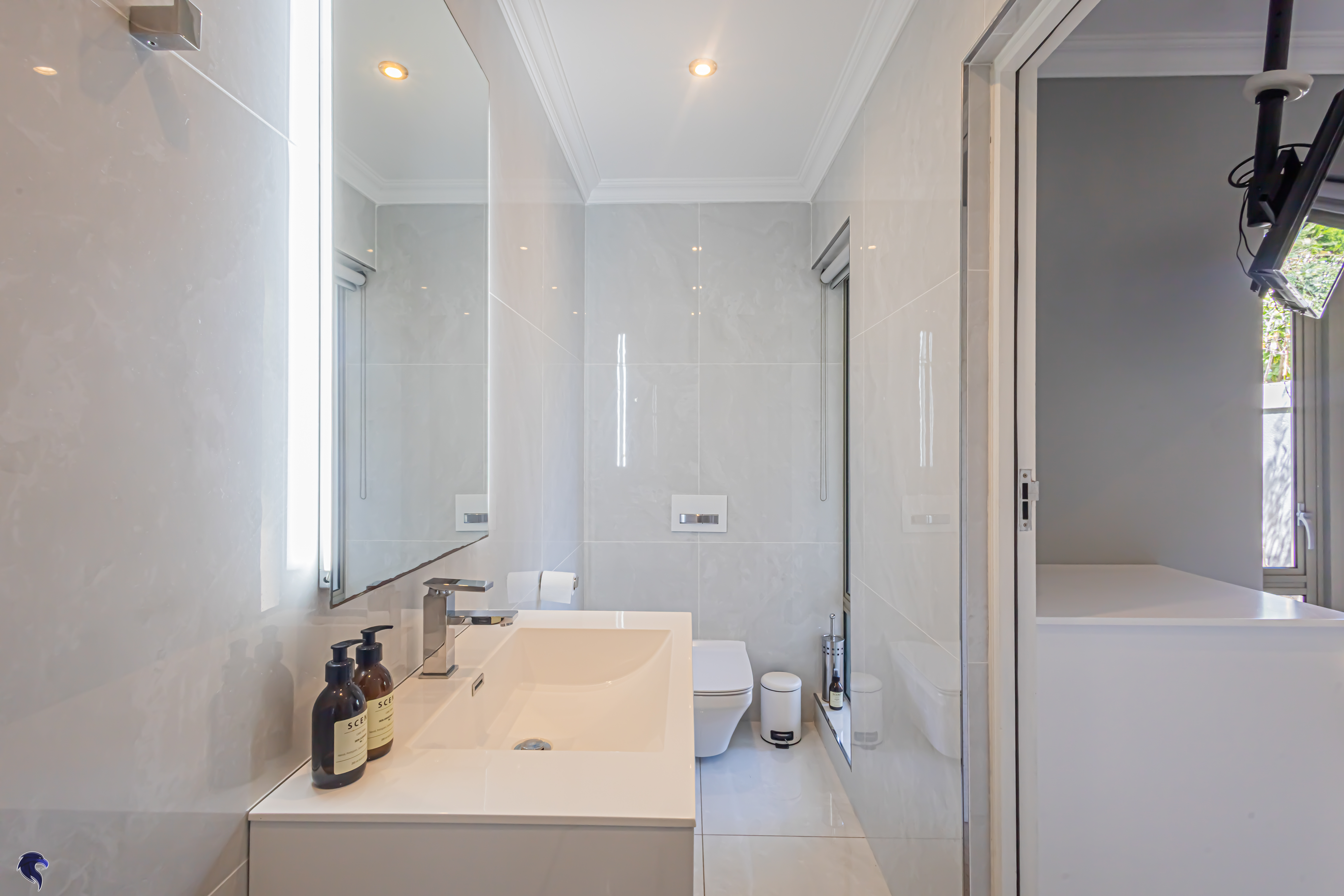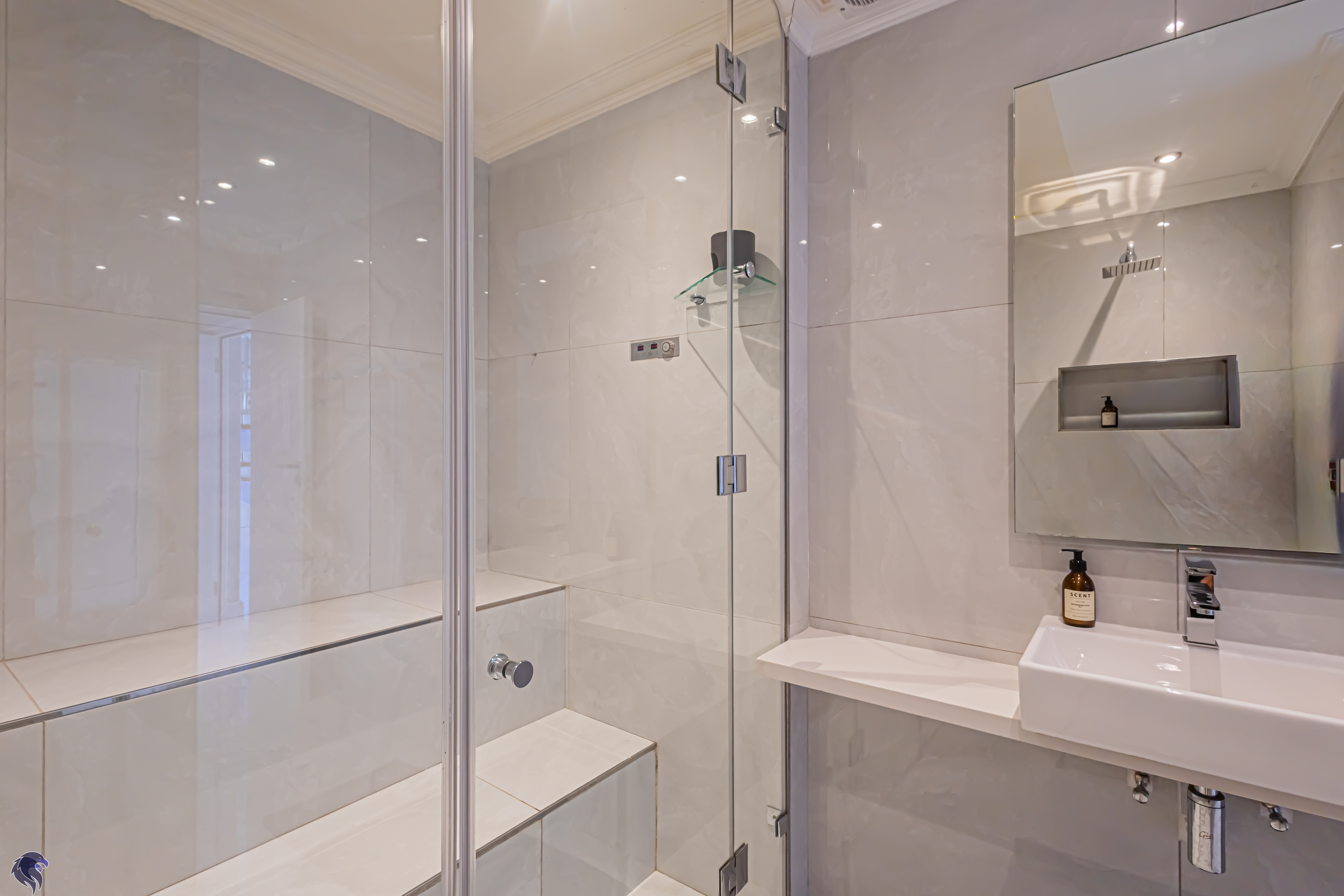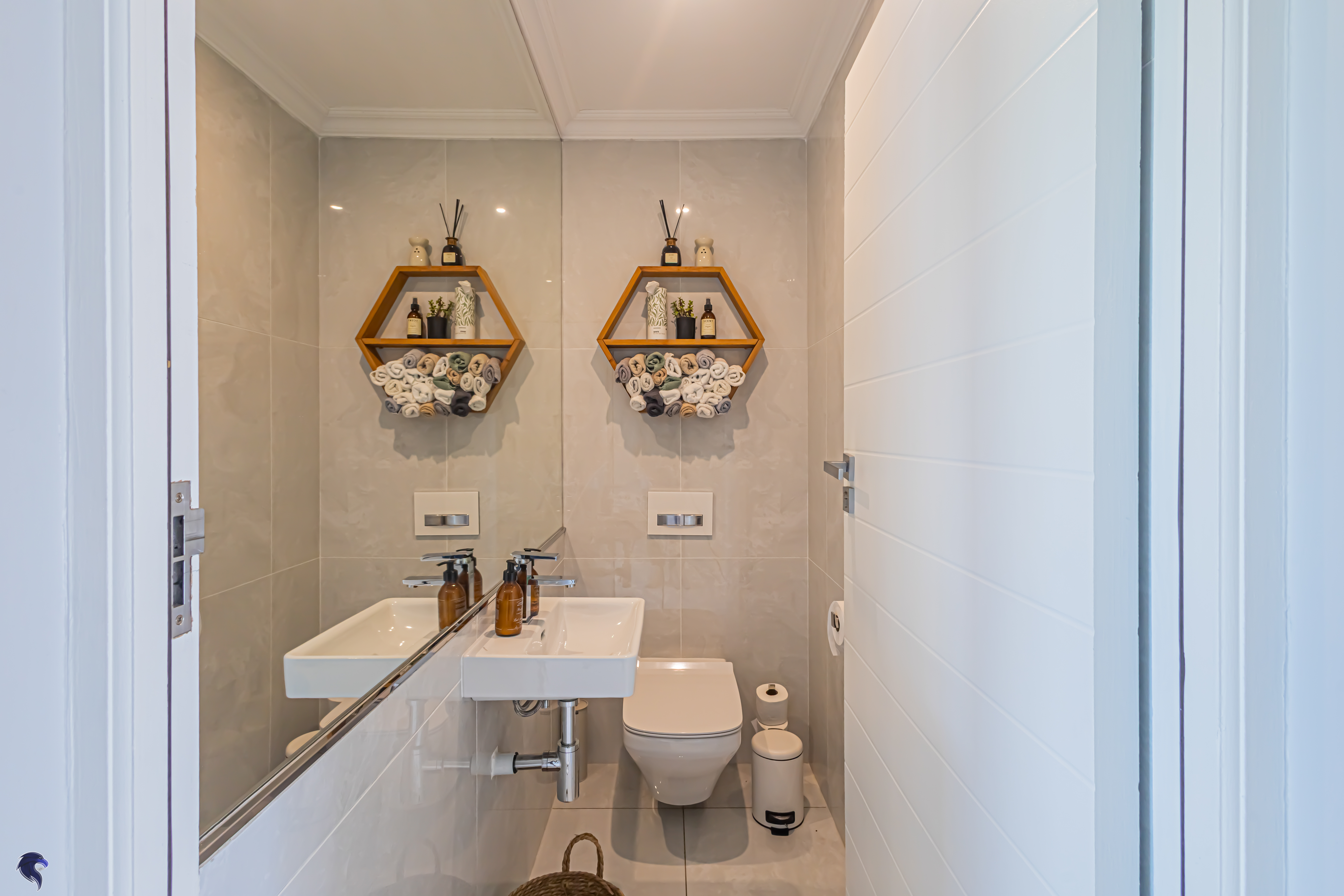 Downstairs, you’ll find four en-suite bedrooms — each carpeted, air-conditioned, and fitted with integrated B&W speakers for that touch of quiet luxury. The bathrooms are modern and elegant, and there’s a handy guest loo too.