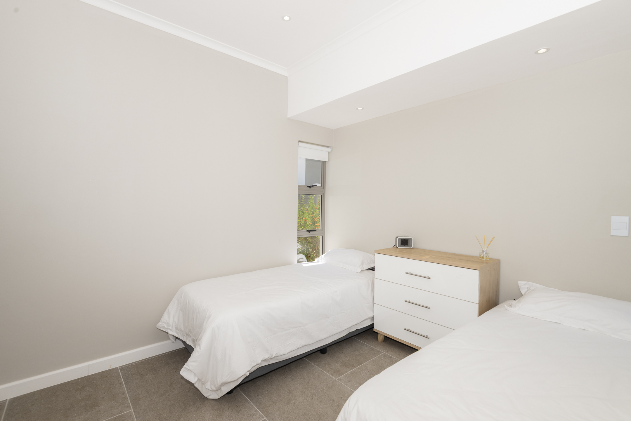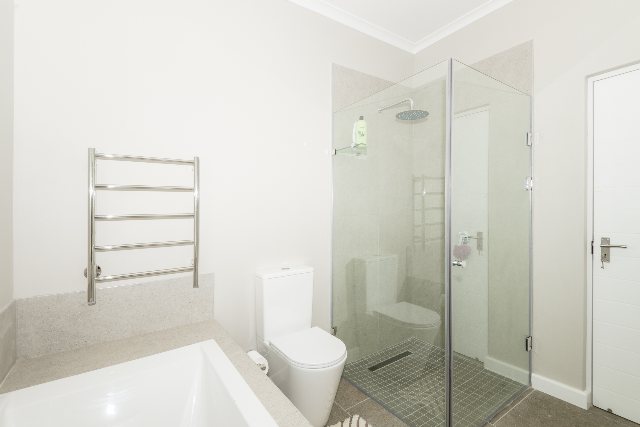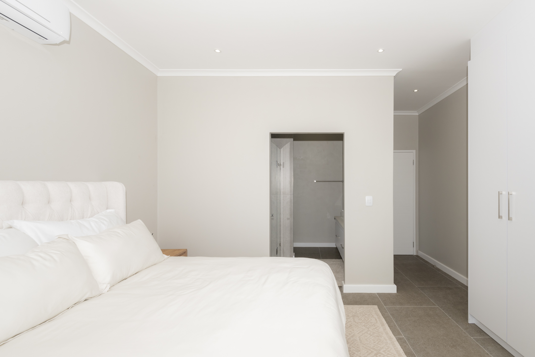 The main bedroom is all about comfort, with a full en-suite bathroom, double vanity, and sliding door access to the garden — ideal for morning coffee or quiet moments outdoors. The two guest bedrooms are well-sized and share a sleek, modern bathroom.