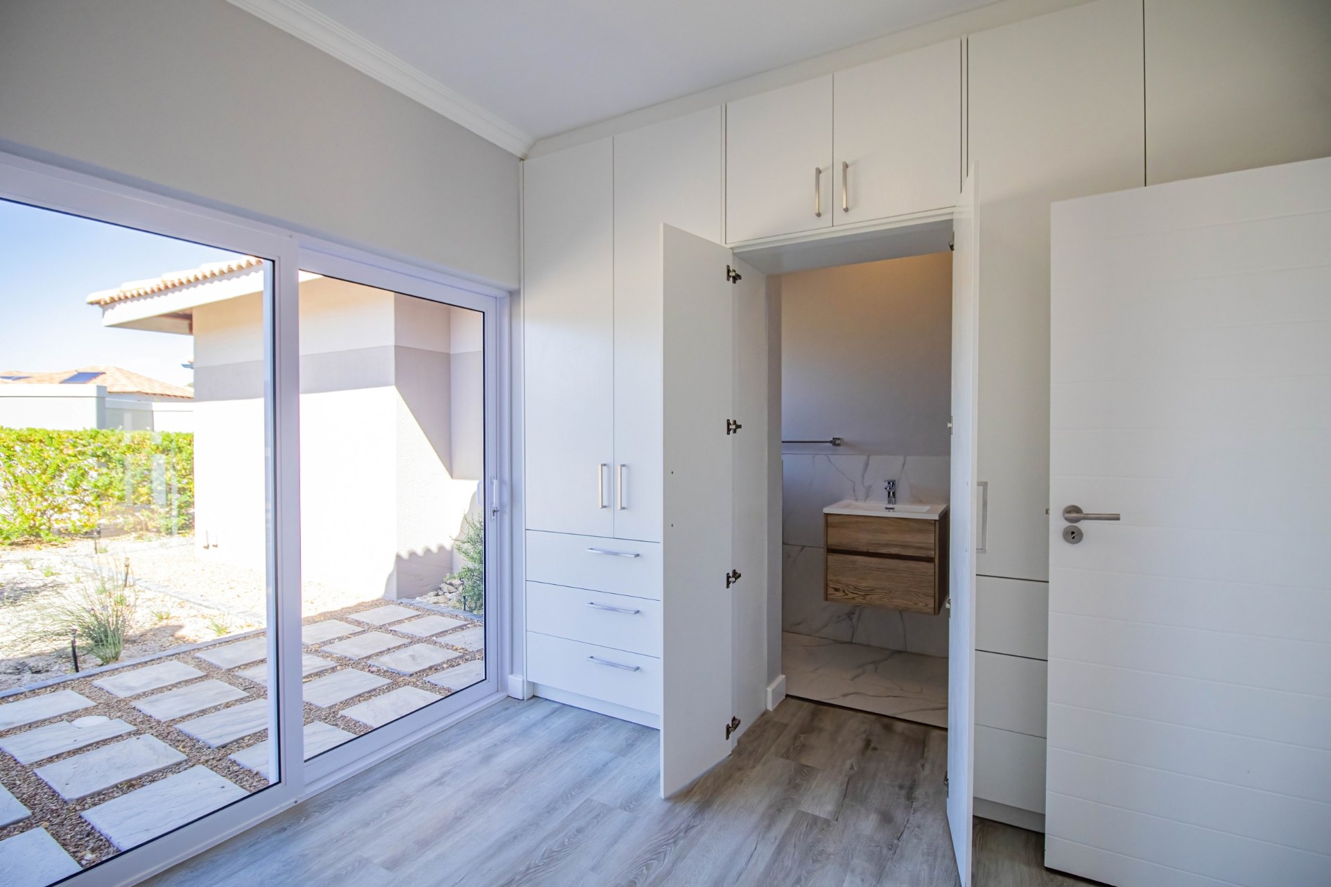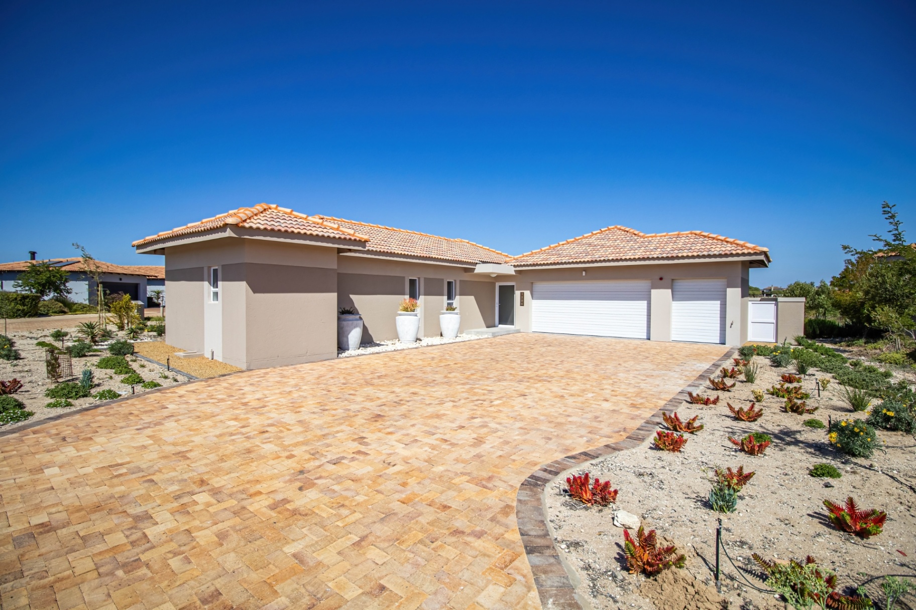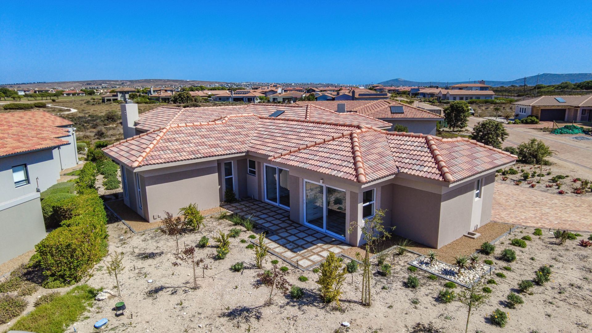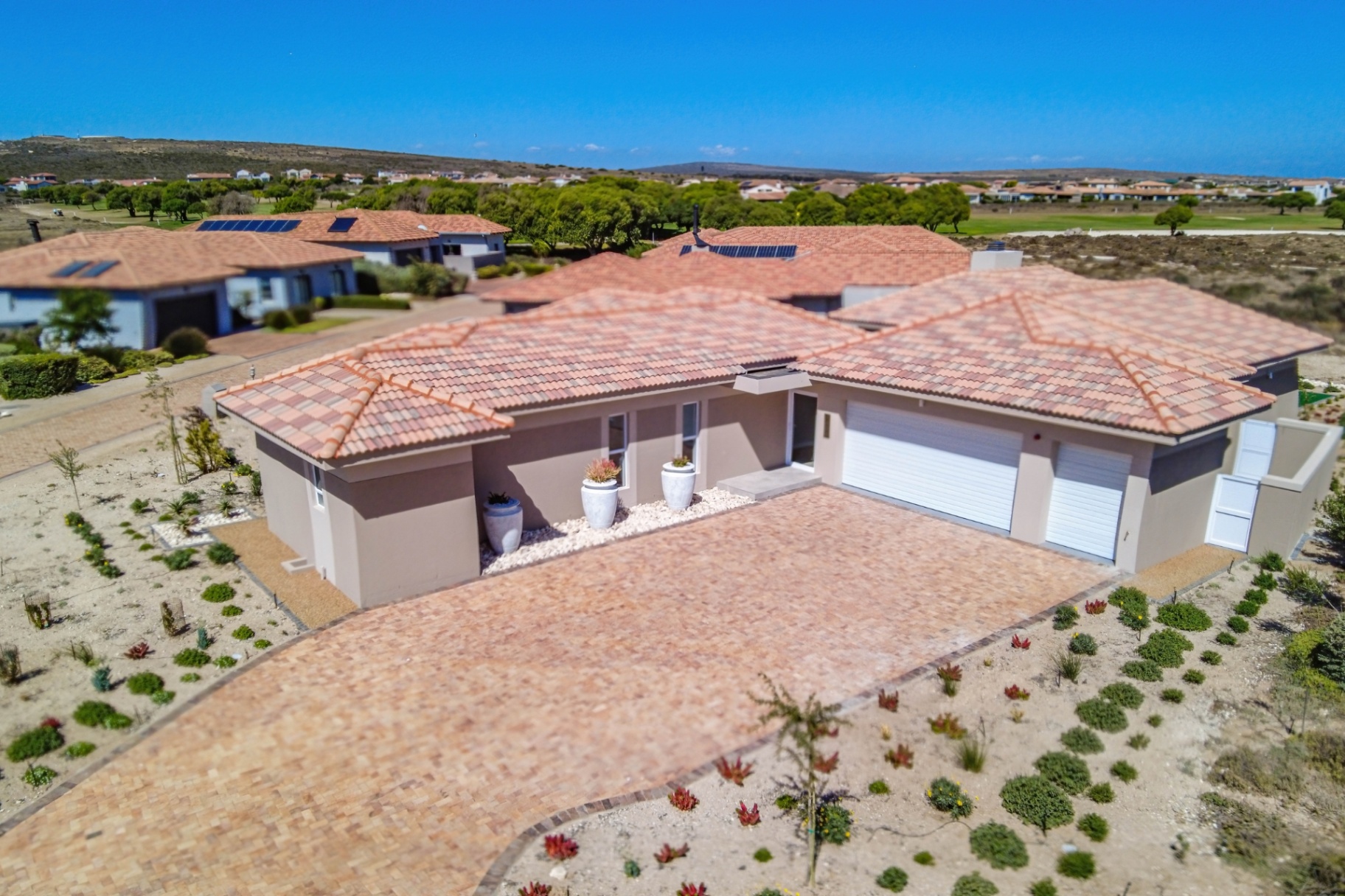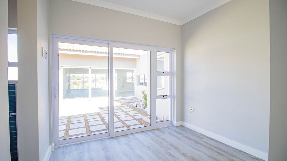 This beautifully designed home, situated in the sought-after Langebaan Country Estate, offers four spacious bedrooms, each with its own en-suite bathroom and built-in cupboards, plus a separate guest toilet.