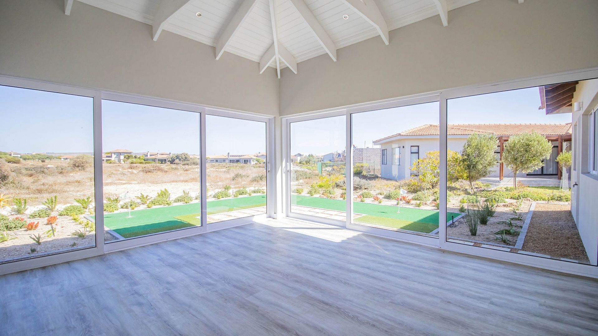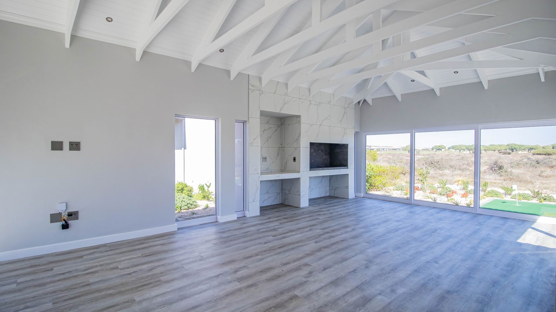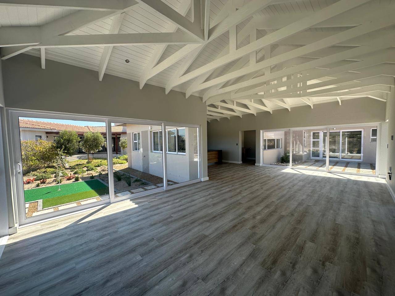 The home is bright and contemporary, featuring open trusses, large windows, and sliding doors that allow for an abundance of natural light throughout.