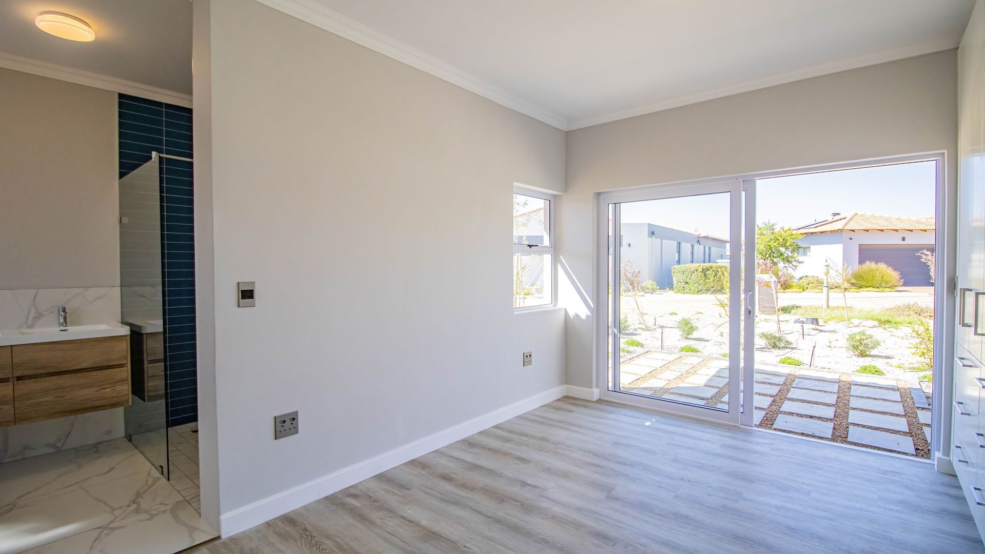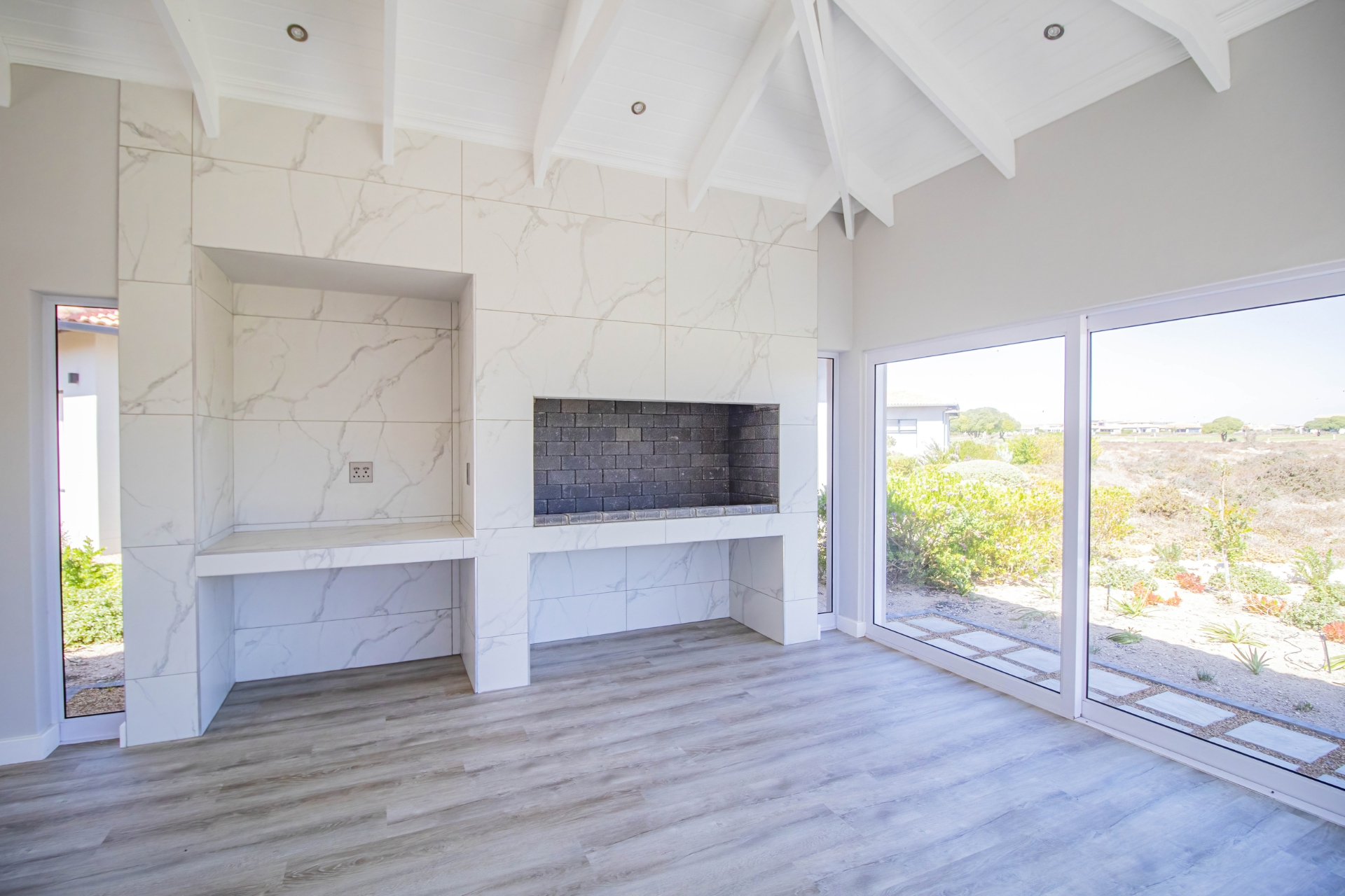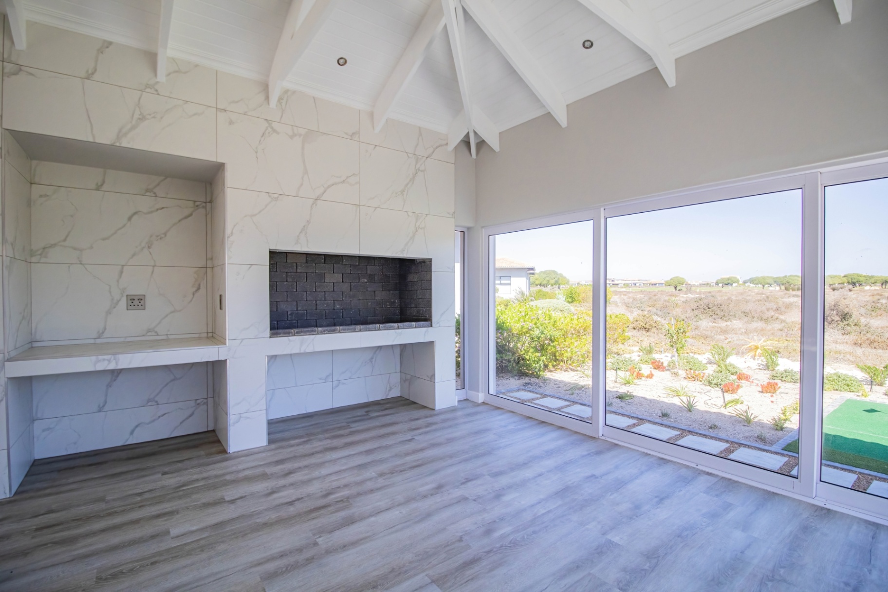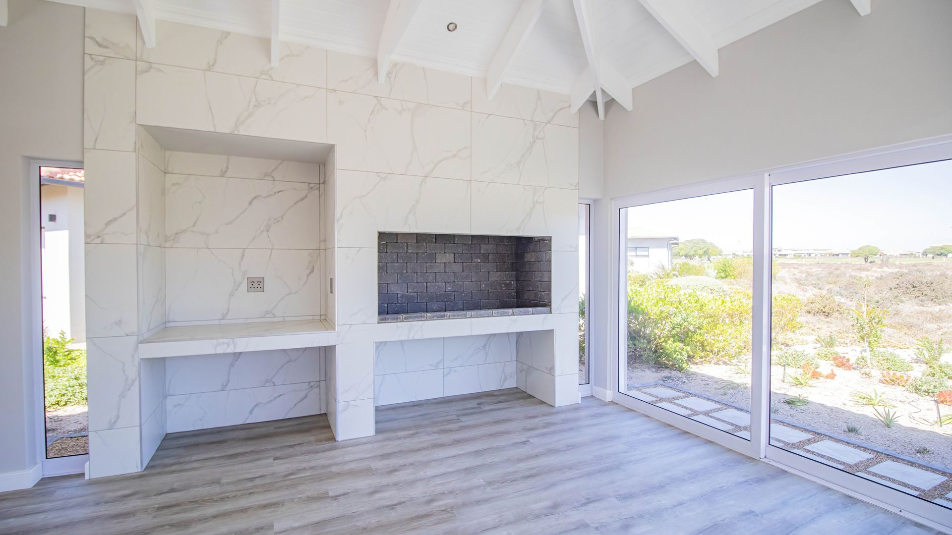 The home is bright and contemporary, featuring open trusses, large windows, and sliding doors that allow for an abundance of natural light throughout.