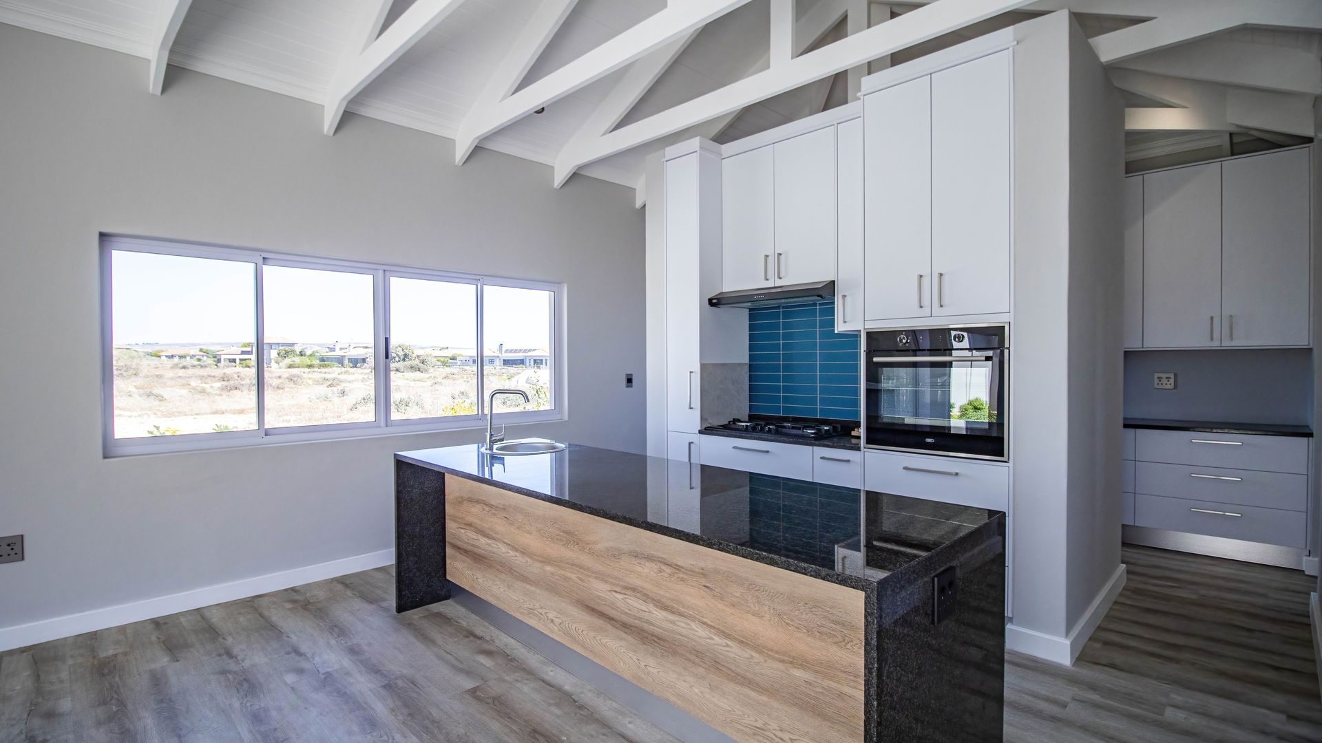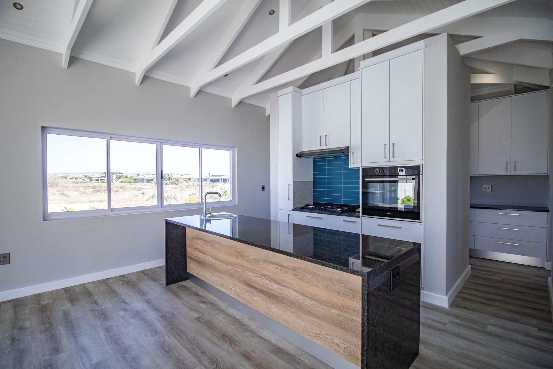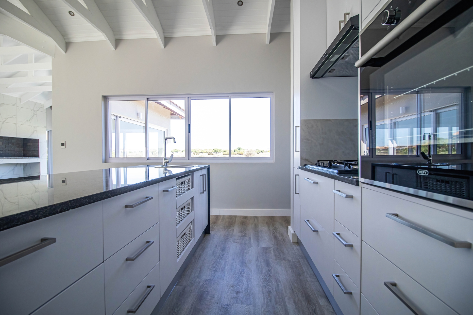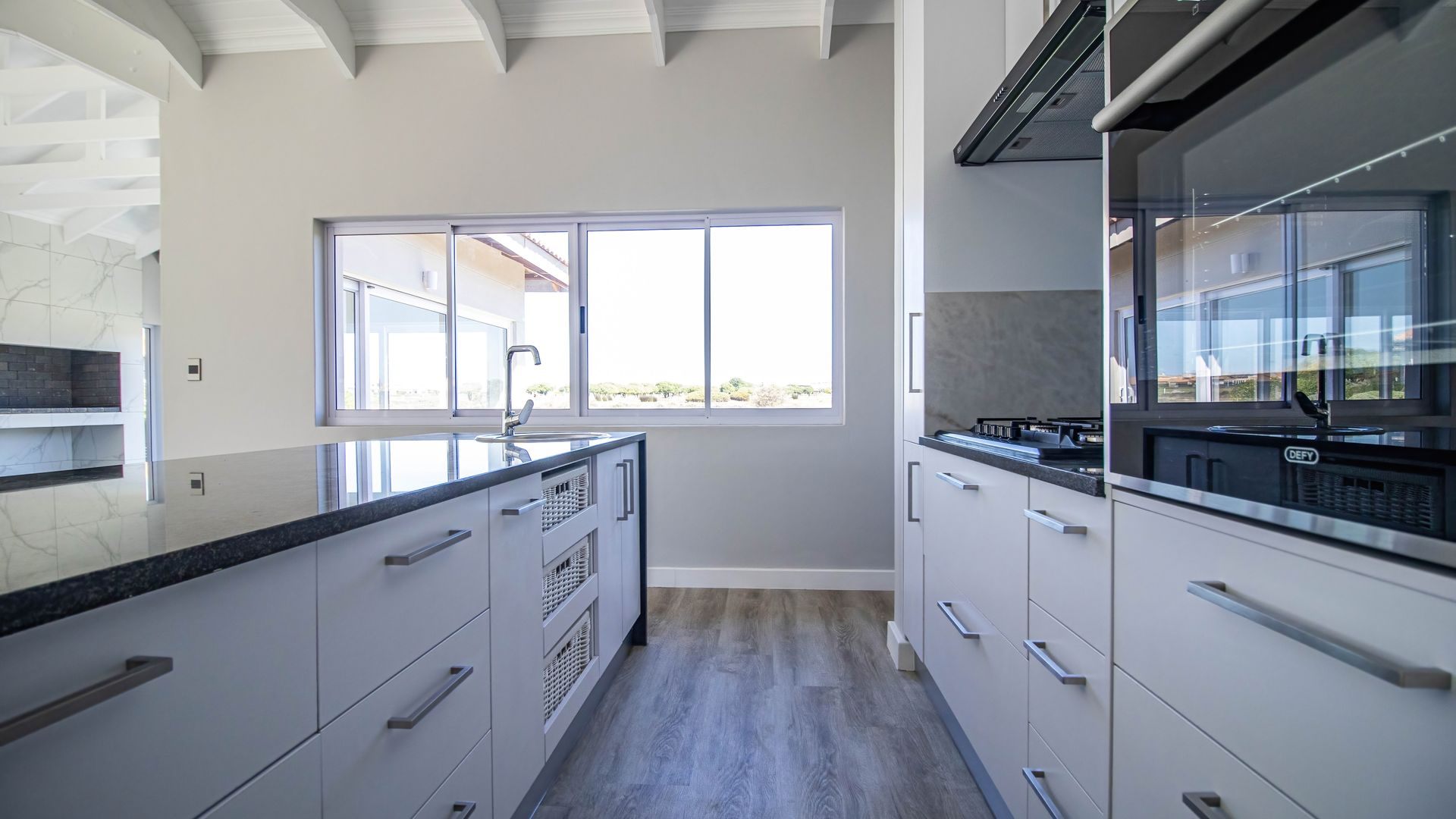 The open-plan kitchen and living area create a seamless flow, perfect for modern living and entertaining. The kitchen is cleverly designed with hidden cupboard space and a separate scullery, keeping everything neat and functional. An indoor braai area enhances the home’s entertainment appeal, while a dedicated home office or study provides the ideal work-from-home solution.