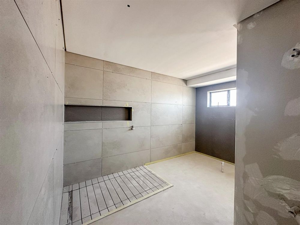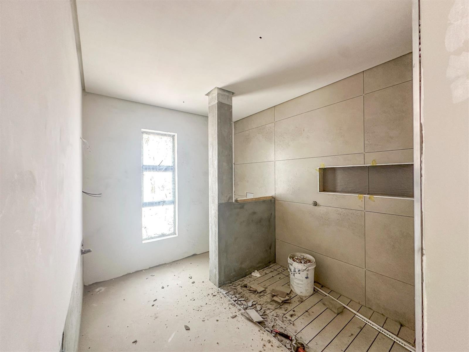 The double-volume entrance foyer welcomes you into an open-plan living space that flows seamlessly between the braai room, dining area, and contemporary kitchen. With top-quality finishes, a gas stove, gas hob, and a separate scullery, the kitchen is both elegant and functional. The ground floor also includes a guest bedroom with an en-suite bathroom, a guest toilet, and easy access to outdoor spaces.