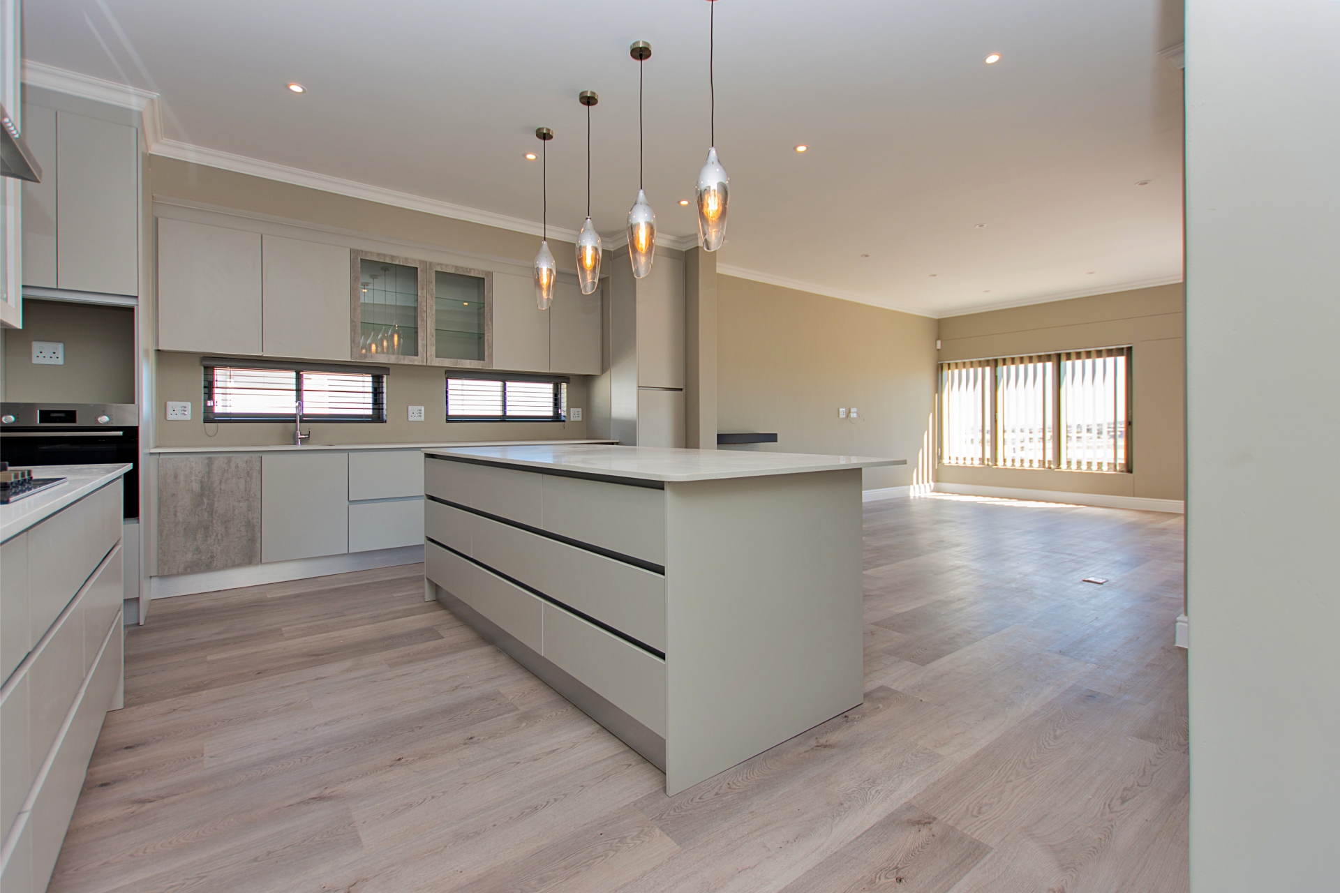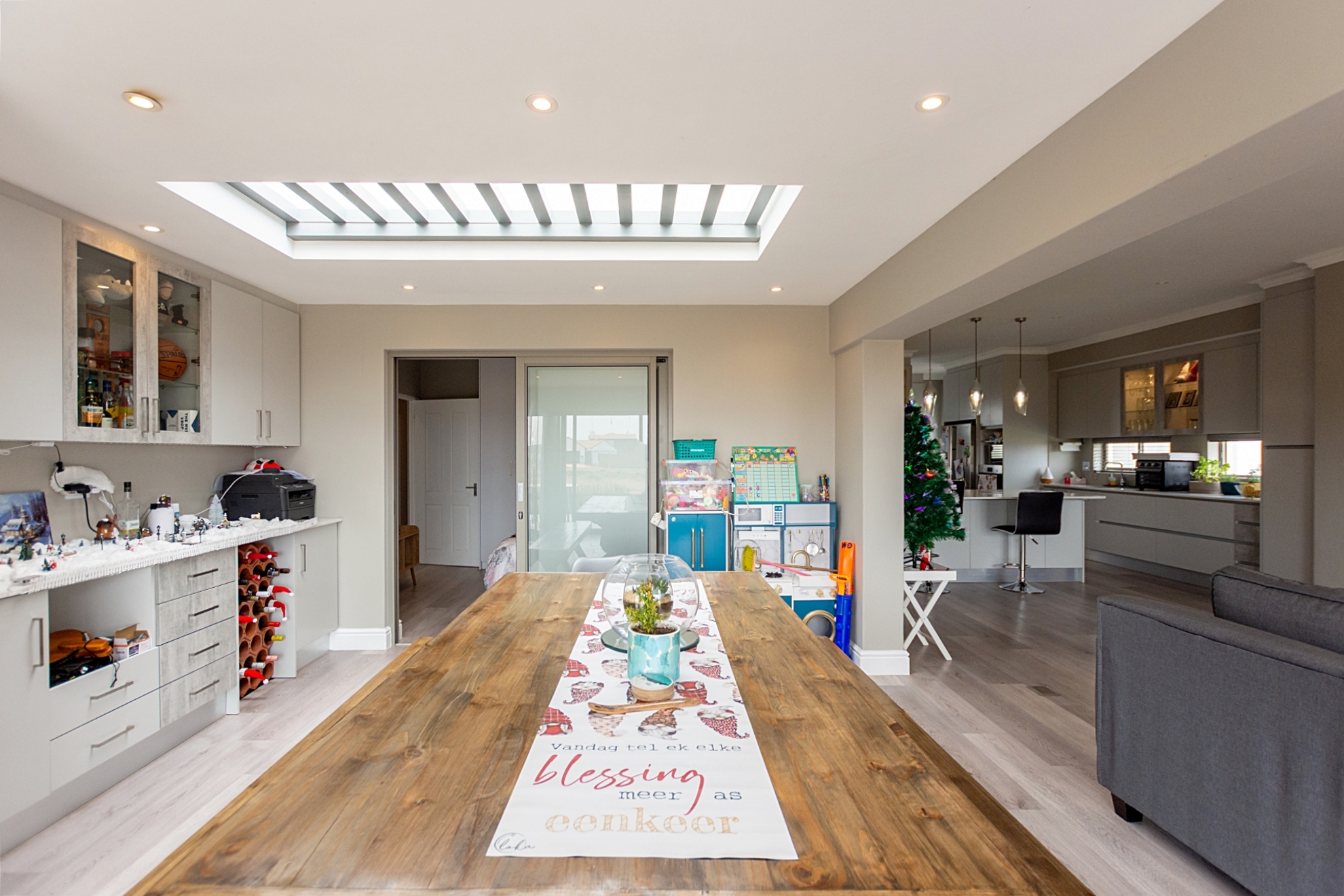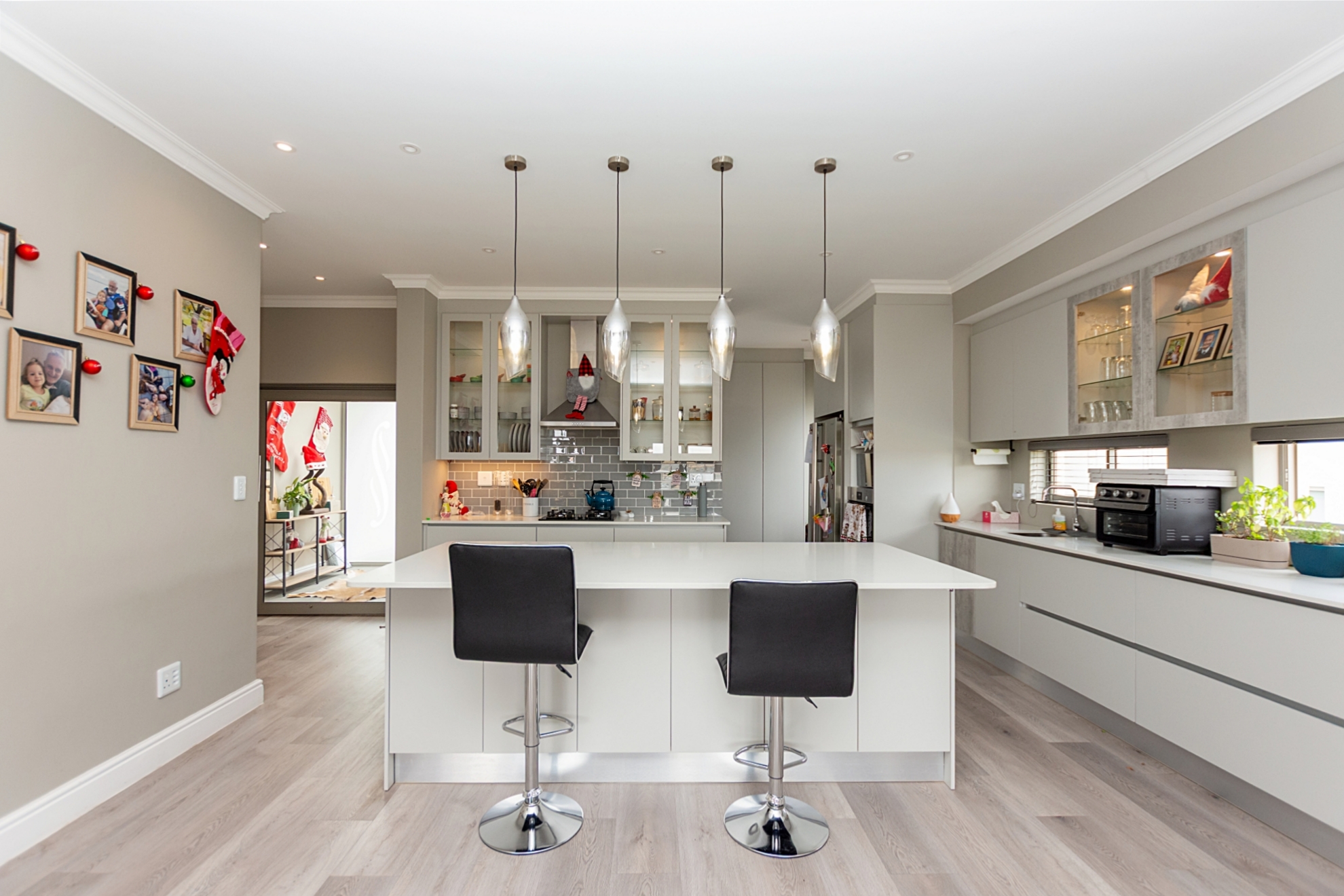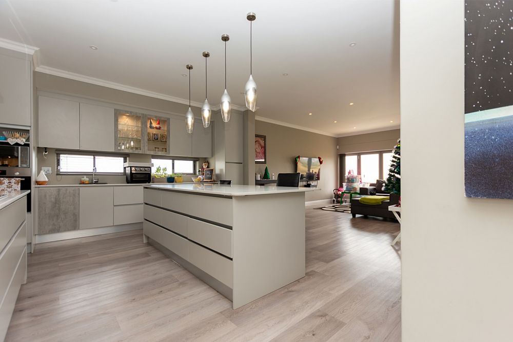 From the moment you enter through the double-volume entrance, bathed in natural light from an overhead skylight, you’re welcomed into a space that feels both expansive and inviting. The open-plan layout seamlessly blends a stylish kitchen with centre island and breakfast seating, flowing effortlessly into the lounge, dining area, and a dedicated scullery and laundry space, designed with practicality in mind.
