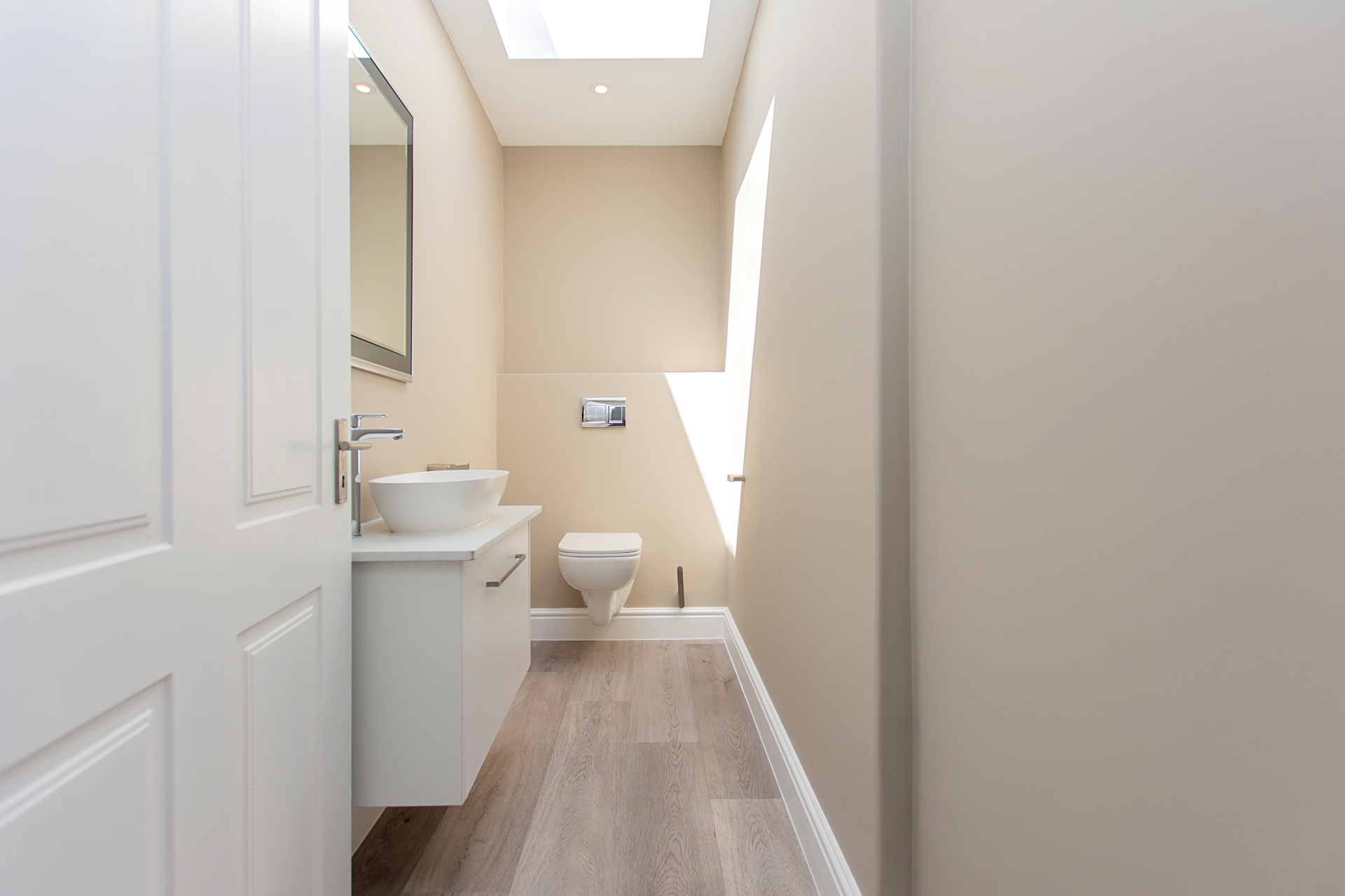 All three bedrooms offer generous built-in cupboards and tranquil ambiance. The master suite is a luxurious retreat with a full en-suite bathroom and private deck access. The two additional bedrooms share a beautifully appointed family bathroom, while a stylish guest powder room with its own skylight adds a refined touch.