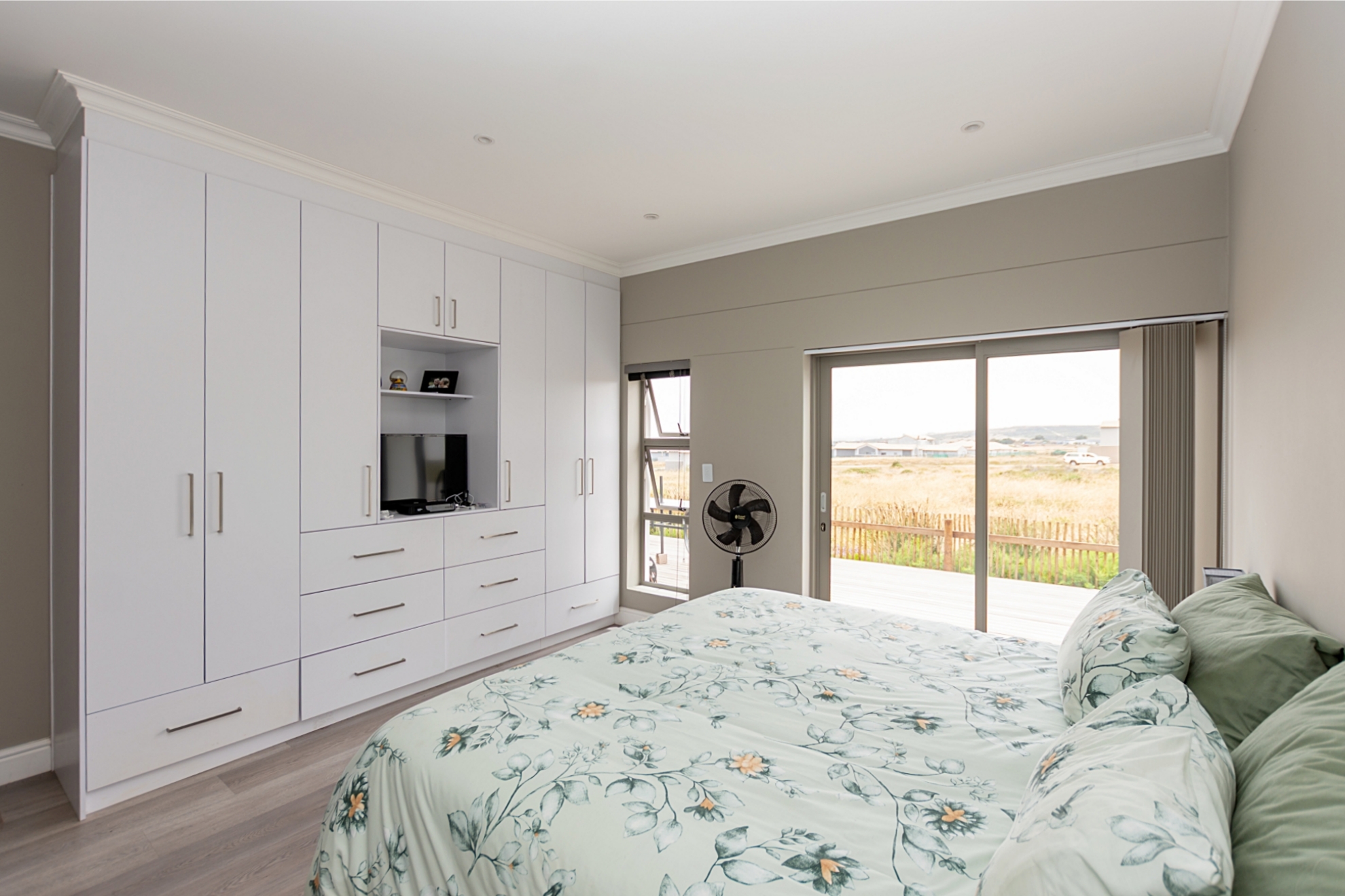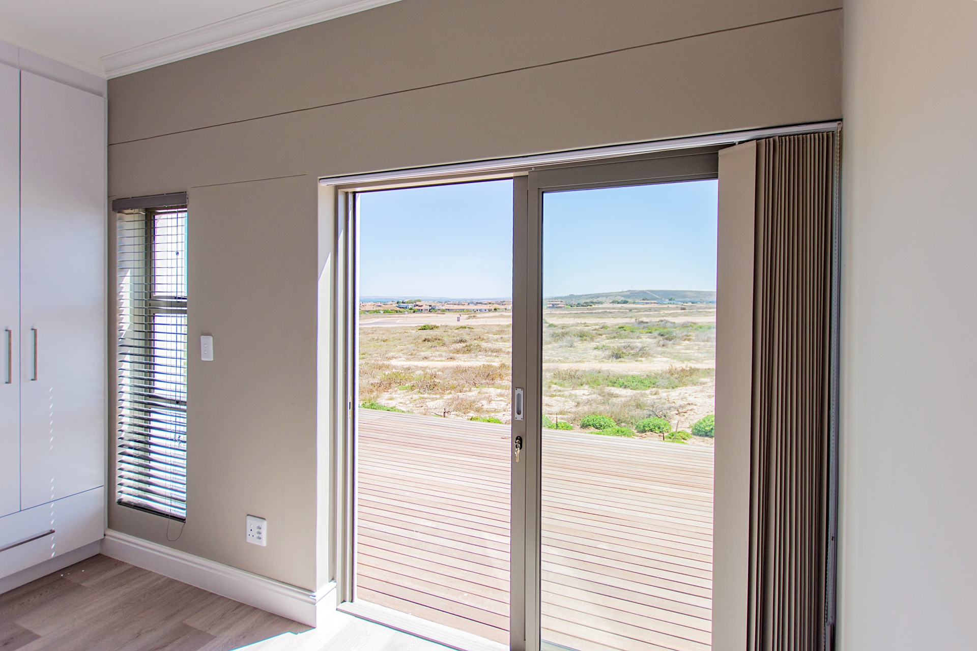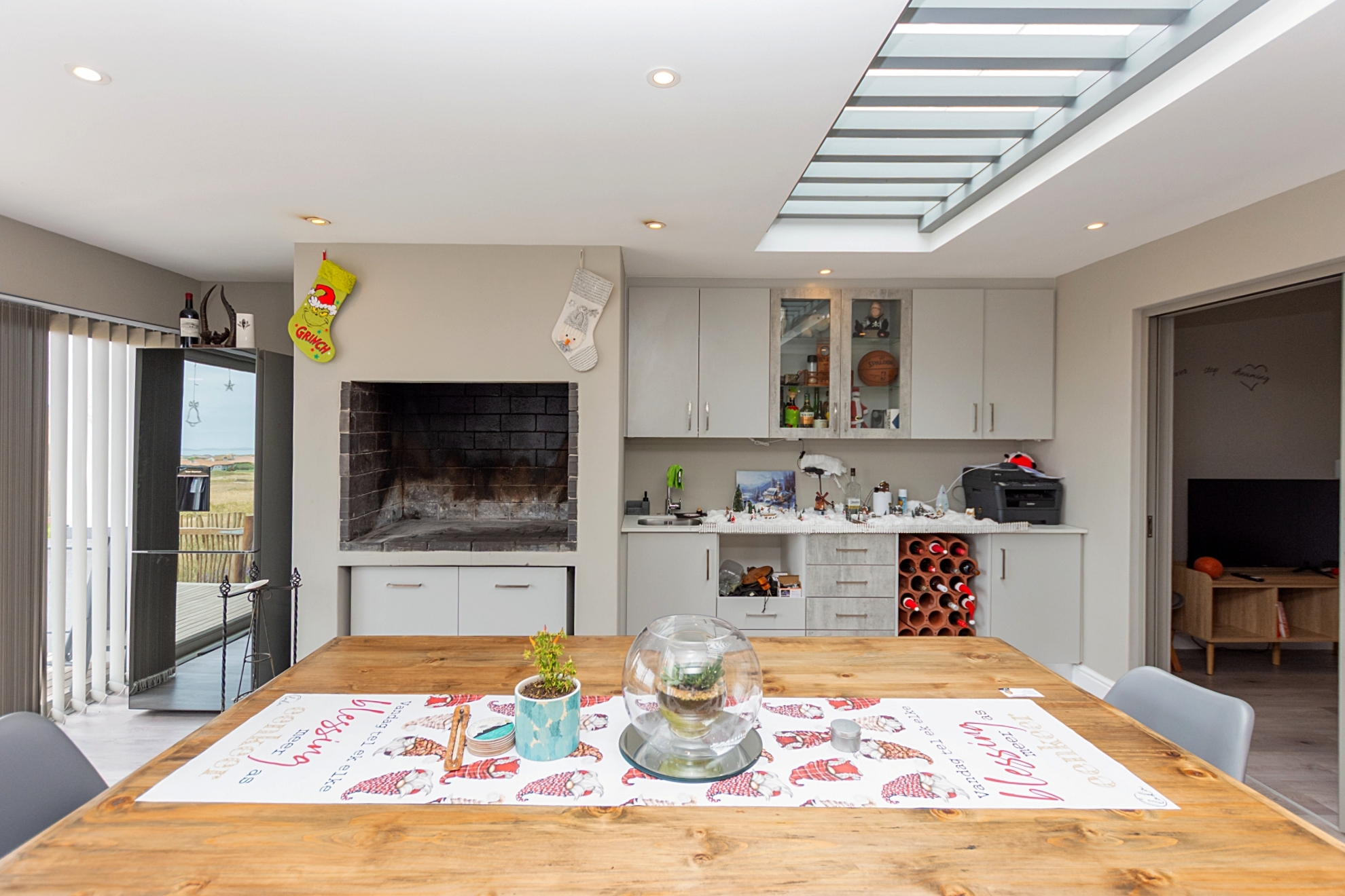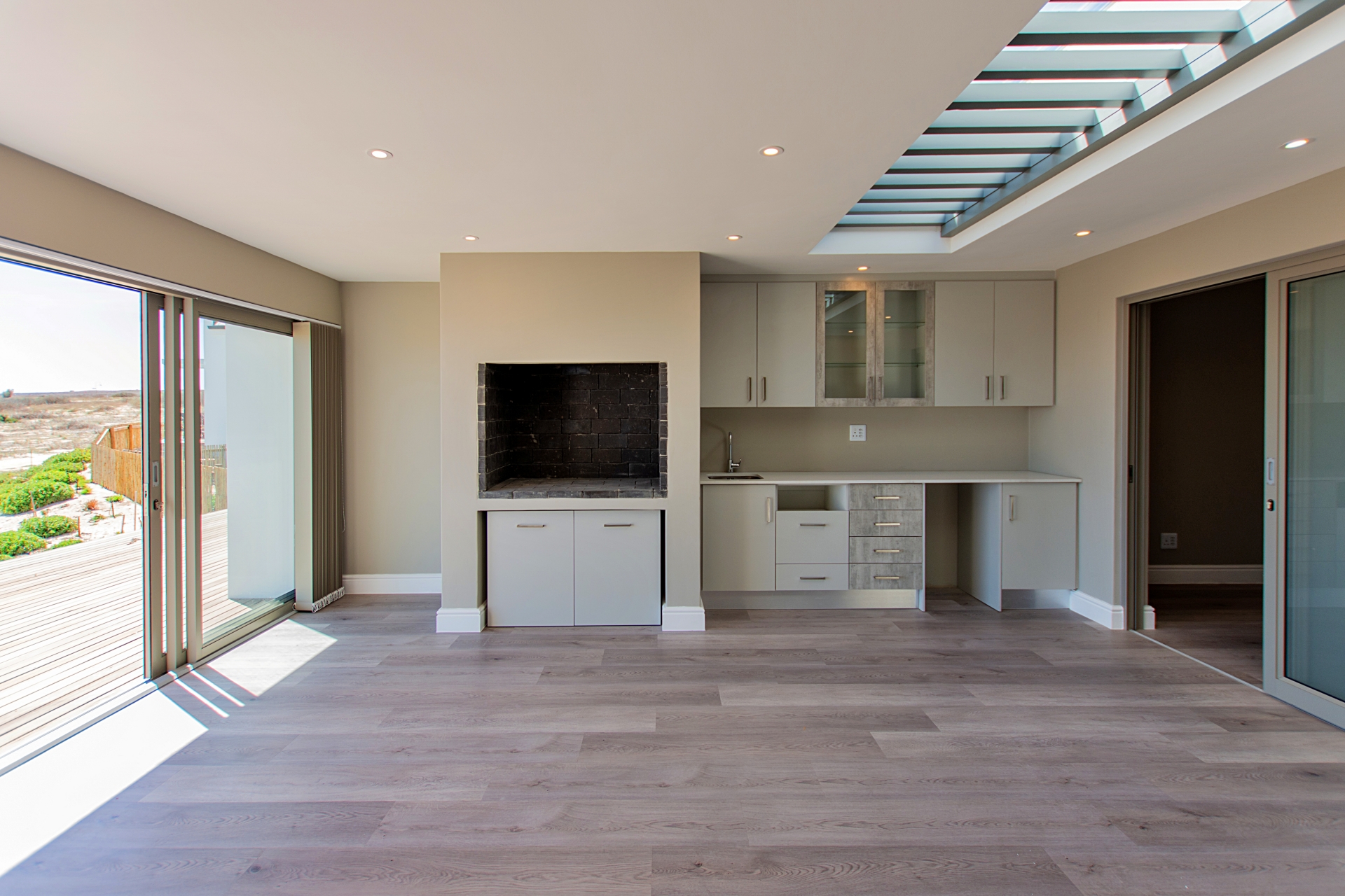 Whether you’re relaxing beside the modern gas fireplace in the lounge, gathering friends for a meal in the dining area, or entertaining at the built-in braai and wet bar, this home is made for creating unforgettable memories. Stacking doors open onto a large wooden deck, accessible from both the entertainment area and the main bedroom, offering the perfect indoor-outdoor flow for enjoying Langebaan’s beautiful weather.