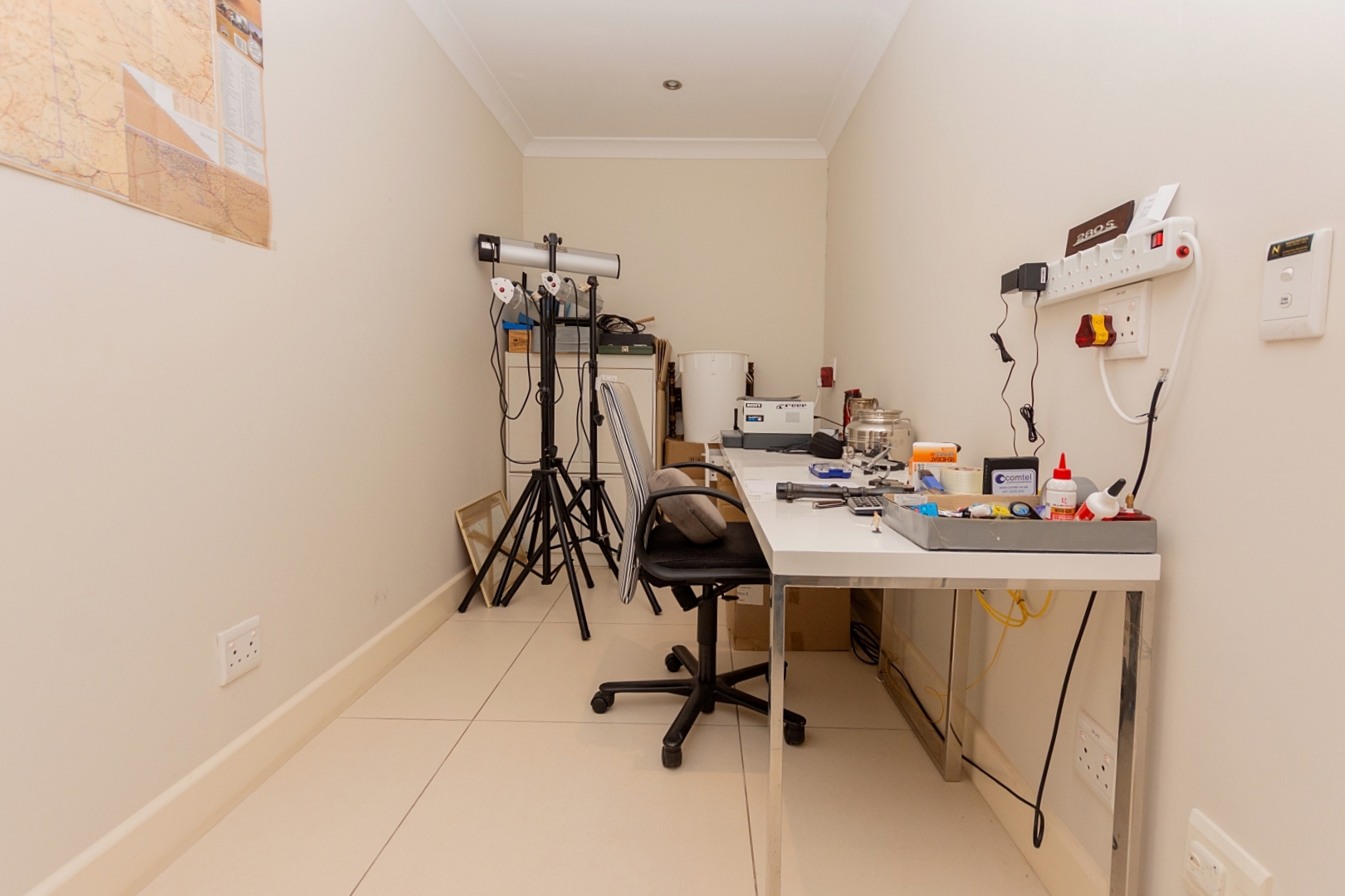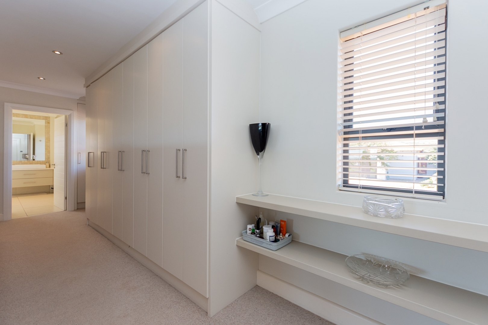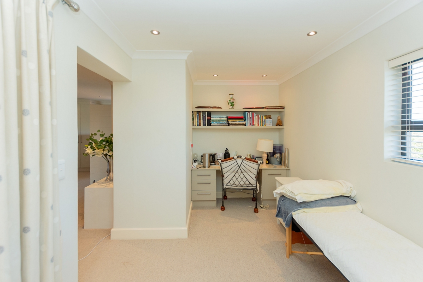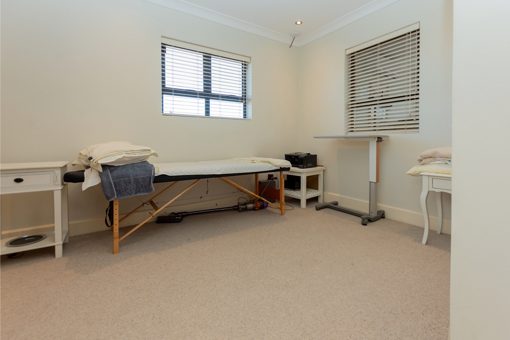 The ground floor also includes two generously sized bedrooms, both with garden access and built-in cupboards. These rooms are serviced by two sleek full bathrooms. With multiple flexible spaces, including a separate study, walk-in linen room, and even a built-in wine rack below the staircase with a chair lift, the home easily caters to the needs of families or those who love to host.