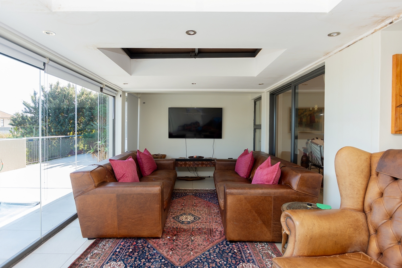 A sunny second lounge or sunroom, framed by glass, opens onto an enclosed garden and sparkling pool, with beautiful lagoon and fairway views, offering a year-round space for relaxation. The wind-protected braai veranda is perfect for stylish outdoor gatherings, no matter the season.