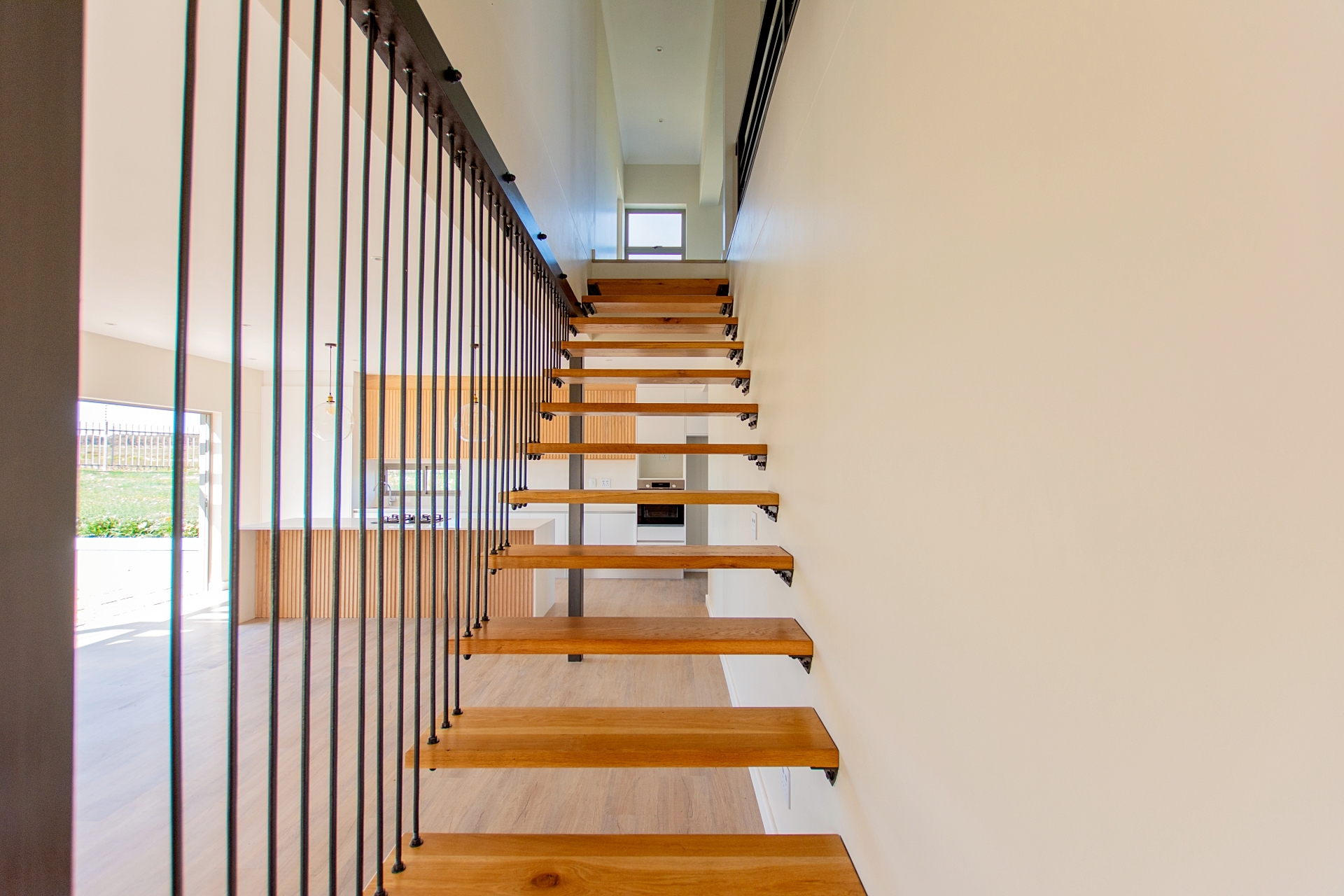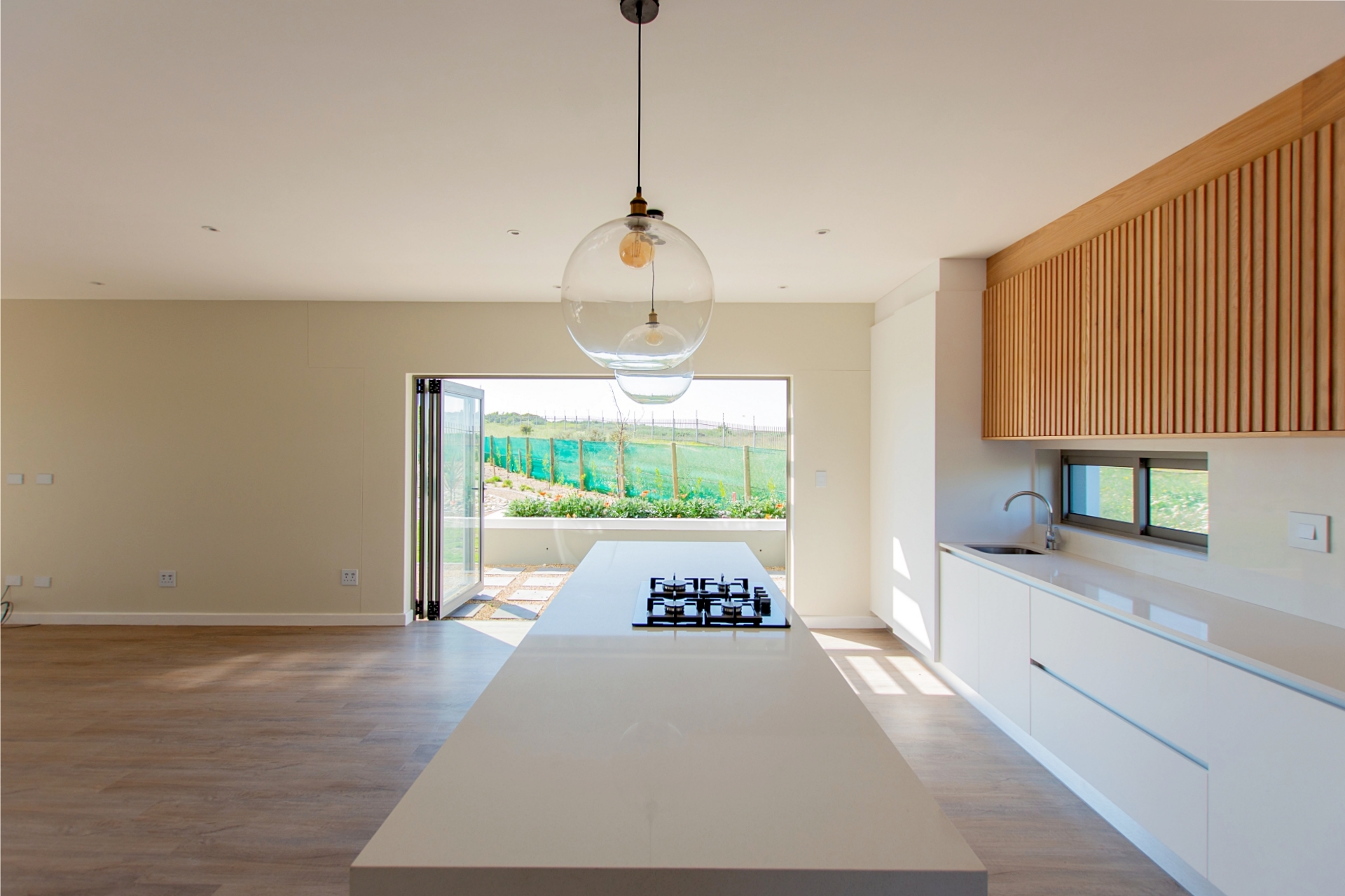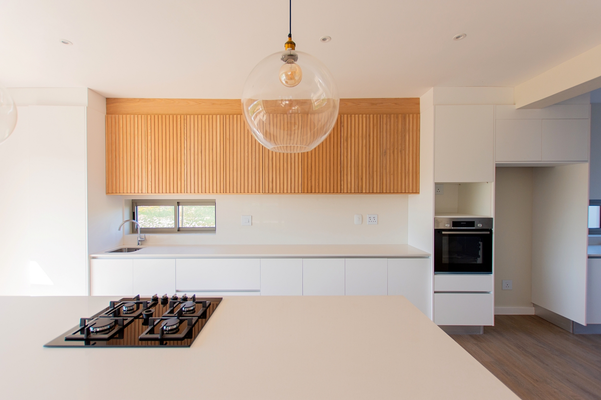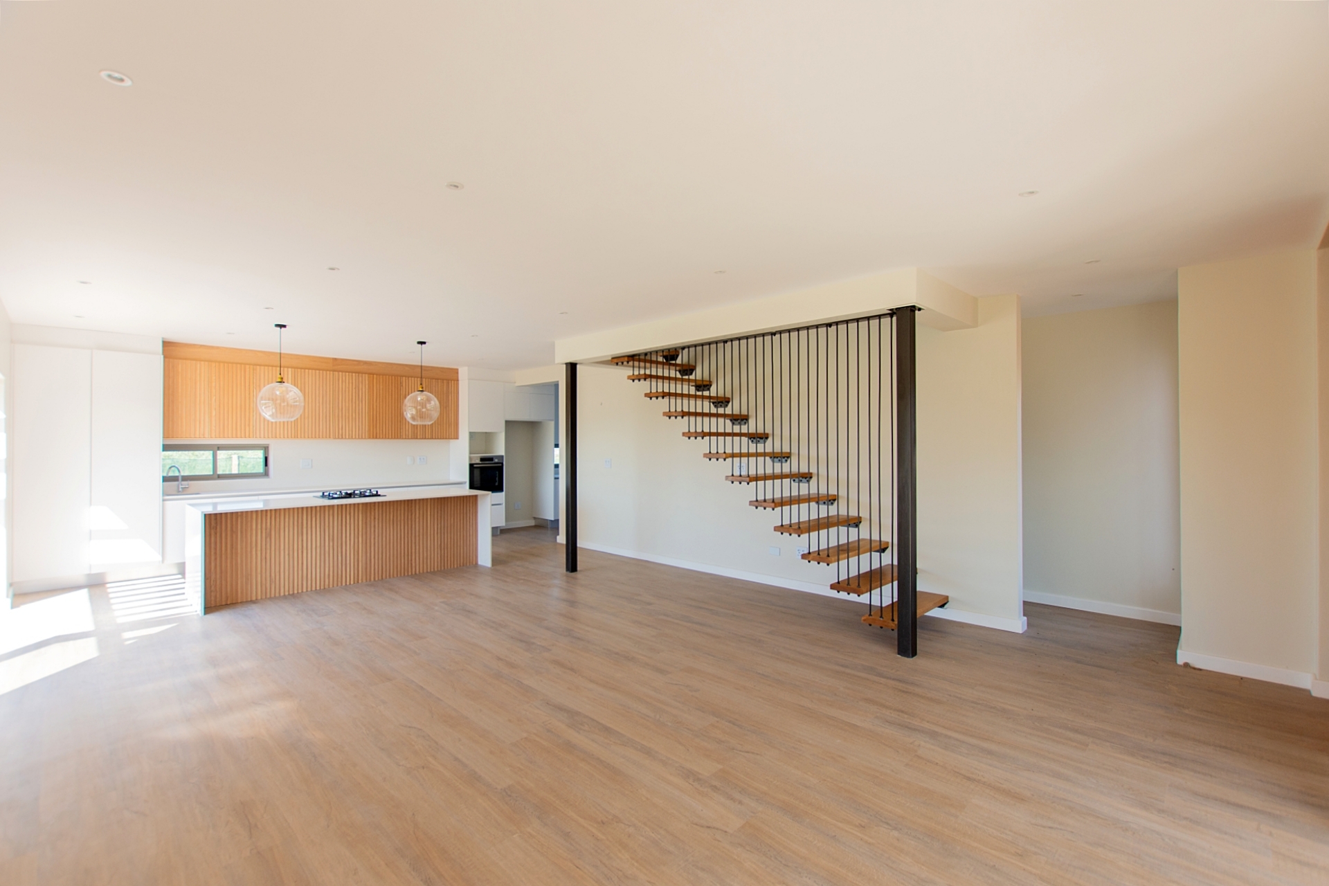 From the moment you enter, the light-filled open-plan layout creates an immediate sense of space and flow. The kitchen, dining, and lounge areas connect well, making everyday living and entertaining effortless. The kitchen is thoughtfully designed with a Caesarstone centre island incorporating a gas hob, eye-level oven, and bespoke soft-close cabinetry. A separate scullery keeps the main living space uncluttered, while a guest cloakroom adds practical convenience.