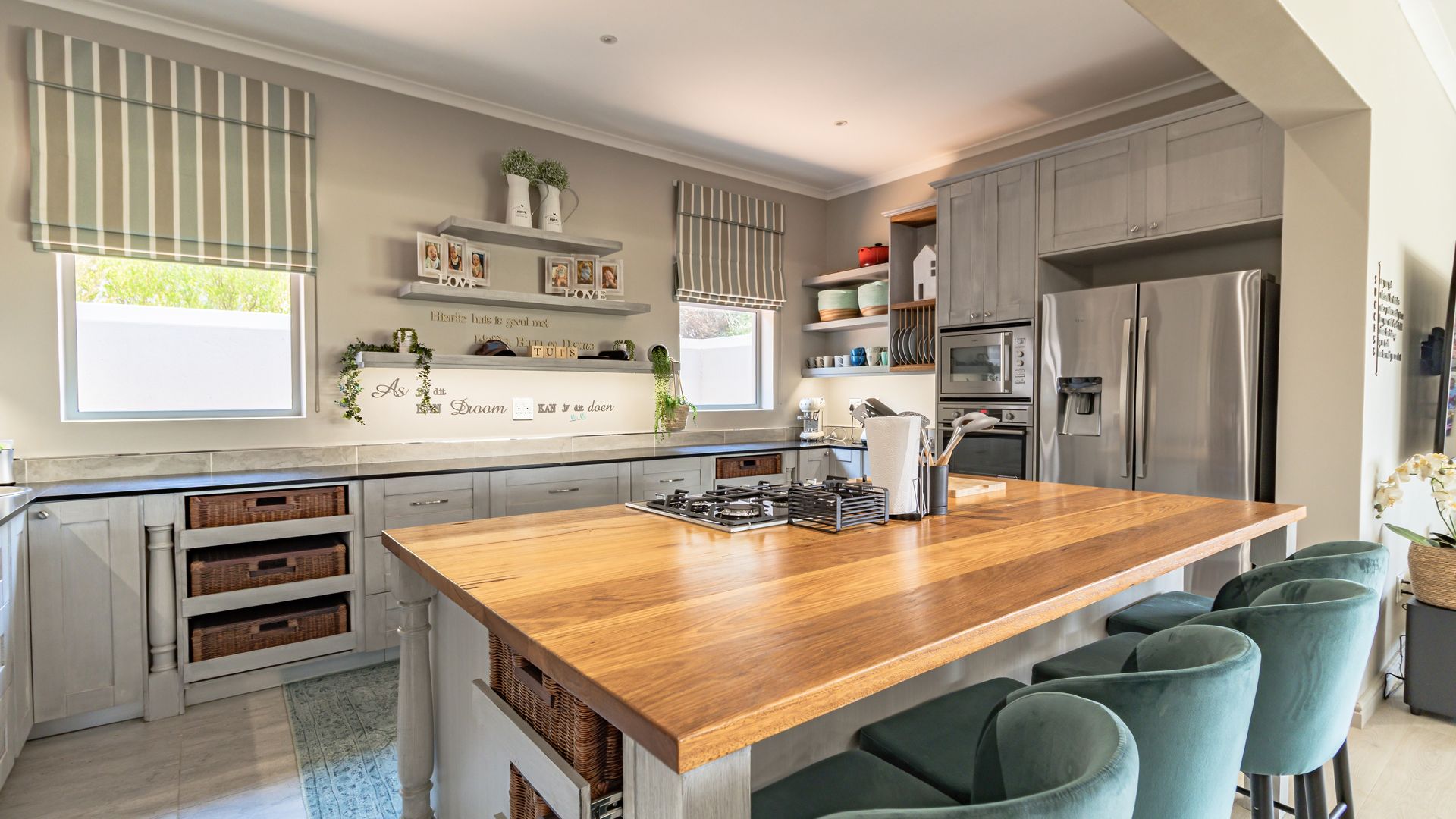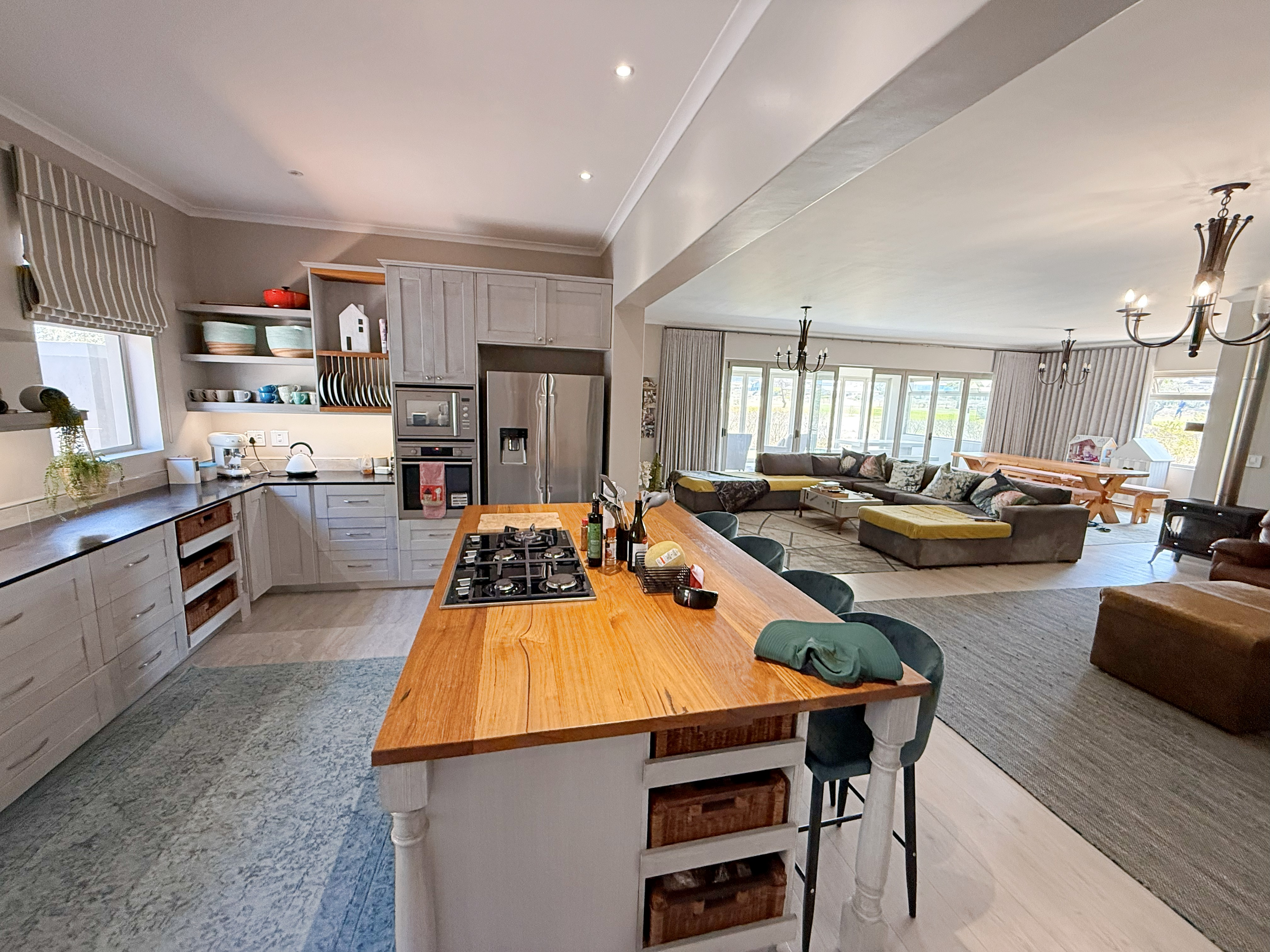 The open-plan kitchen is both functional and refined, featuring a statement island with Australian chestnut countertop, double ovens, generous workspace, a walk-in pantry, and scullery. Direct access leads to an extra-large double garage with golf cart space, dedicated work areas, plus a separate golf cart garage, ideal for estate living.