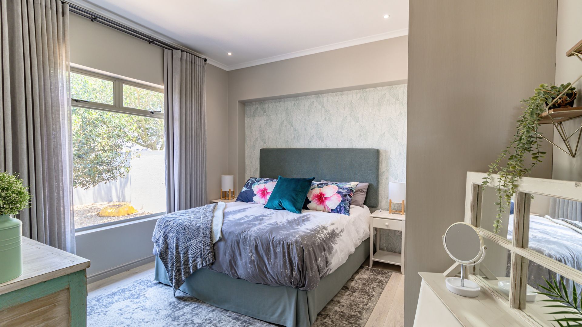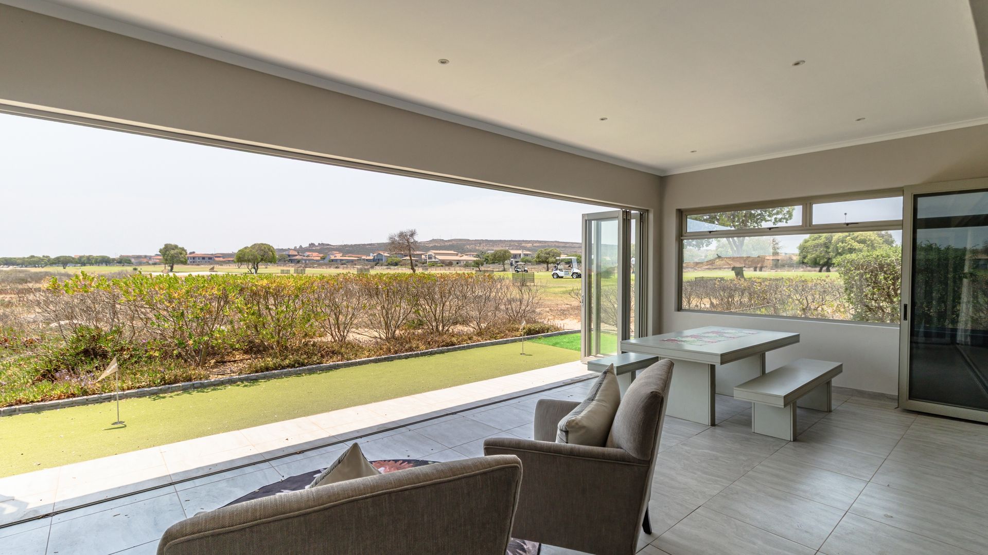 A double-door courtyard entrance leads into spacious open-plan living areas, beautifully framed by large picture windows and full-length stacker doors opening to an enclosed veranda with built-in braai. The outlook over the green creates a seamless indoor-outdoor connection, perfect for relaxed living and entertaining.