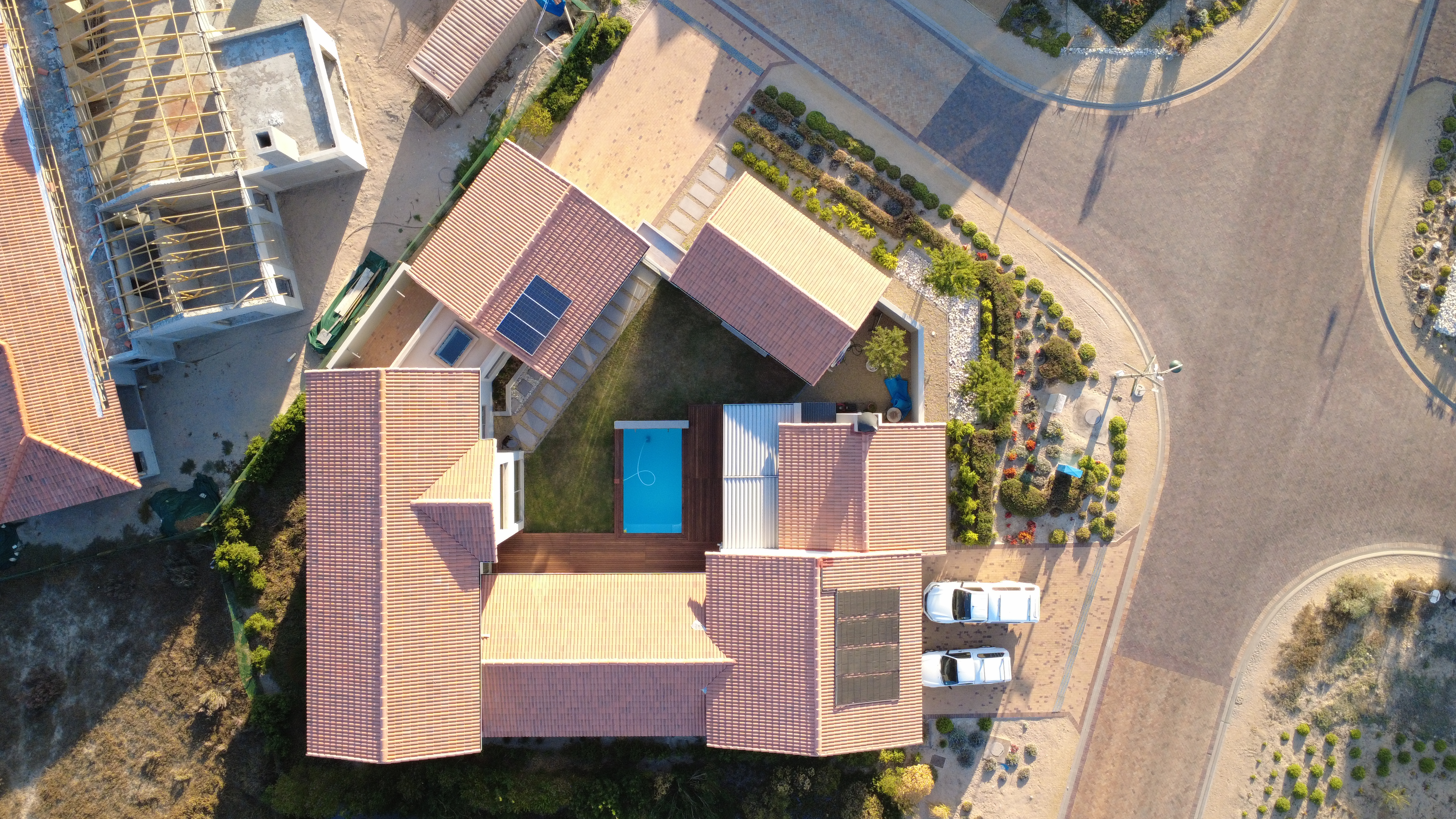 Practical features further enhance the appeal. The corner position allows for generous paved driveways and parking for up to four vehicles. In addition to the double garage, a high-volume garage with extra-height automated doors comfortably accommodates a boat, caravan or larger vehicles, a rare and valuable asset within the estate.