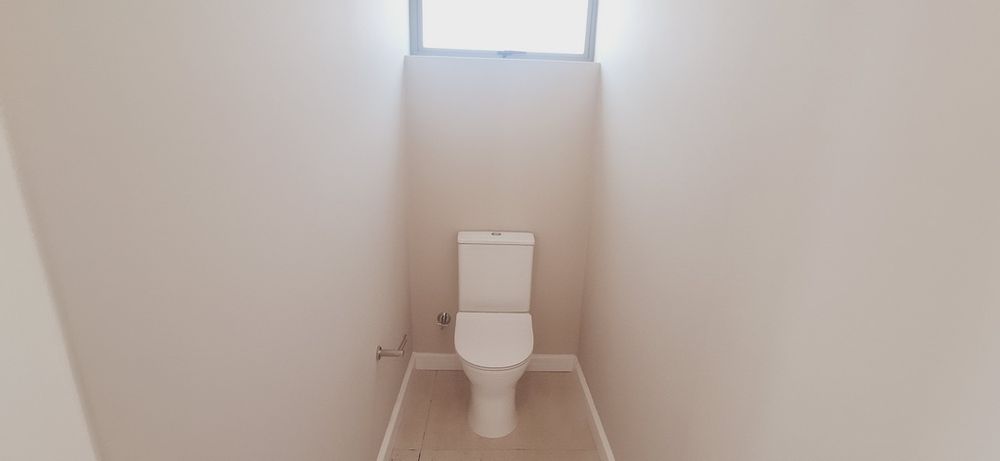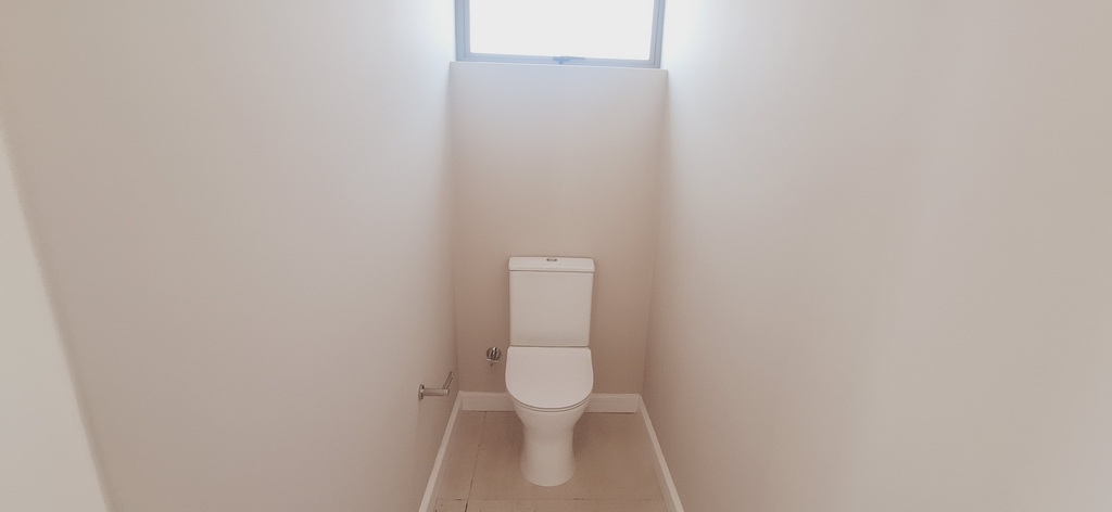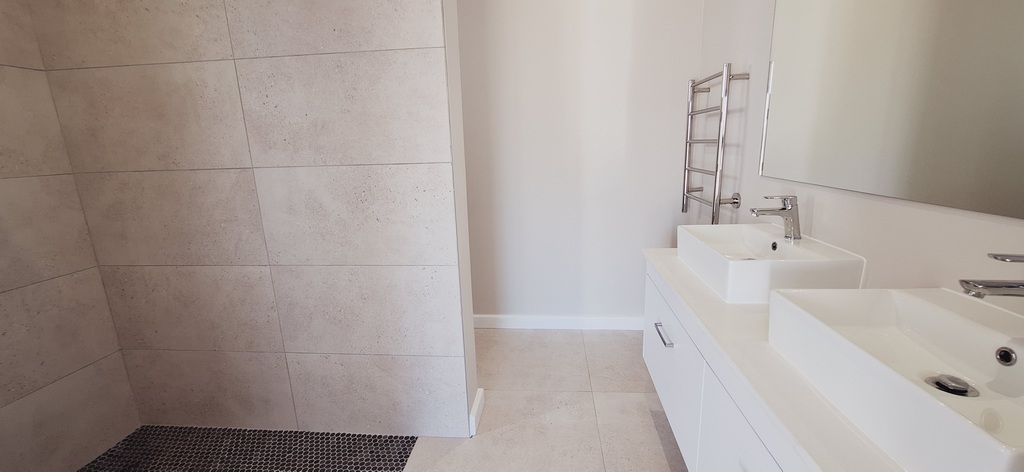 The luxurious main bedroom, features a modern en-suite bathroom with double basins, a shower, and a private toilet. Sliding doors open directly to the beautifully landscaped garden, creating a serene retreat.