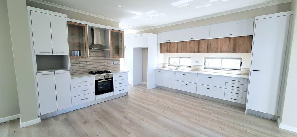 The spacious living and dining areas flow seamlessly to the outdoor entertainment patio featuring a built-in braai, ideal for gatherings or into the beautifully designed kitchen.