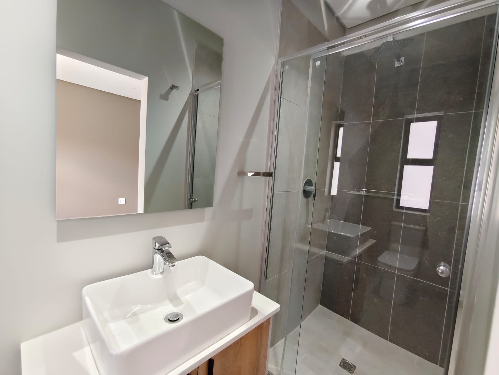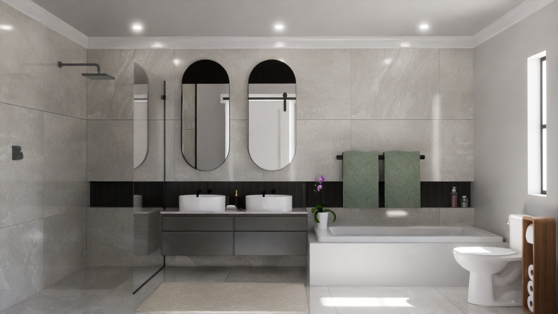 Tiled bathrooms with shower, basin and toilet or full bathroom with shower, bath and double basin and toilet