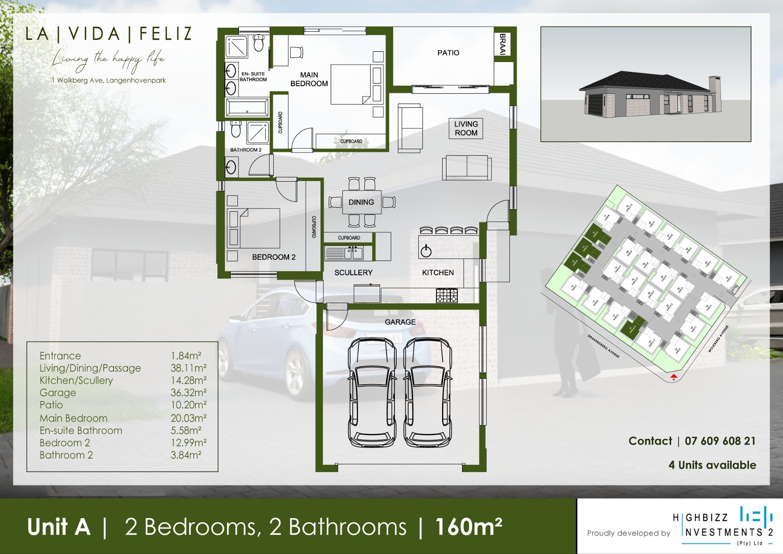 New development in Langenhovenpark/Spitskop - LA VIDA FELIZ - Living the happy life, from the developers of La Vida Pico. Modern Luxury Living Single storey townhouse. These units are modern, spacious, open plan layouts fitted with a complete gas hob and gas stove. Units erf size with gardens differs, it depends on the site layout and where the unit is situated. Mid-section units are perfect for lock-up and go, investment options for rental income or low-maintenance living. The townhouses are built with excellent workmanship and positioned in a prime sought-after location. NO Transfer Cost Unit A - 2 Bed, 2 Bath - Prices starting from R1,910,000 (Prices vary by unit) | Rates approx. R1583 | Levy R850 Unit B - 2 Bed, 2 Bath - Prices starting from R2,030,000 (Prices vary by unit) | Rates approx. R1620 | Levy R850 Unit C - 3 Bed, 2 Bath - Prices starting from R2,300,000 (Prices vary by unit) | Rates approx. R1855 | Levy R850 Unit D - 3 Bed, 2.5 Bath - Prices starting from R2,420,000 (Prices vary by unit) | Rates approx. R1955 | Levy R850 All the units boast ultra-modern finishing and renowned architecture - Simplicity, Style and Sophistication! KEY FEATURES: - Single Storey, freestanding units. - Spacious living and ultra-modern interior. - Sizes may vary (approximate sizes indicated on listing). - Monthly rates and taxes and levies may vary slightly (new development) - Appealing, durable exterior finishes. - All units have double automated garages and an additional dedicated guest parking. - Attractive extras and finishing to choose from. - Electric fence and controlled access. ONLY 26 units - Limited units available. Contact me for more information and secure your new HOME.