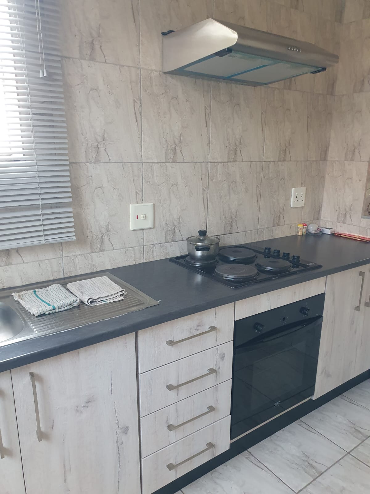 The entire unit is tiled and blinds on all the windows.