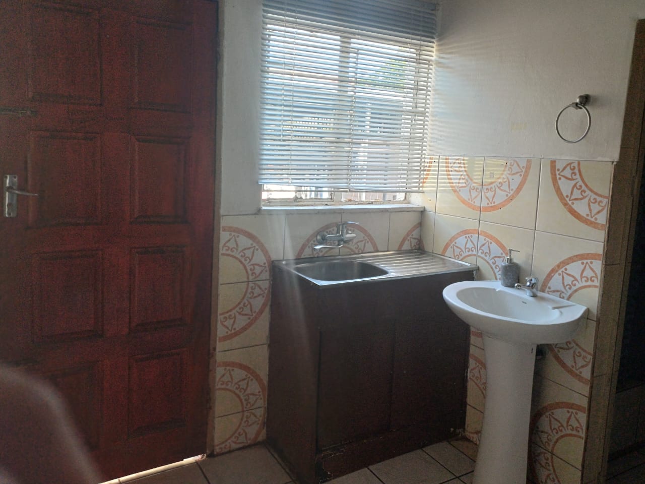 Guest bathroom conveniently located and stylishly tiled.
