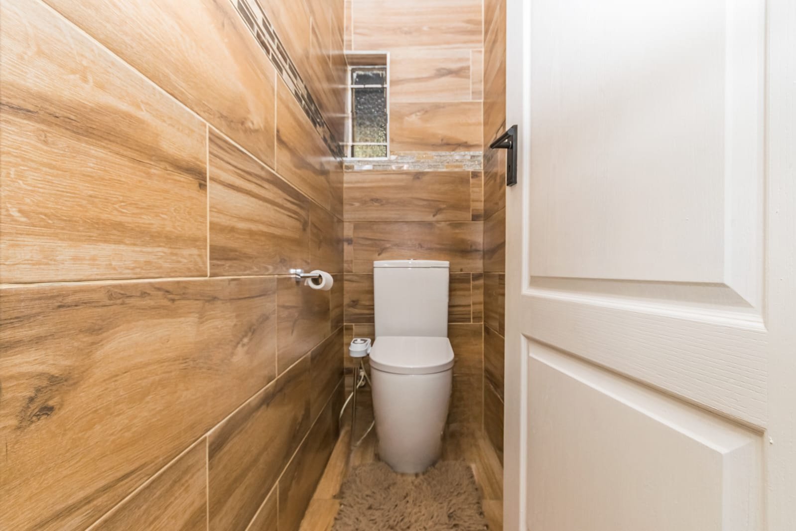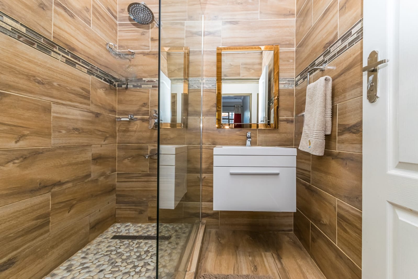 Modern full bathroom fully tiled with sleek, contemporary finishes.